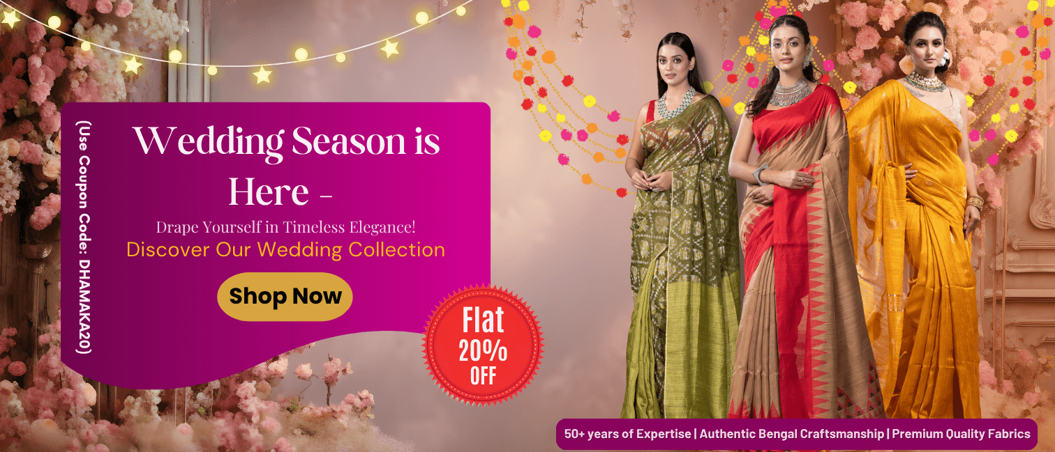 There are many different types of sarees: linen sarees, pure linen sarees, muslin sarees, muslin silk sarees, matka silk sarees, and ghicha sarees – each type has a story to tell all of its own. Linen and muslin are both very light and known for their comfort. Matka is known for its rustic elegance, while ghicha is known for its natural glimmer. All of these types of sarees can now be purchased right from home with a simple click.