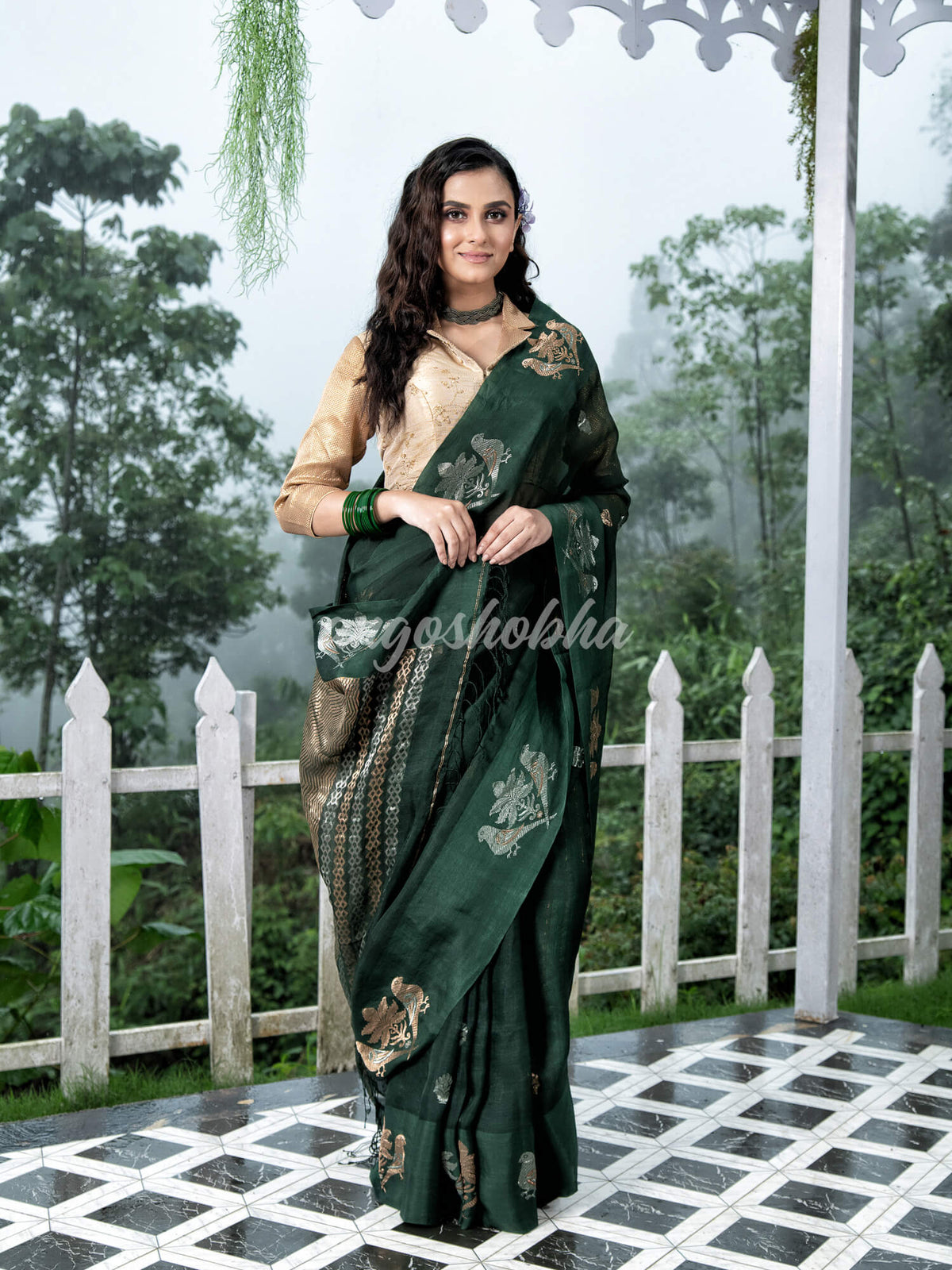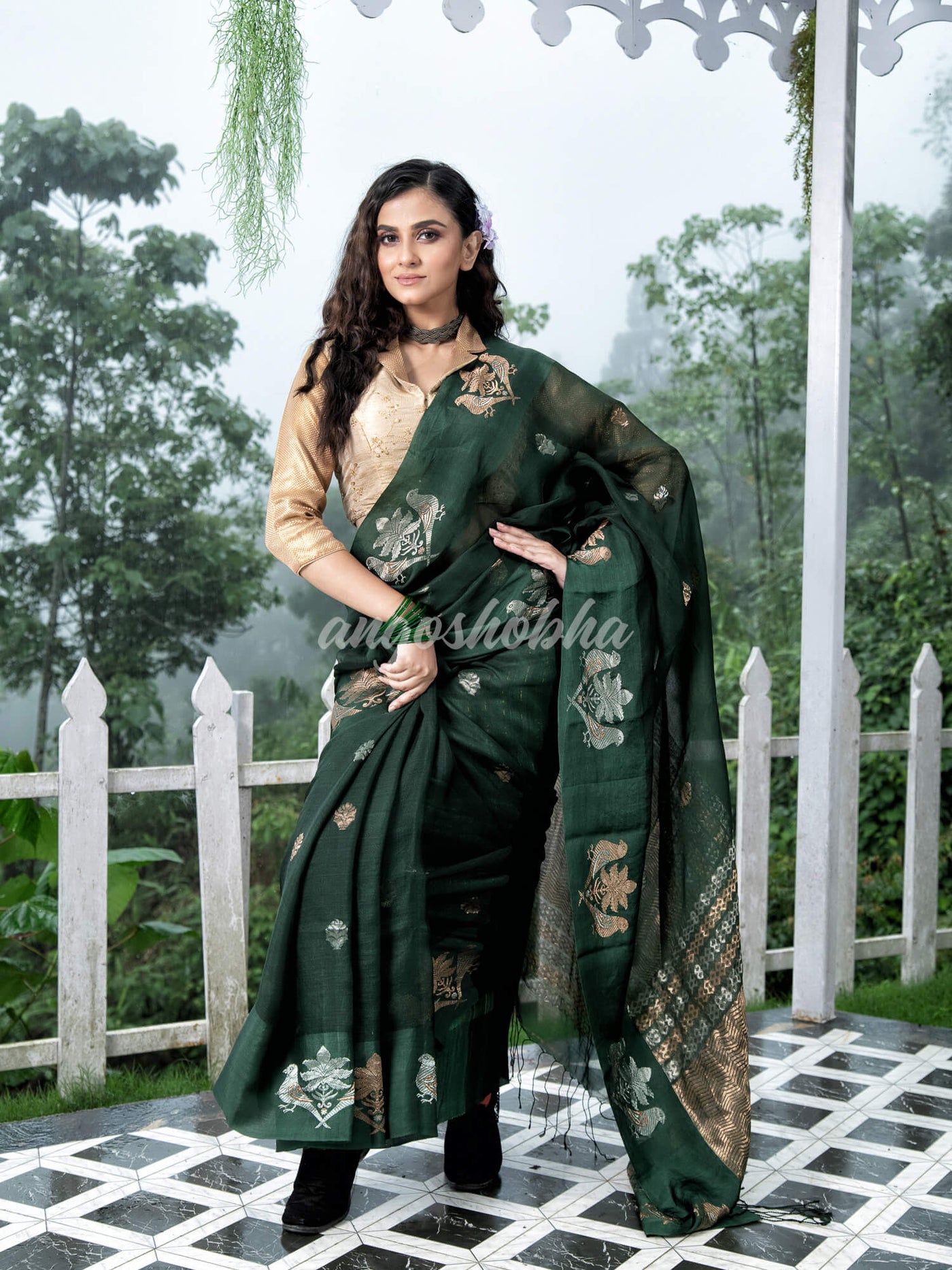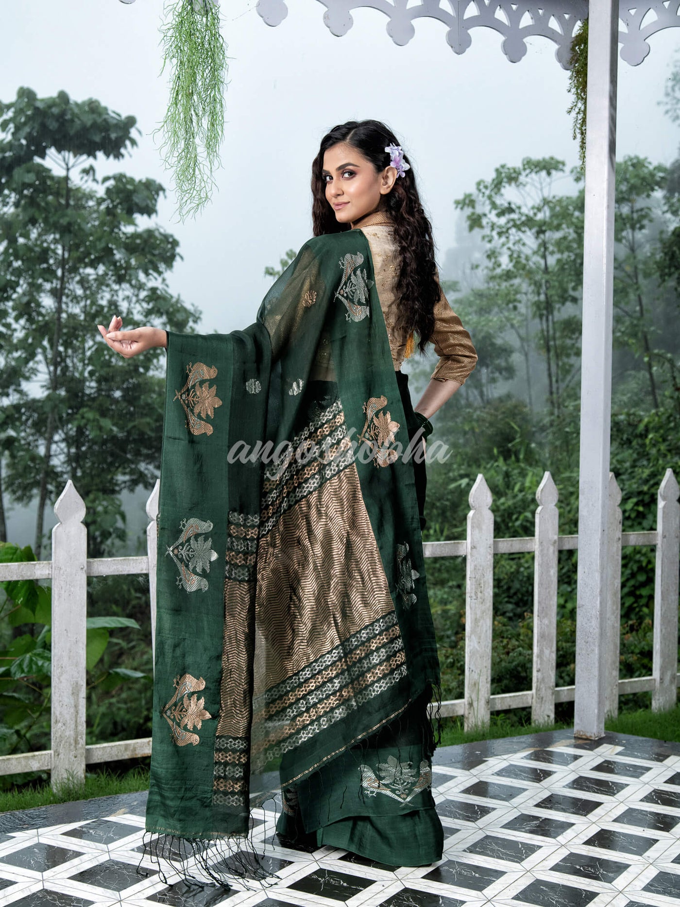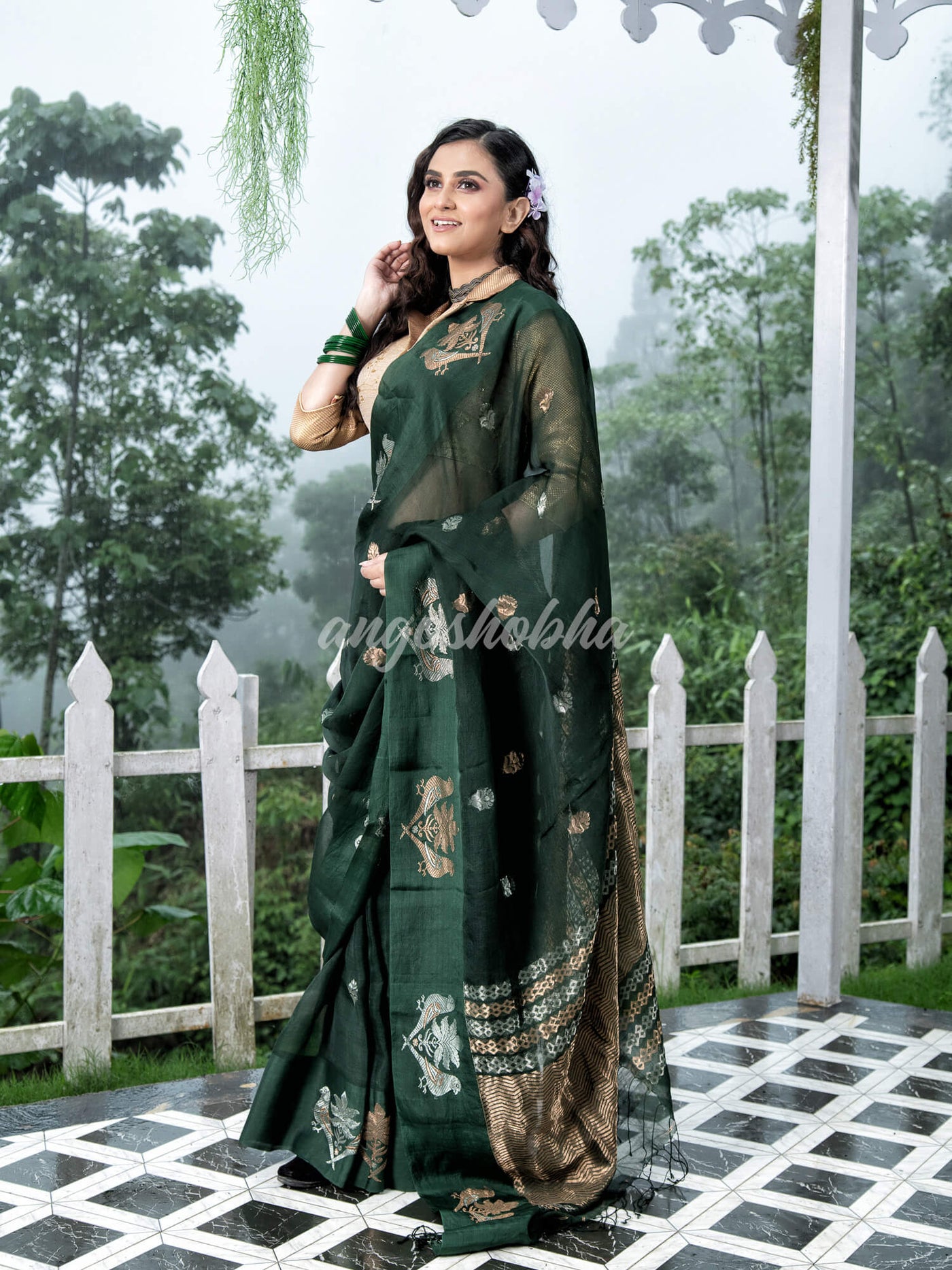 Moss Green Pure Muslin Intricate Bird Design Border Handwoven Saree