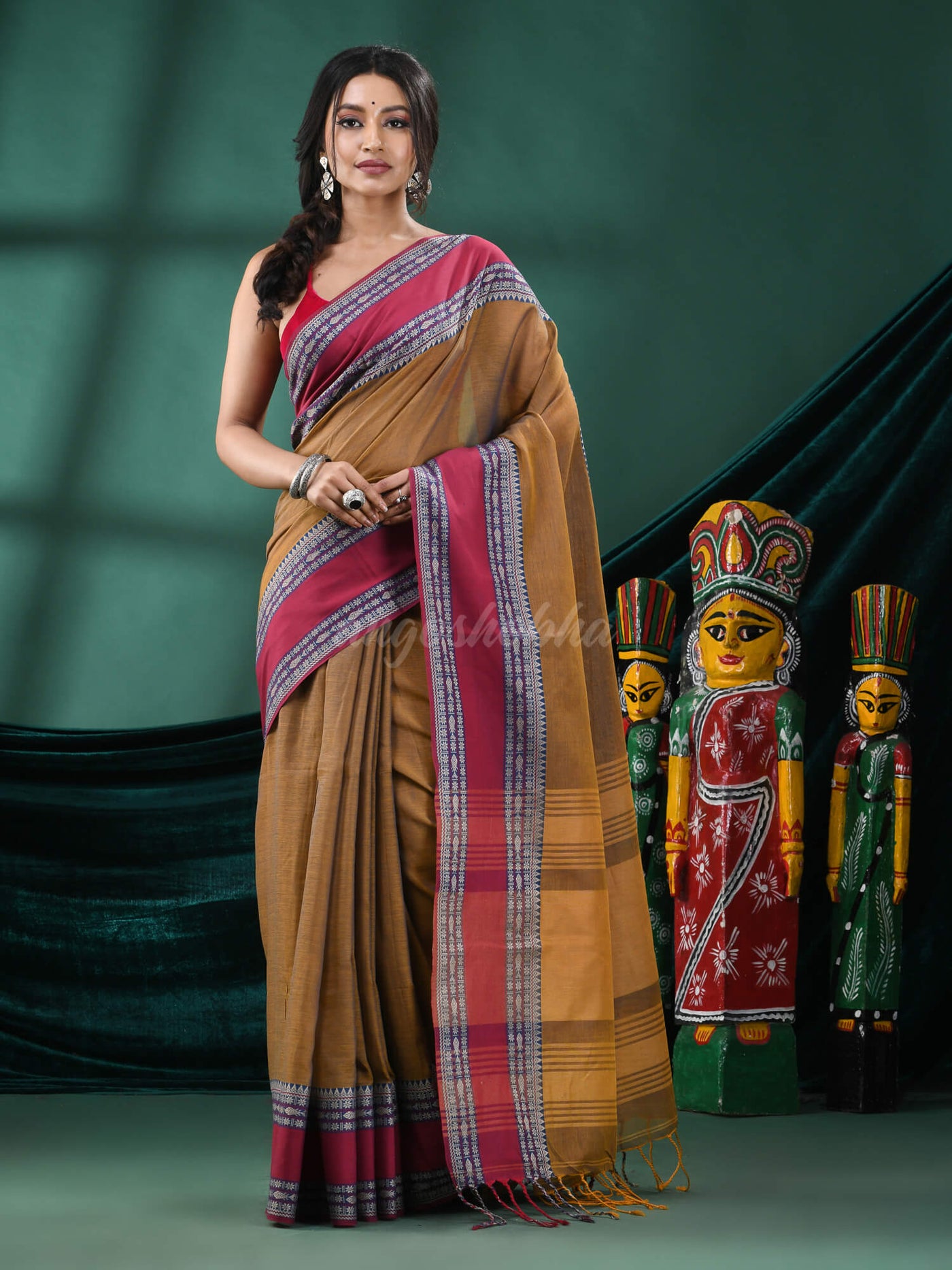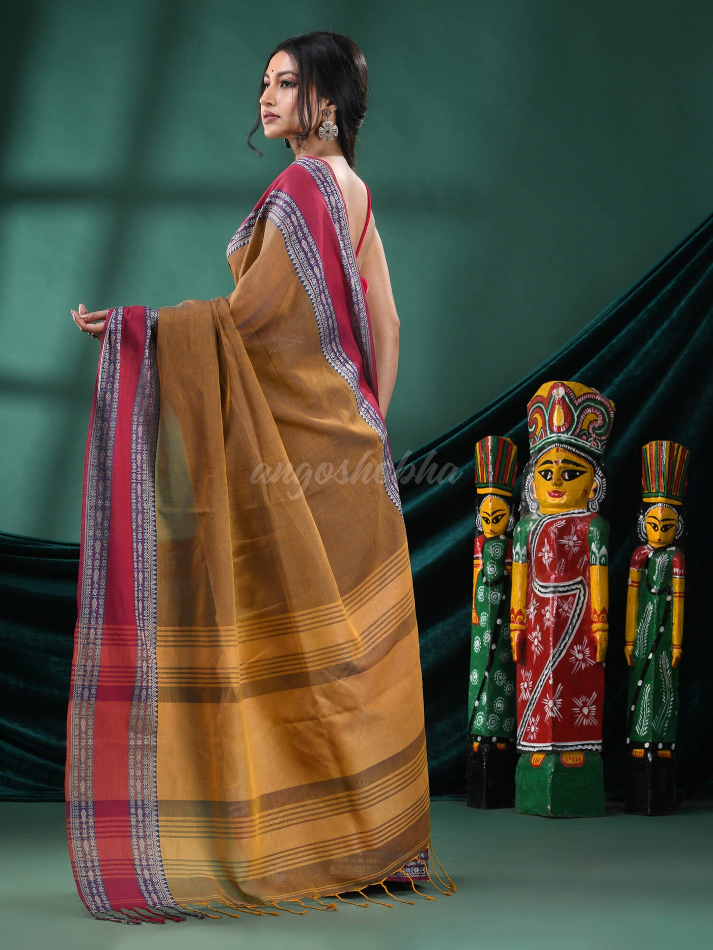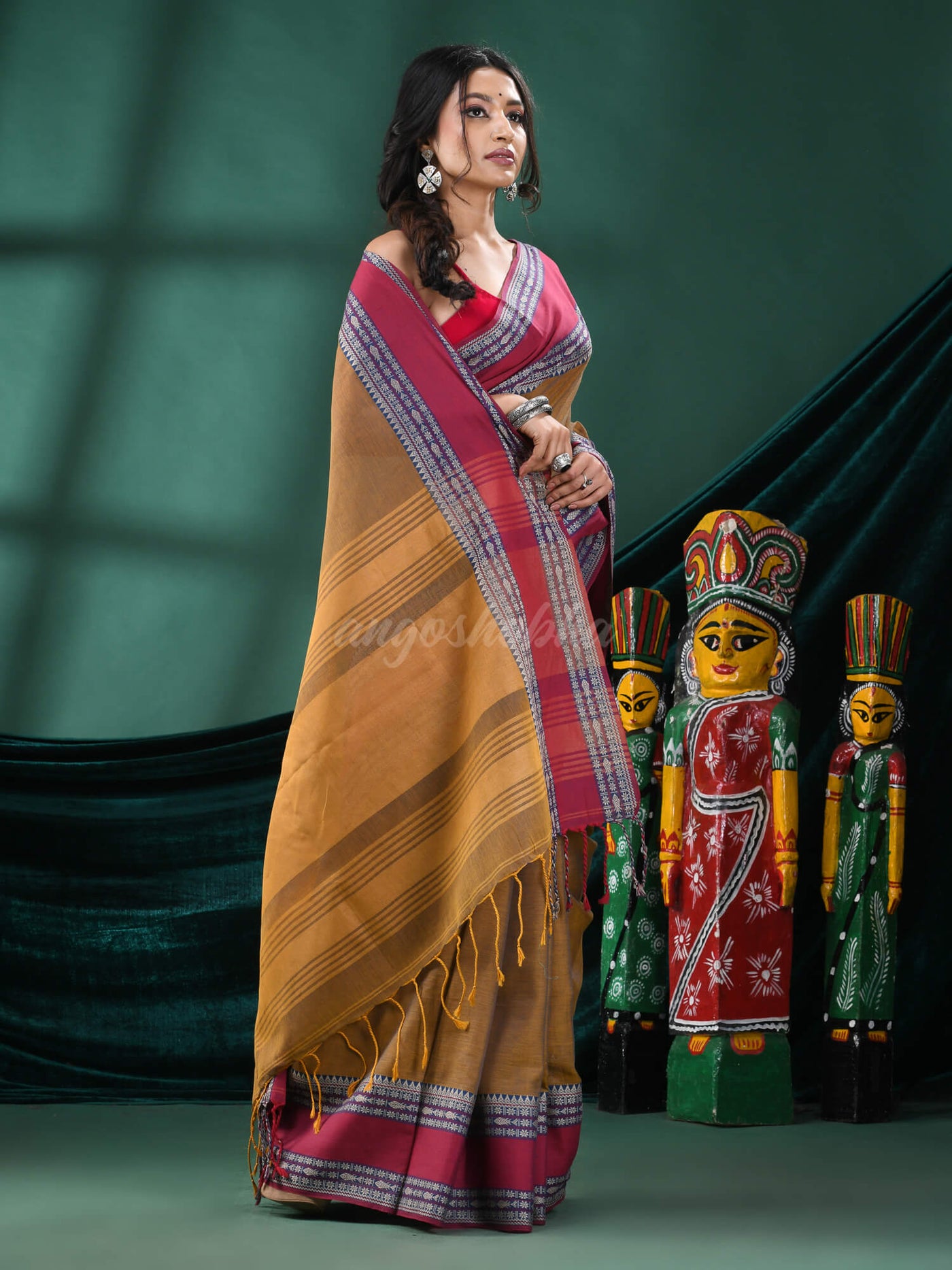 Description : Accentuate your ethnic ensemble by wearing this saree from Angoshobha. Sarees have their own grace, specially this one. This saree from Angoshobha is a beautiful Mustard handloom cotton saree. the saree all body Solid. with  jacquard design border.The pallu of the sareeis decorated with strip .The saree comes with a Mustard colour running blouse piece. saree with jacquard weaving  Crafted in a cotton fabric, this beauty gives the most comfortable fit. Style it with minimal jewellery and high heels to slay the ethnic look.Colour hues may slightly vary from that which appears in the image