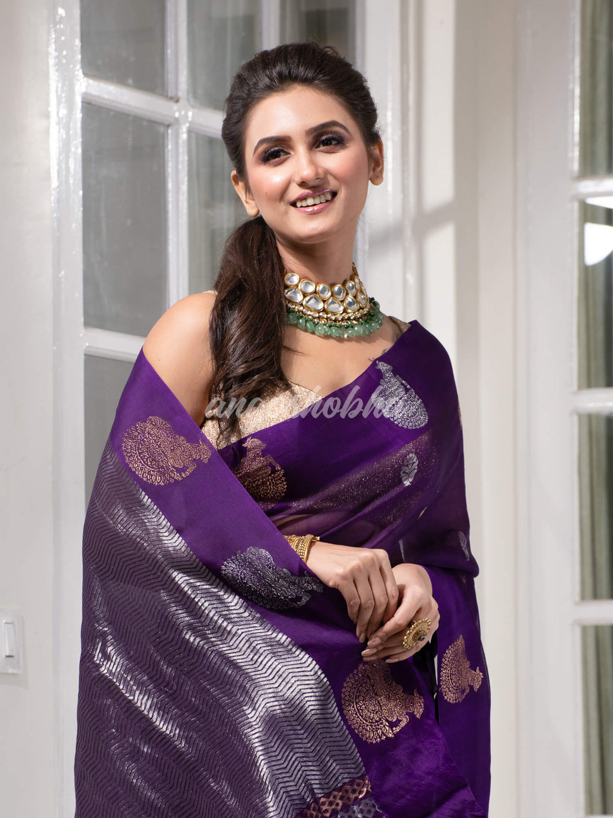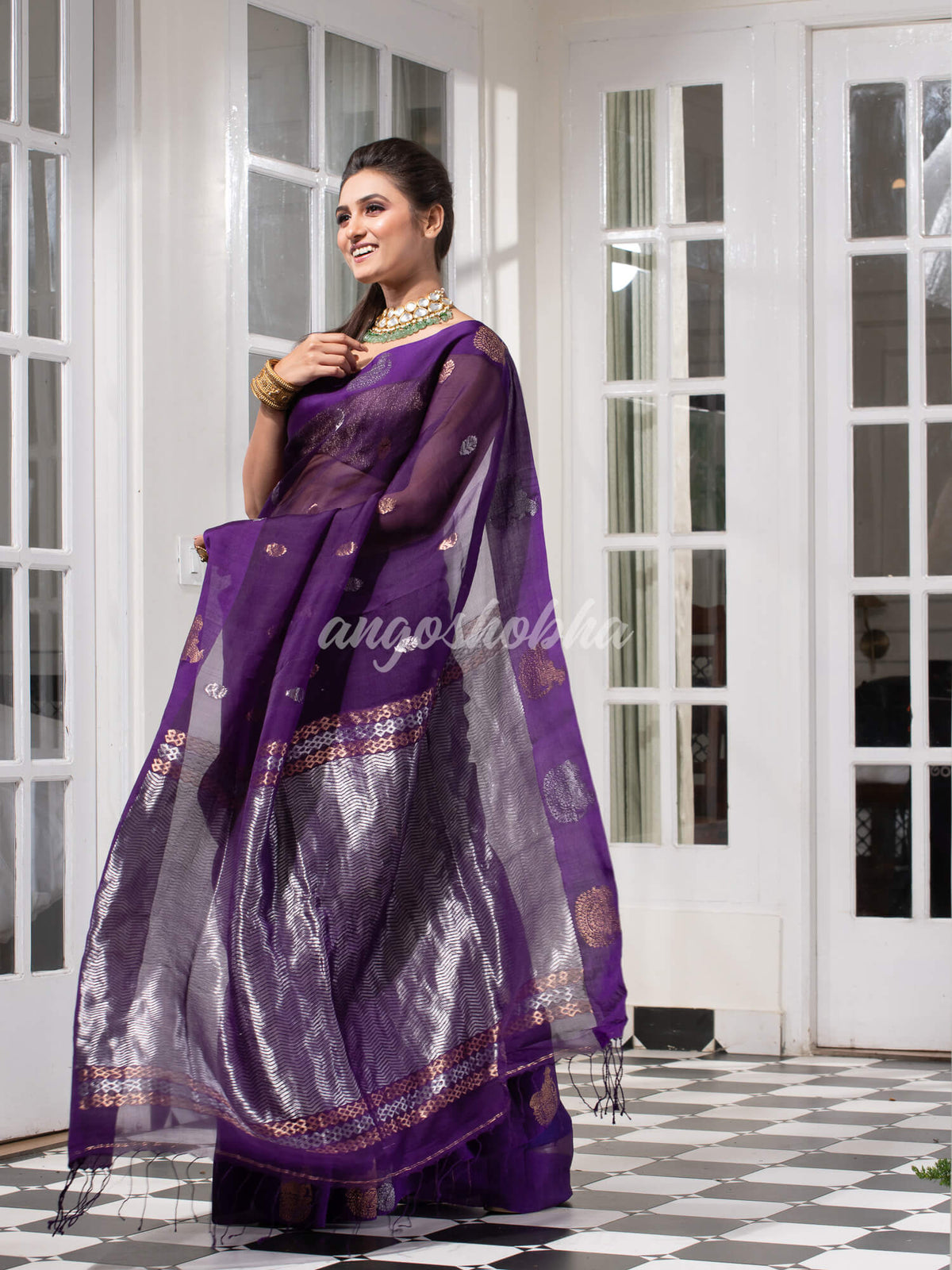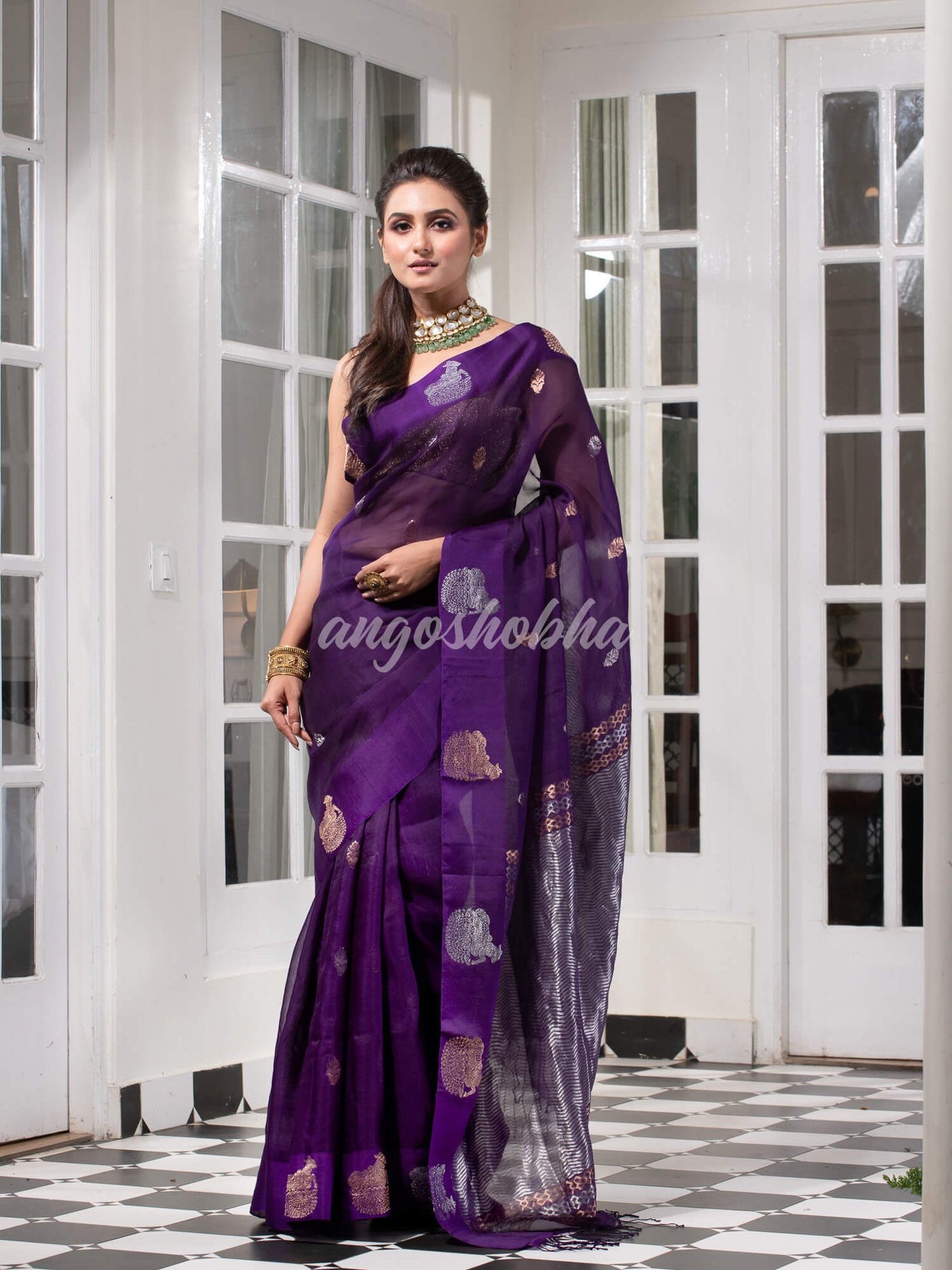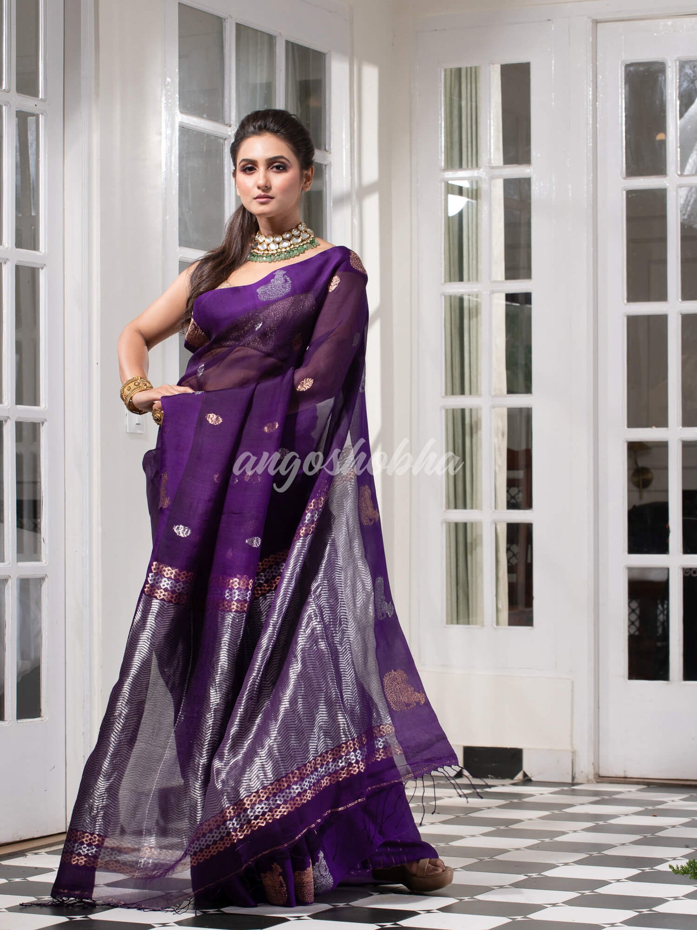 Description :This stunning saree presents a regal spectacle in a magnificent purple hue, a color historically associated with royalty, spirituality, and sophistication. Crafted from the finest pure muslin silk, it offers an unparalleled combination of lightness, extreme softness, and a delicate, almost sheer texture. Muslin silk, particularly from Bengal, is renowned for its "woven air" quality, making this saree incredibly comfortable and graceful. As a handwoven masterpiece, each thread is meticulously interlaced by skilled artisans on traditional looms, a process that imbues the saree with a unique character and subtle natural motifs texture and drapes with silver-golden check compilations on the pallu that cannot be replicated by machines. Blouse is attached as running form. The absence of heavy embellishment allows the inherent beauty of the pure silk and the rich purple shade to shine, creating an elegant and understated statement. This saree embodies traditional charm with a touch of modern trend making it perfect for discerning individuals seeking timeless elegance.