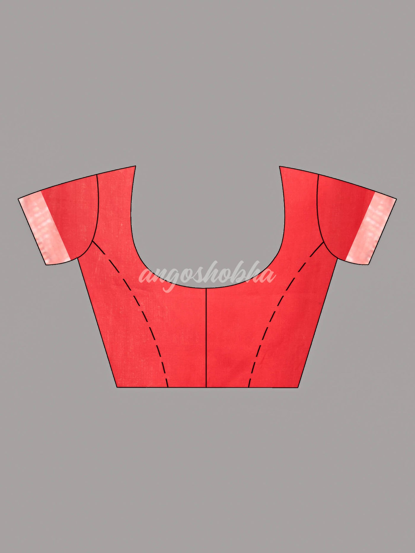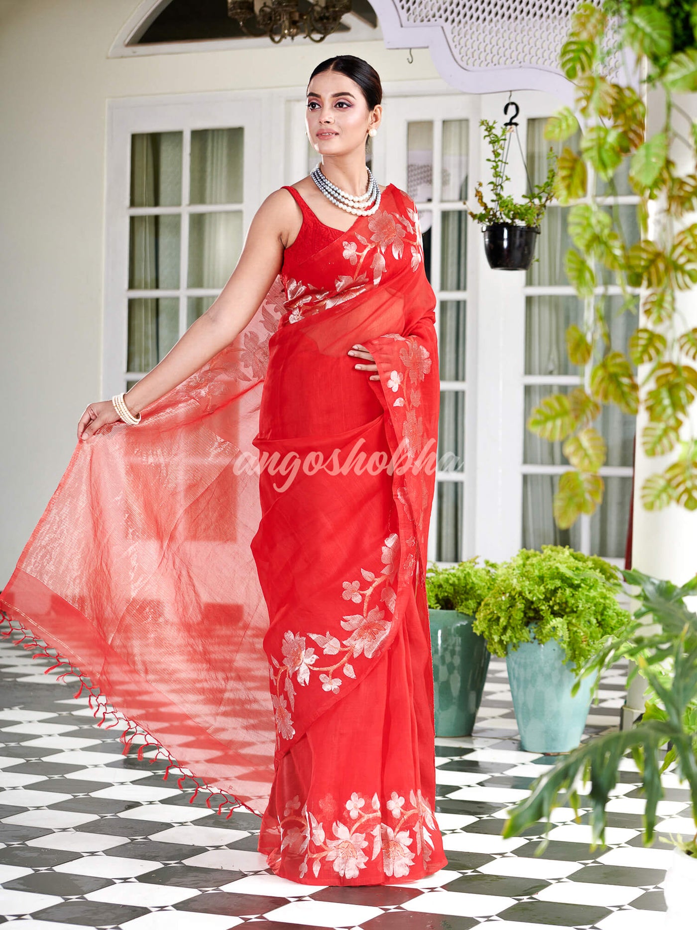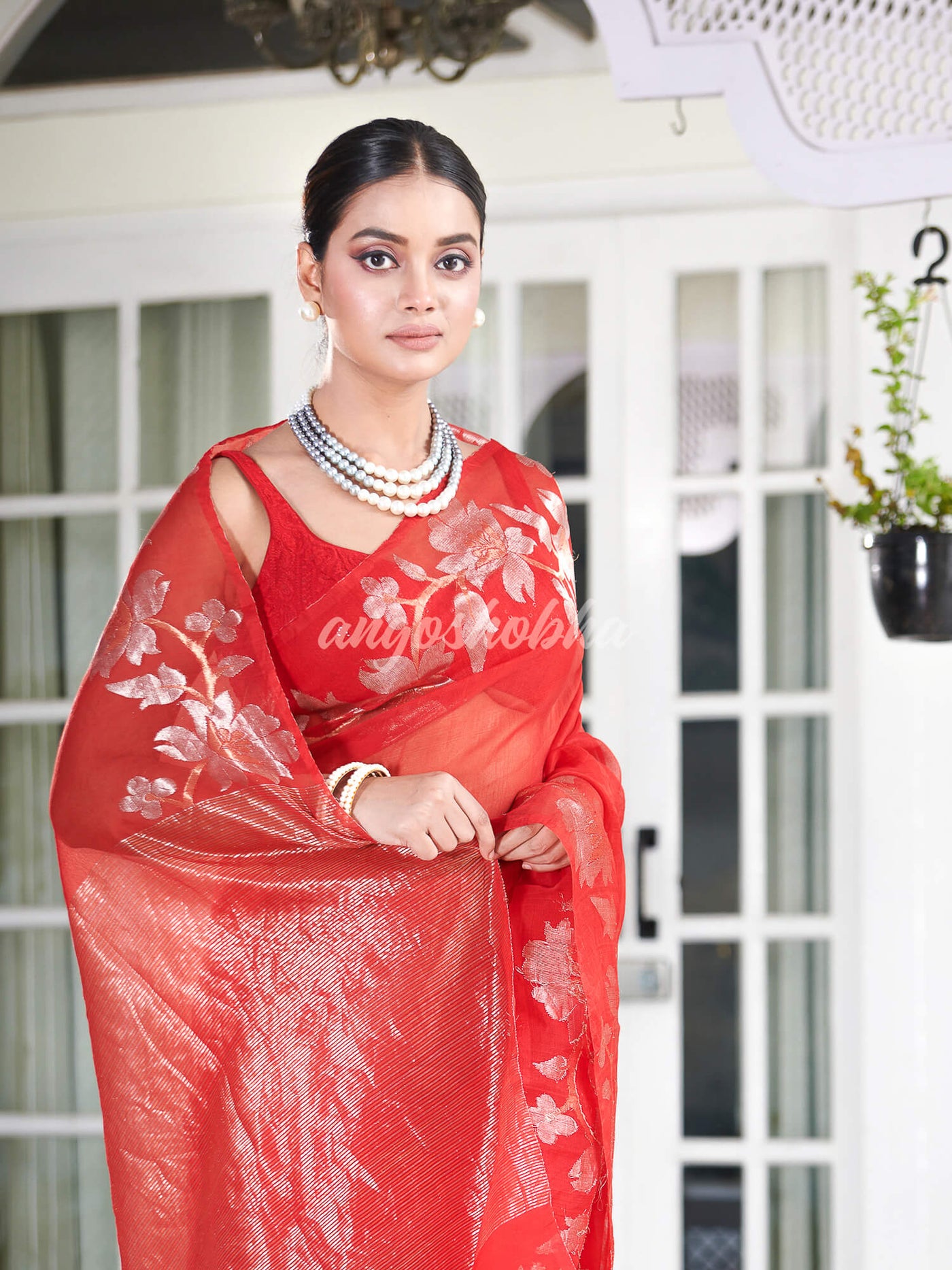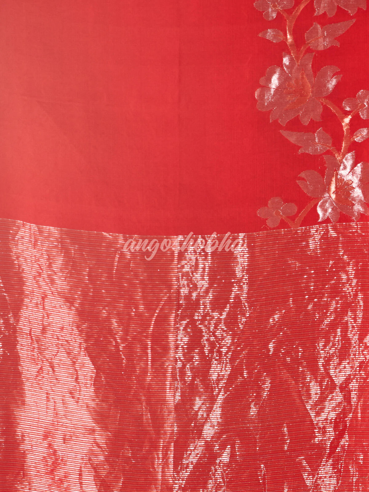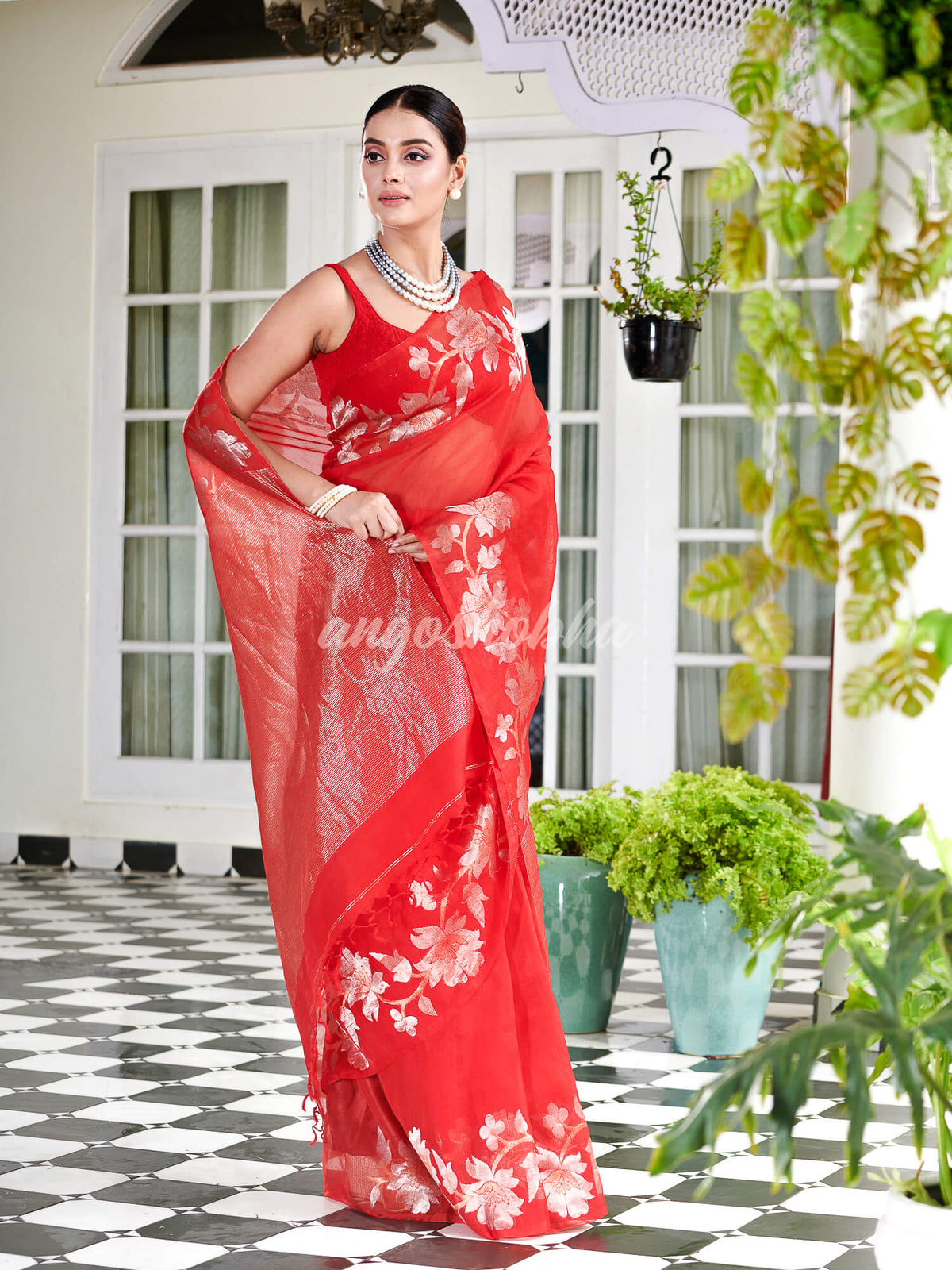 Red Silk White Flowers Motive Handwoven Muslin Saree