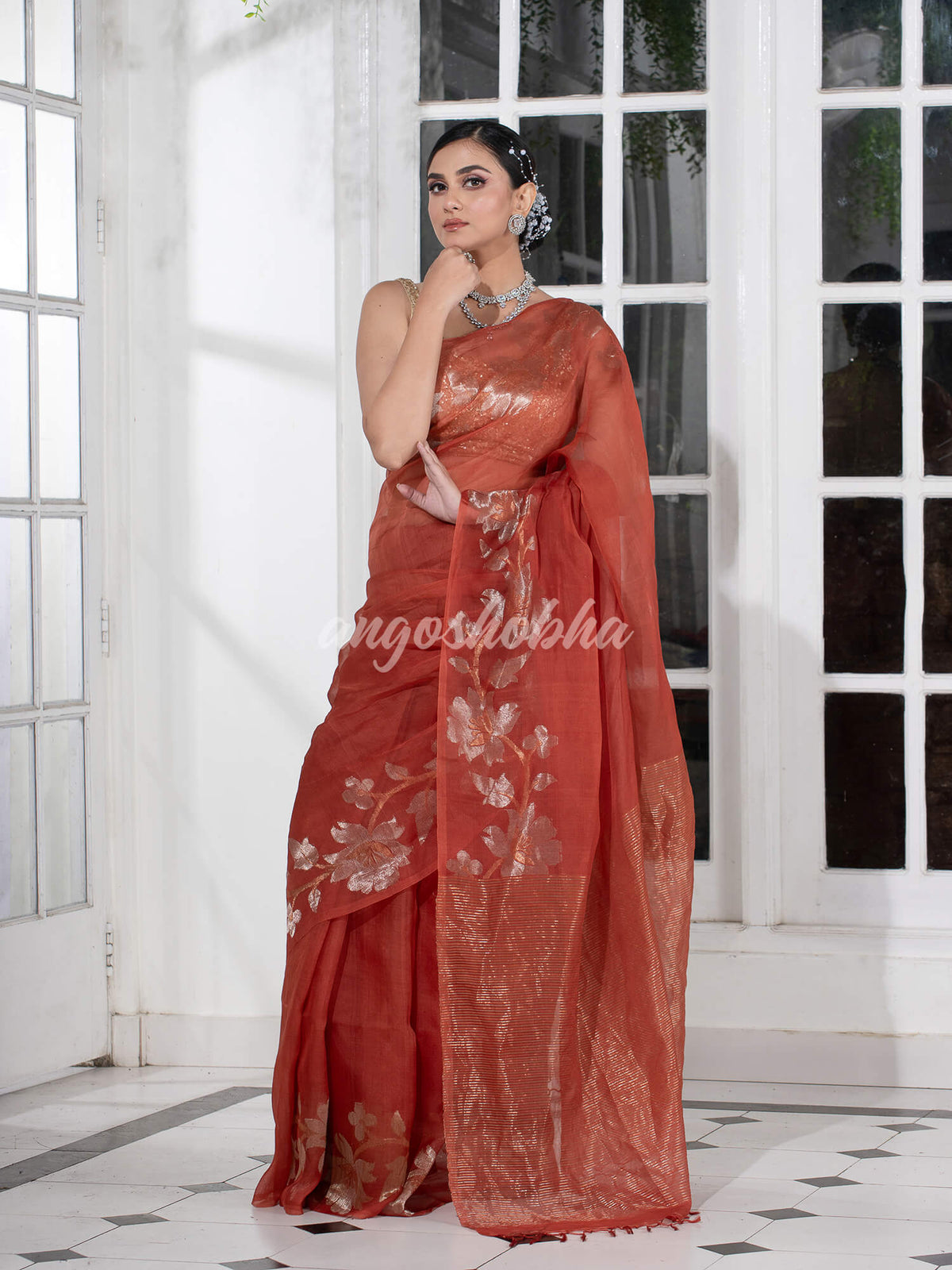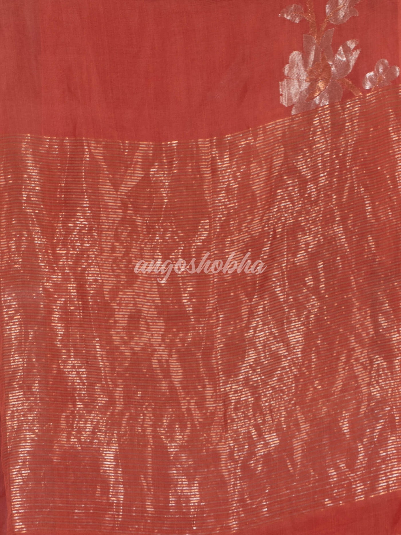 Rust Silk White Flowers Motive Handwoven Muslin Saree