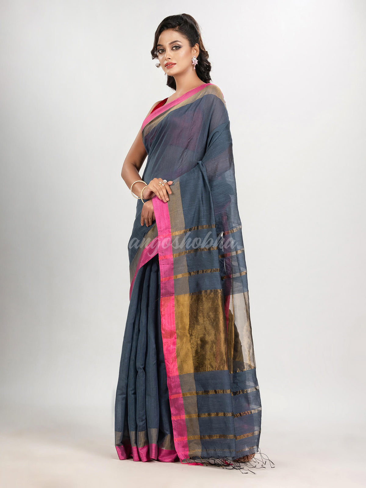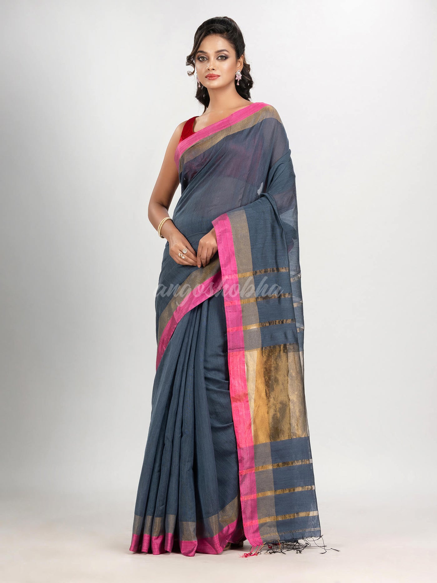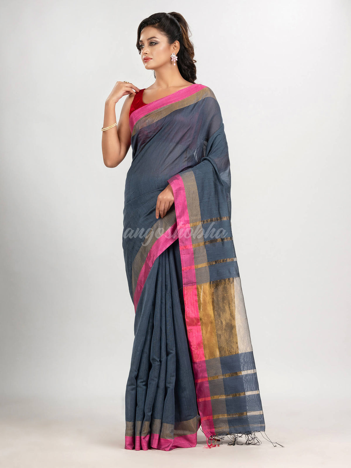 Description: Add a vibrant burst of color to your wardrobe with the enchanting Steel grey hand loom sari.The sari is made of cotton blend fabric beautified with wonderful handwoven sari included pink border.The hem of the sari is hatched with golden,steel grey and golden zari compilation stripes , and the body of the sari is covered with steel grey .It is attached with a blouse piece.Suitable to wear for casual outing,social meet,festival etc.So buy this sari now until finishing the stock.