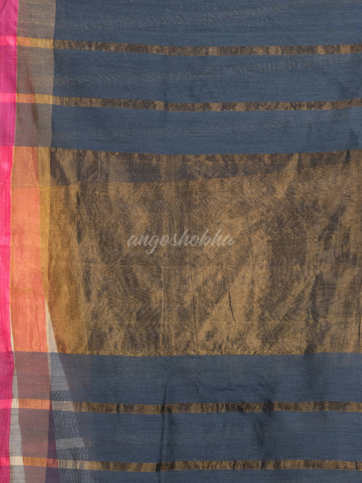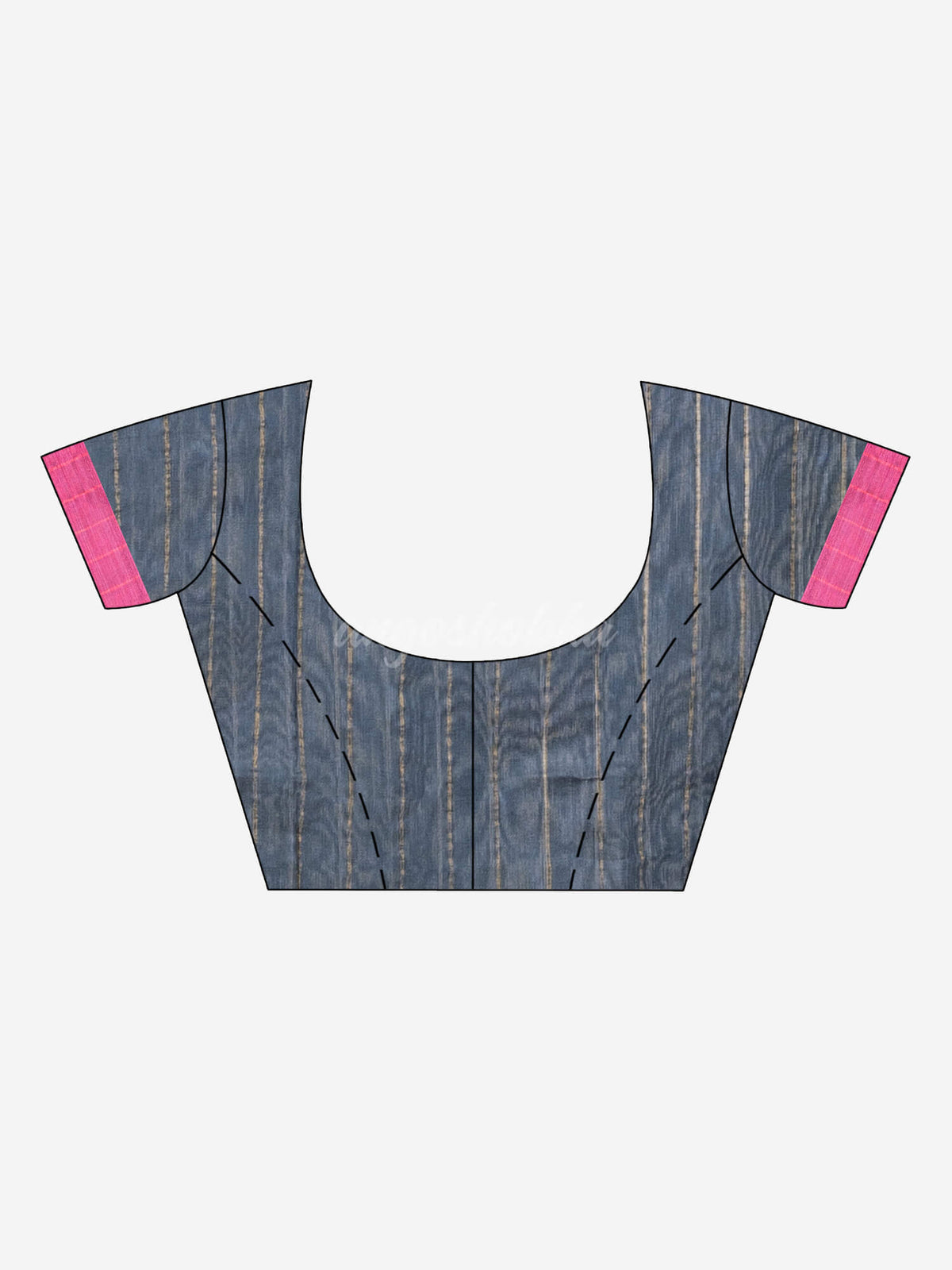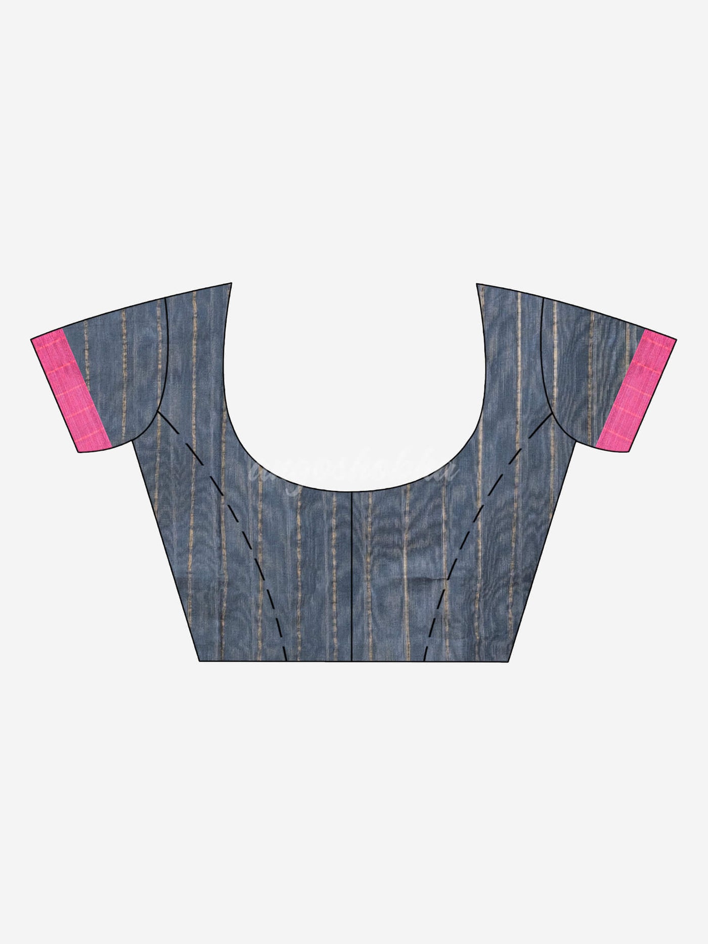 Description: Add a vibrant burst of color to your wardrobe with the enchanting Steel grey hand loom sari.The sari is made of cotton blend fabric beautified with wonderful handwoven sari included pink border.The hem of the sari is hatched with golden,steel grey and golden zari compilation stripes , and the body of the sari is covered with steel grey .It is attached with a blouse piece.Suitable to wear for casual outing,social meet,festival etc.So buy this sari now until finishing the stock.