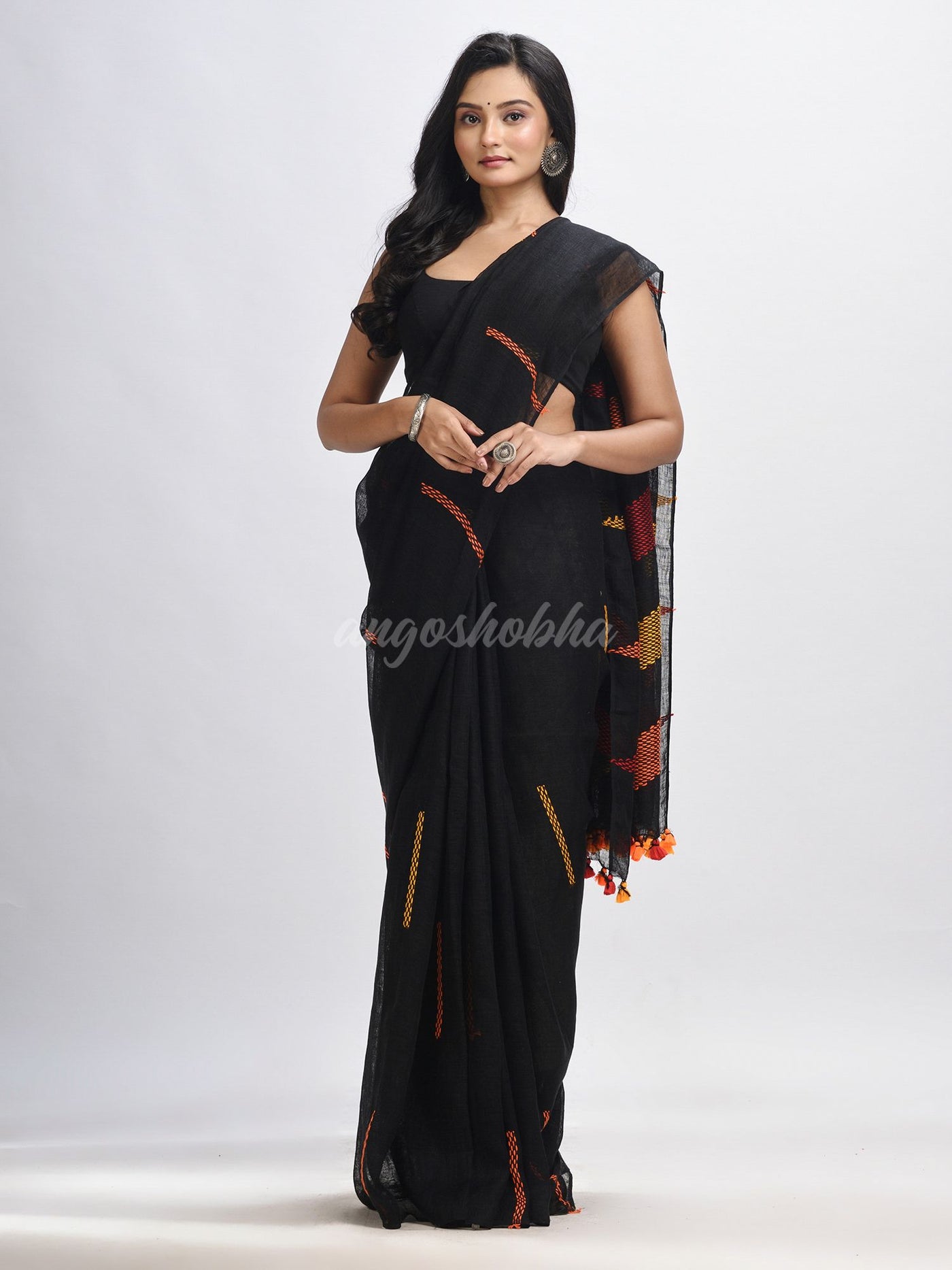 Description: Angoshobha ethnic saree comes with an attached blouse piece according to your taste and preference.The hem of the sari is manufactured with multi color design .It is obviously made hand weaving work latest designed.This Black saree is crafted by skilled craftsmen using high quality linen fabric without compromising on its quality. Saree is very comfortable in summer and suitable for festivals .With this beautiful design and fabric, this saree and blouse set will fetch you Oodles of compliments and praises.