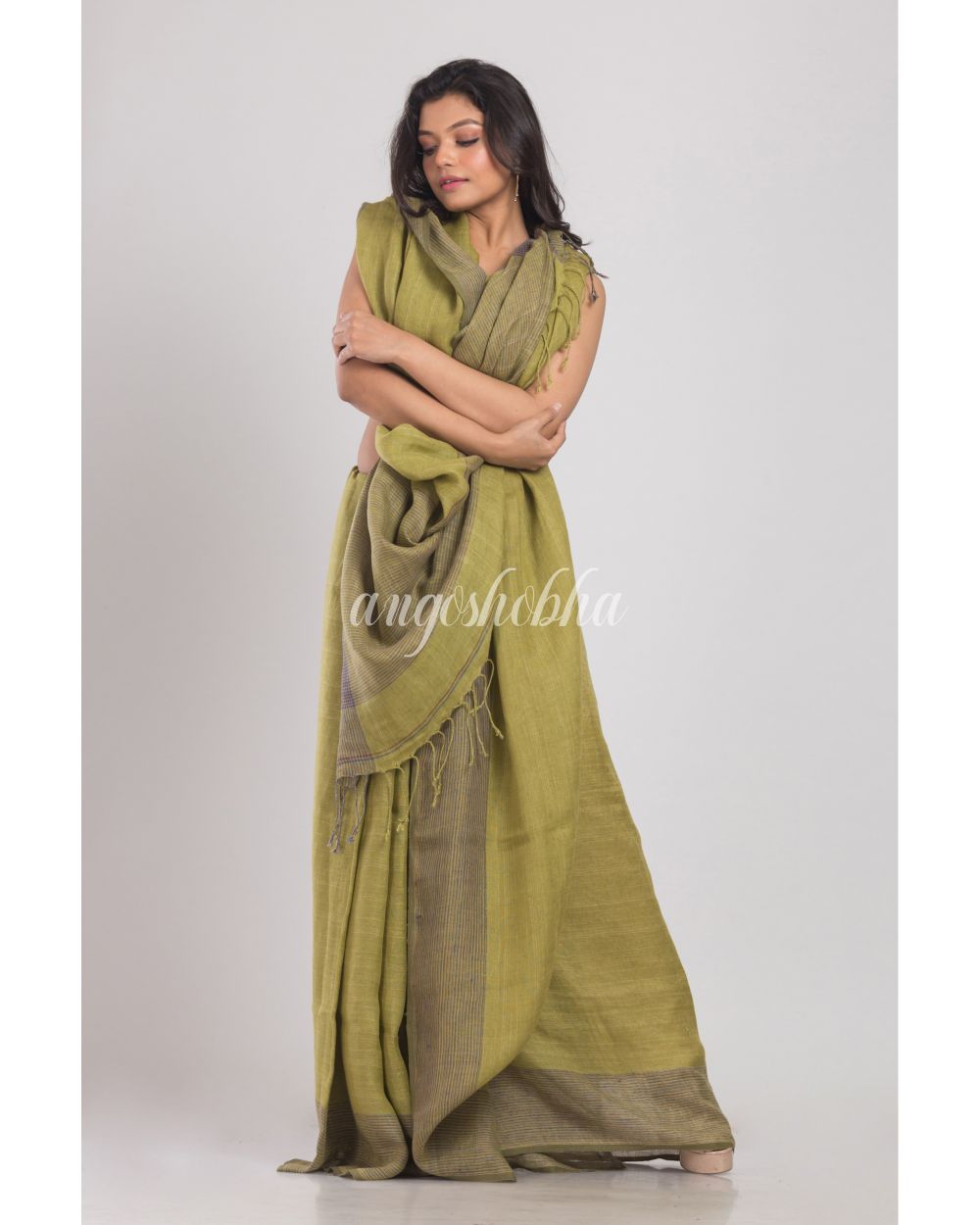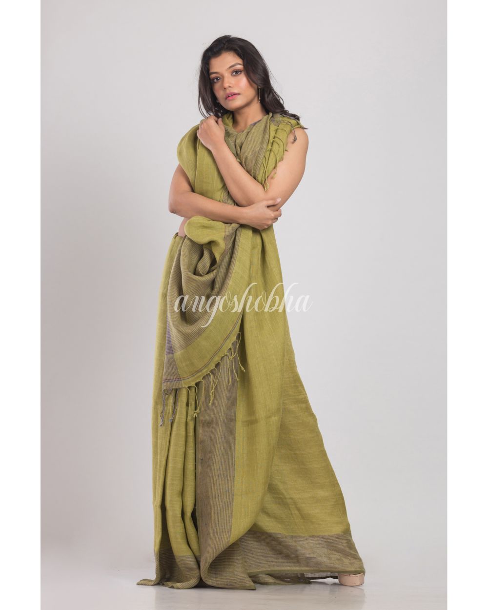 Description: Angoshobha ethnic sari comes with an attached blouse piece according to your taste and preference. This olive green sari is crafted by skilled craftsmen using high quality linen fabric without compromising on its quality.It is disguised with olive and middle grey color.This handwoven sari is very comfortable in summer and suitable for festivals .With this beautiful floral design and fabric, this sari and blouse set will fetch you Oodles of compliments and praises.So take this item certainly until finishing of this latest collection.