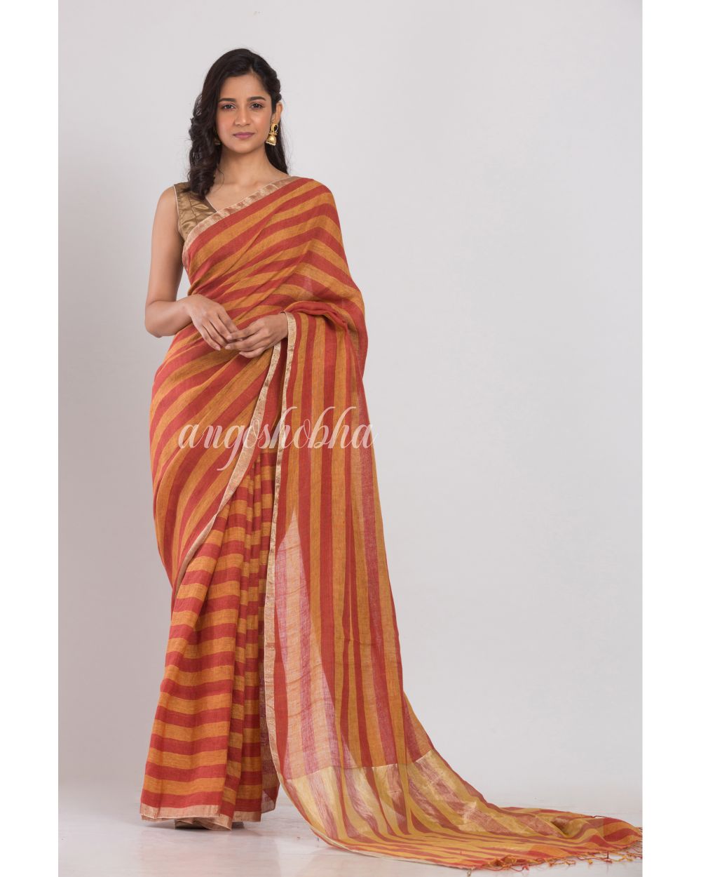 DESCRIPTION: Angoshobha’s ethnic hand weaving saree comes with an attached blouse piece, which can be different colour according to your taste and preference. This orange and red linen saree is crafted by skilled craftsmen using high quality linen fabric without compromising on its quality.This collection has orange and red stripes as hem and border is slightly silver colour straight .This saree is very comfortable in summer and suitable for festivals .With this beautiful design and fabric, this saree and blouse set will fetch you Oodles of compliments and praises.So you must  buy this product certainly. We are always with your choice and fashion.