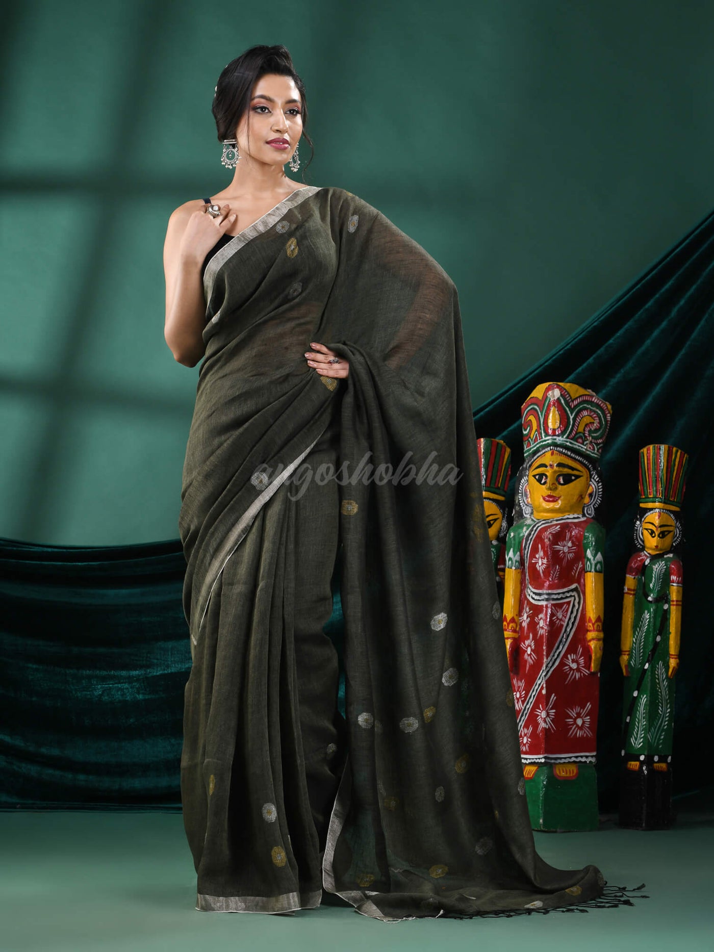 Description: Accentuate your ethnic ensemble by wearing this saree from Angoshobha. Sarees have their own grace, specially this one.This saree from Angoshobha is a beautiful Pasta Green Handloom Linen saree.The all body ball motifs. ,border of the sari is disguised with silver zari colour .The hem of the sari is disguised with blouse piece.Crafted in a linen fabric, this beauty gives the most comfortable fit.You can wear anywhere and any festival moment with wonderful enjoyment.Color hues may slightly vary from that which appears in the image