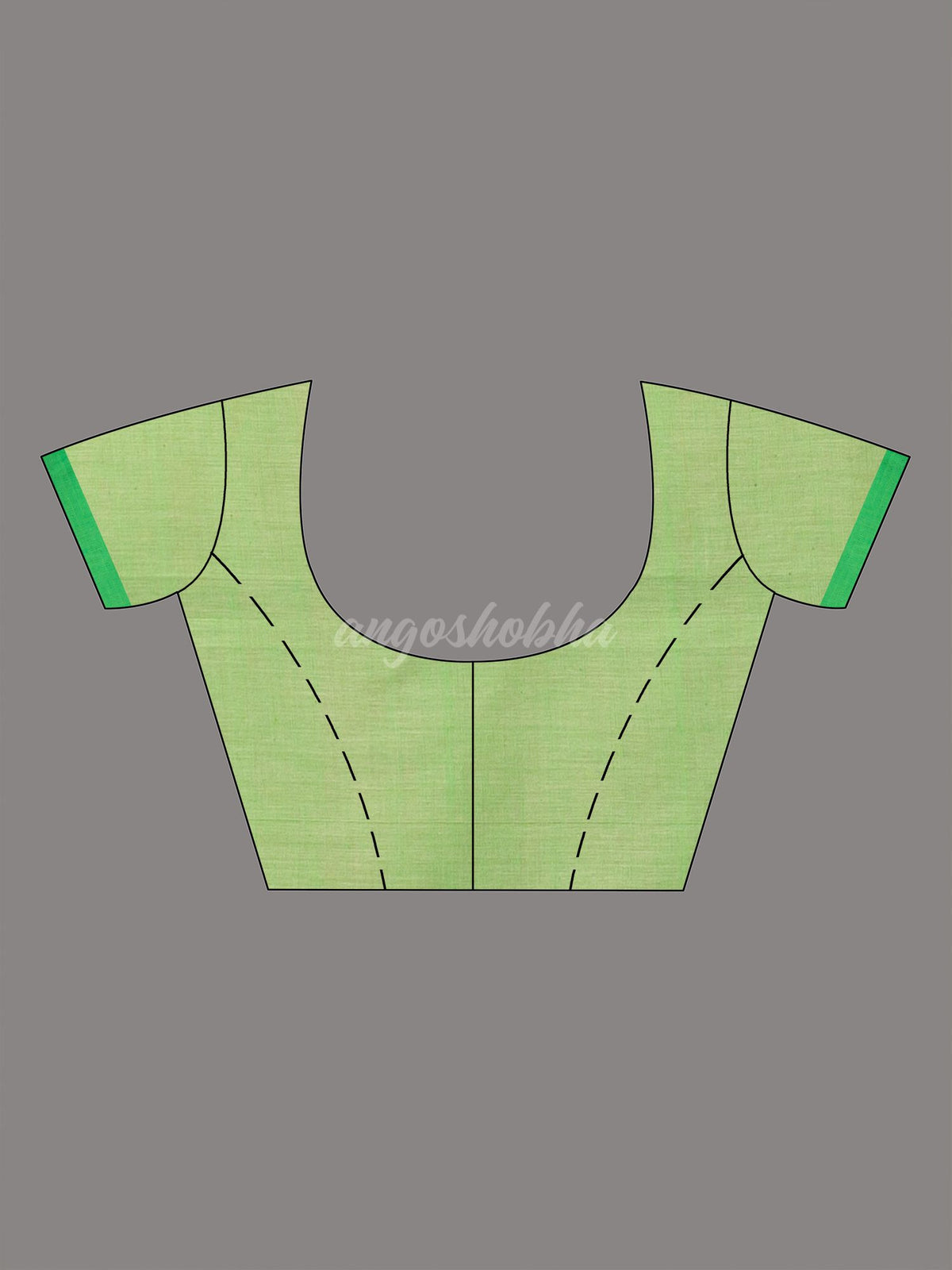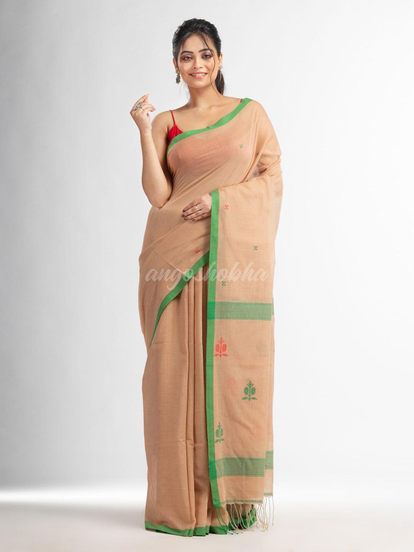 Biscuit all body buti with buti in green border handwoven cotton saree