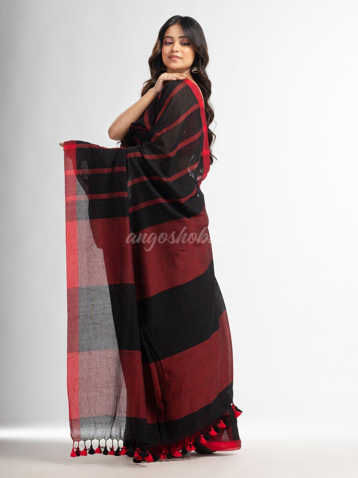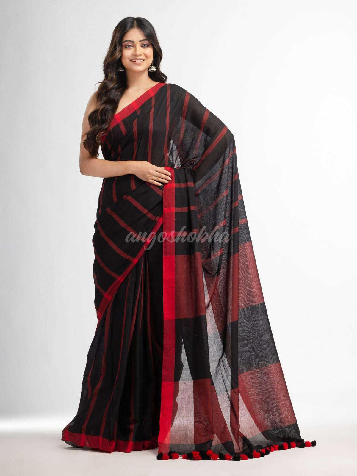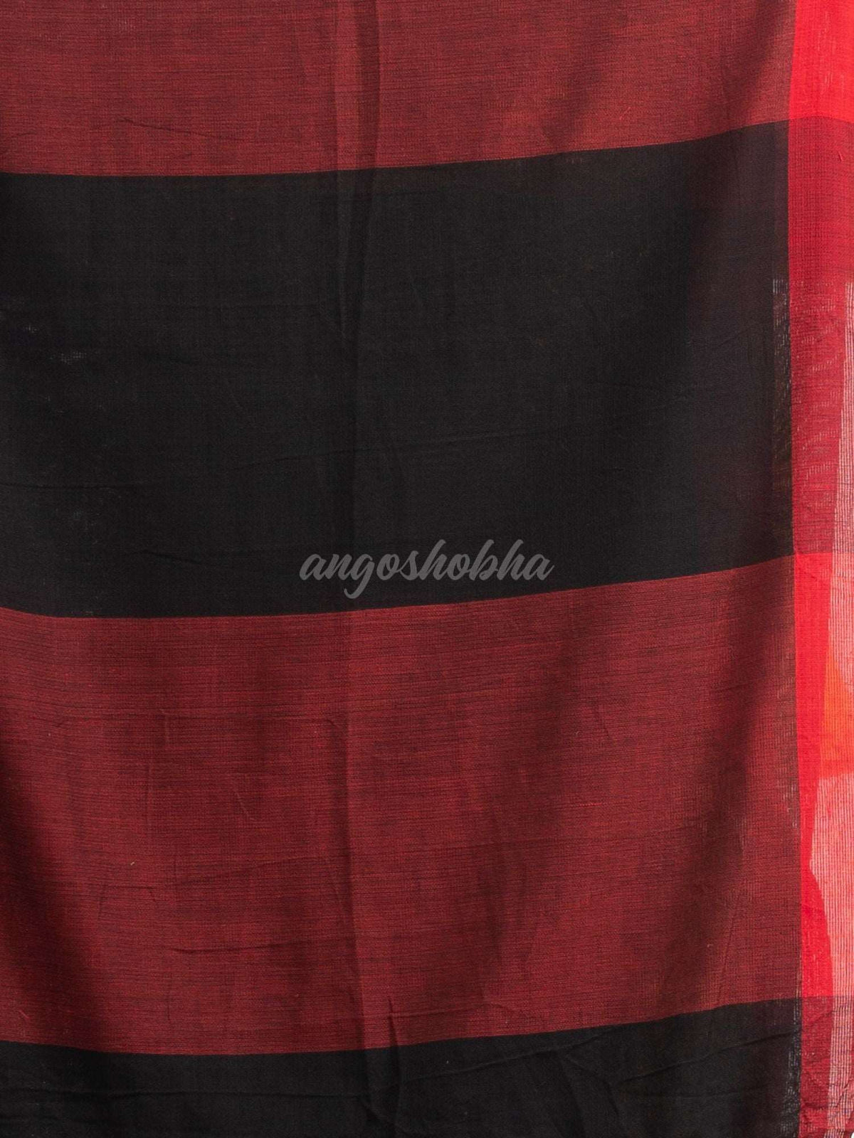 Description: Accentuate your ethnic ensemble by wearing this saree from Angoshobha.This saree from Angoshobha is a beautiful The all saree  red colour stipe,cotton moklin handwoven muslight saree. The saree boder is Red colour.  concocted with pallu red , Black colour. with white & red colour pompom added, with Red colour blouse piece.Crafted in a Cotton fabric .