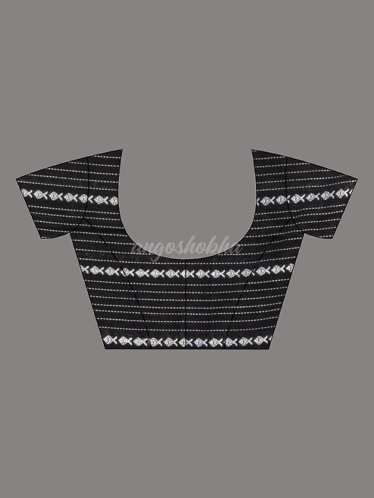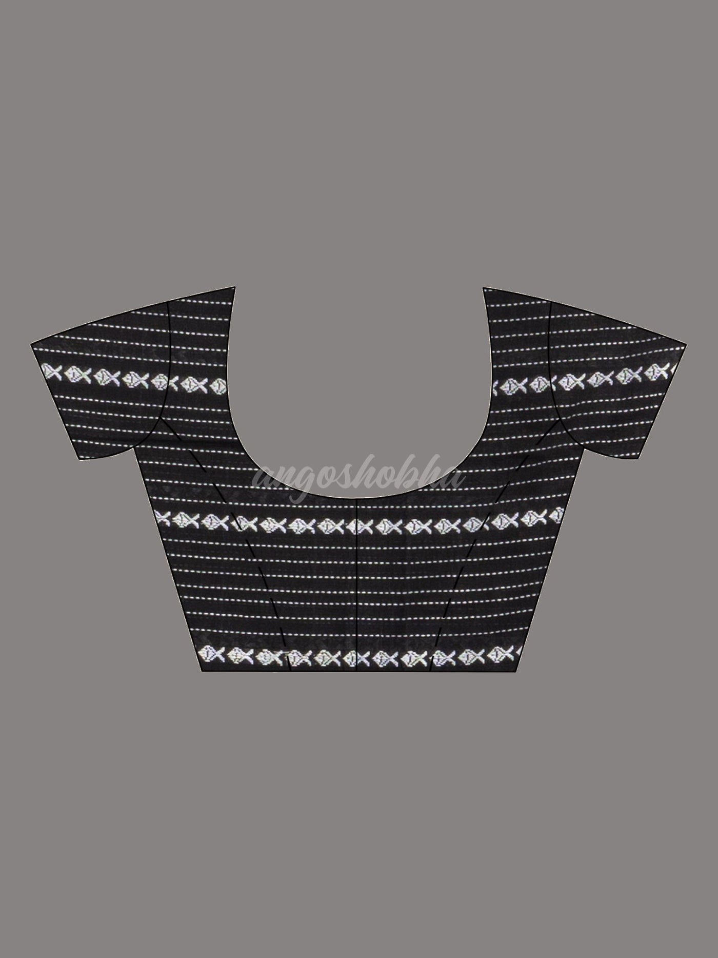 Description: Accentuate your ethnic ensemble by wearing this saree from Angoshobha.This saree from Angoshobha is a beautiful The all saree White  colour stipe & small fish design handwoven cotton saree. The saree border is solid  White color.  concocted with pallu White color fish design , with Black color blouse piece.Crafted in a Black Cotton fabric .