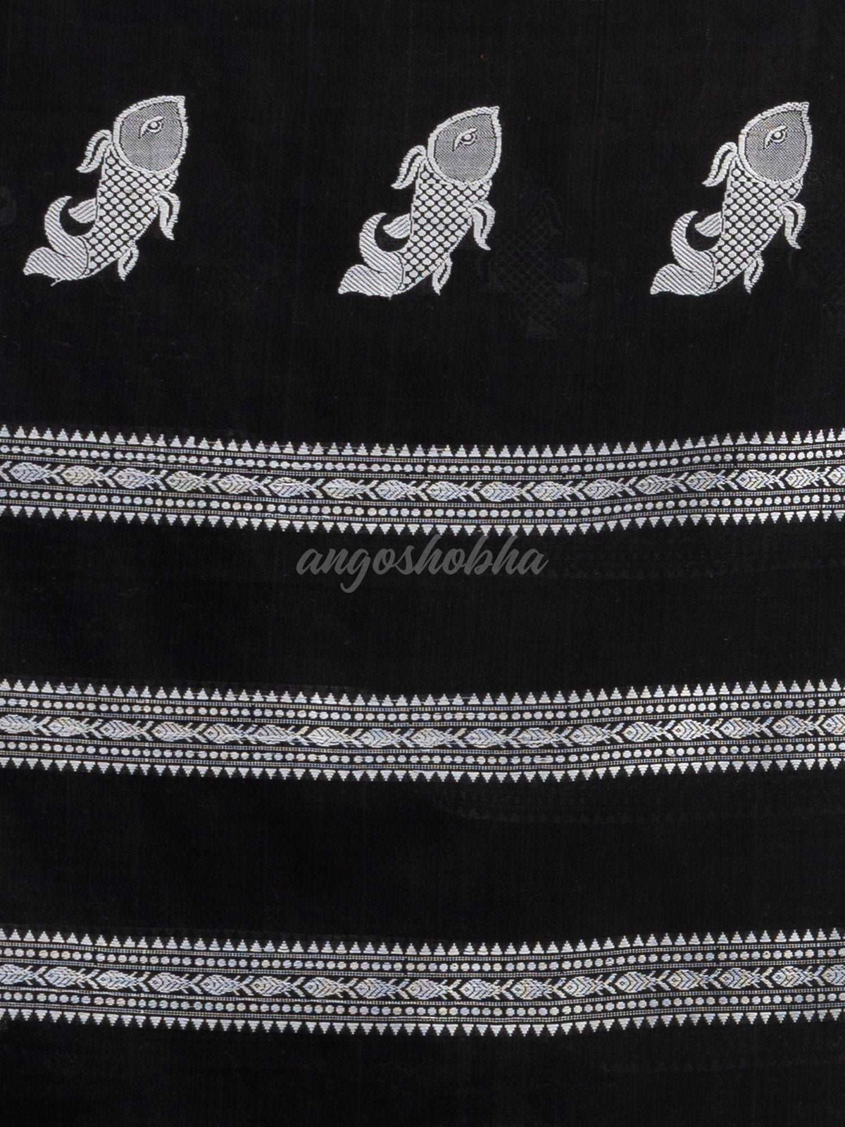 Black all body small fish design with fish design pallu in solid border handwoven cotton saree
