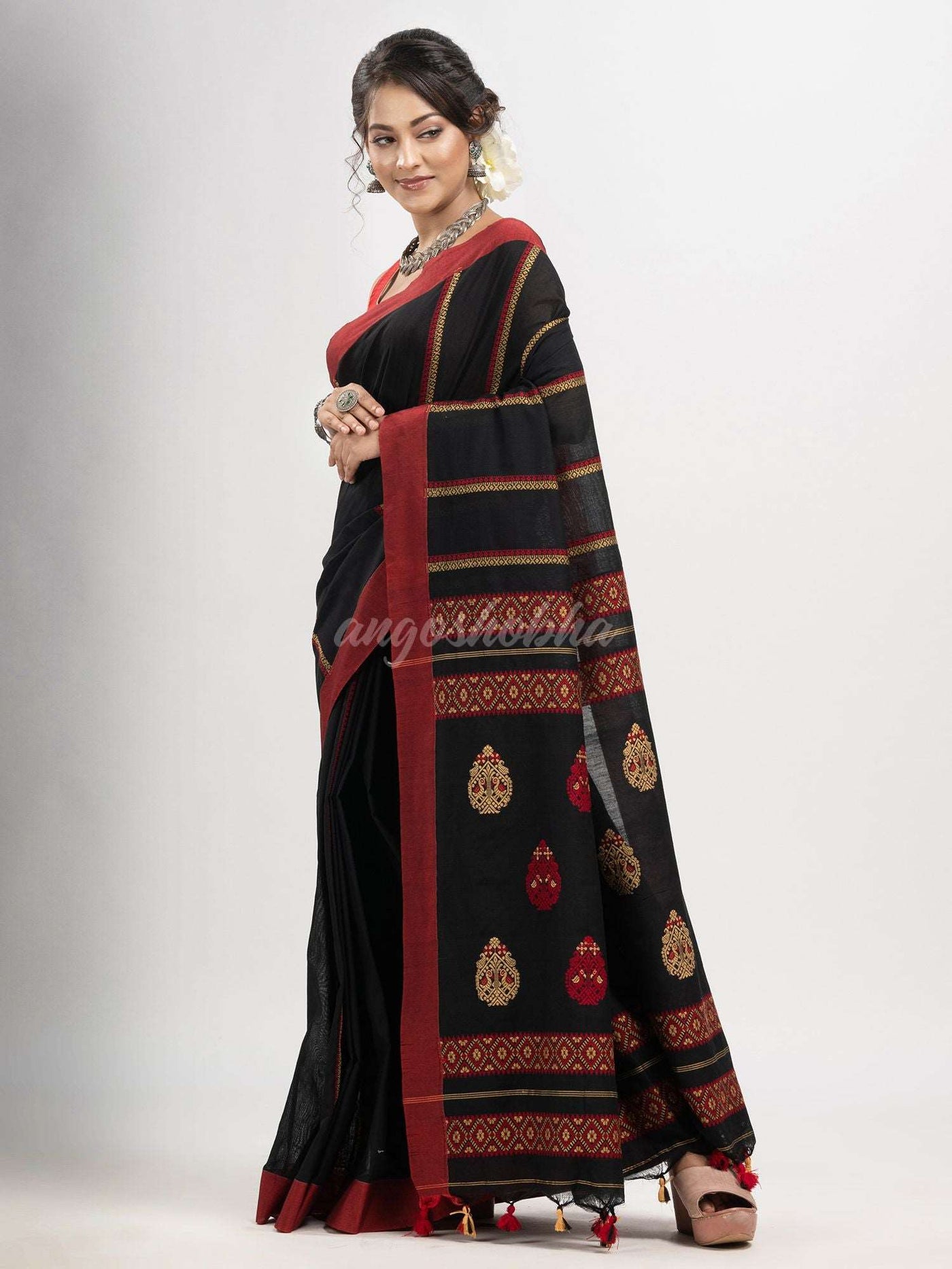 Description: Accentuate your ethnic ensemble by wearing this saree from Angoshobha. Sarees have their own grace, specially this one.This saree from Angoshobha is a beautiful Black cotton jacquard saree. Saree all body multi colour jacquard strip.The border of the saree is red colour. with pallu multi colour buti & stripe.  The saree comes with a Black colour running blouse piece. You can wear anywhern and Crafted in a cotton fabric, this beauty gives the most comfortable and any festival moment with wonderful enjoyment.So collect this product and enjoy with wearing cotton saree. Obviously you can trust on this collection. We are always with your fashion and choice.