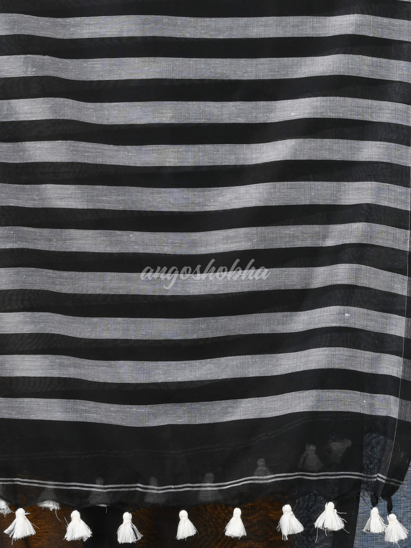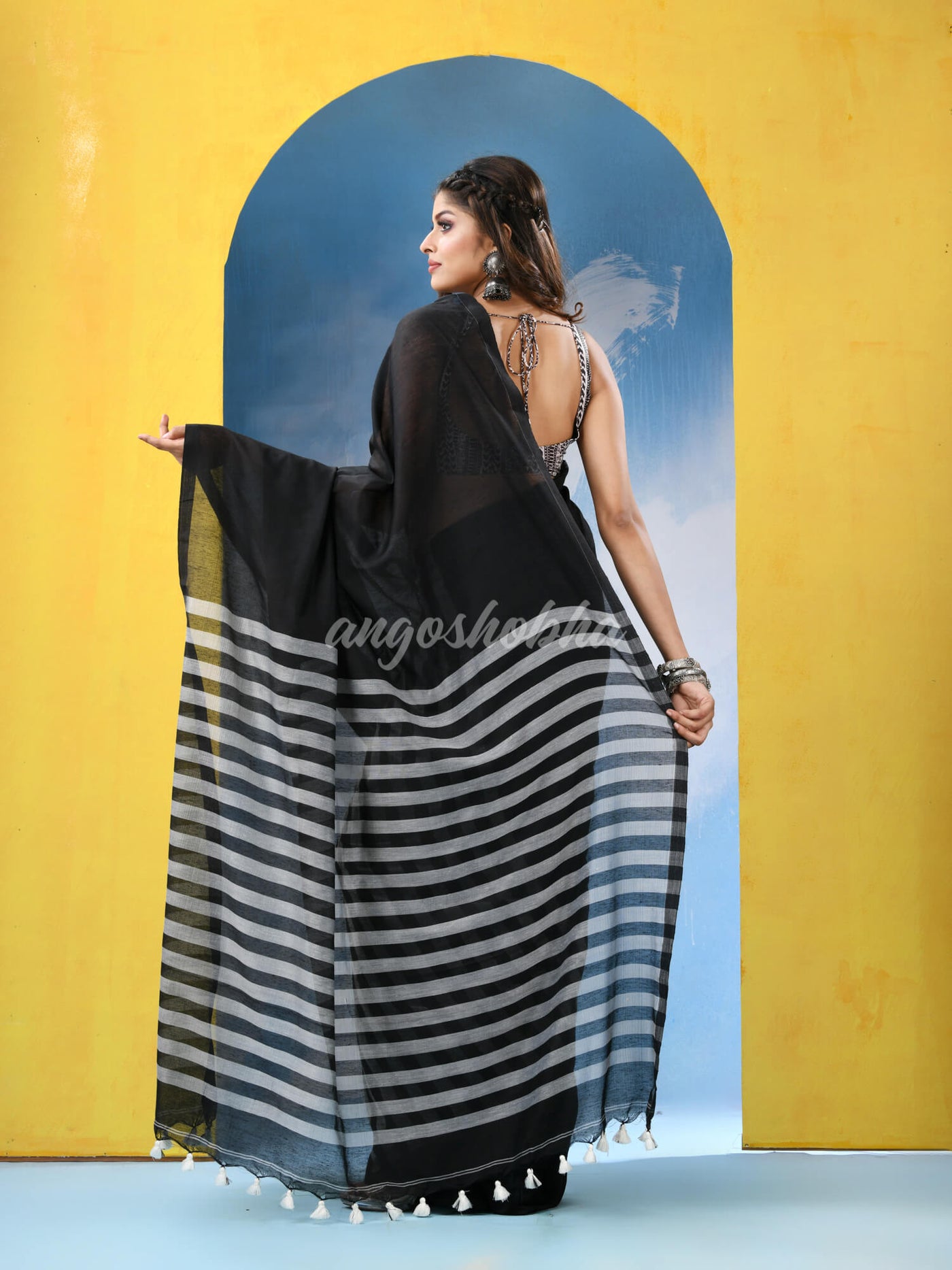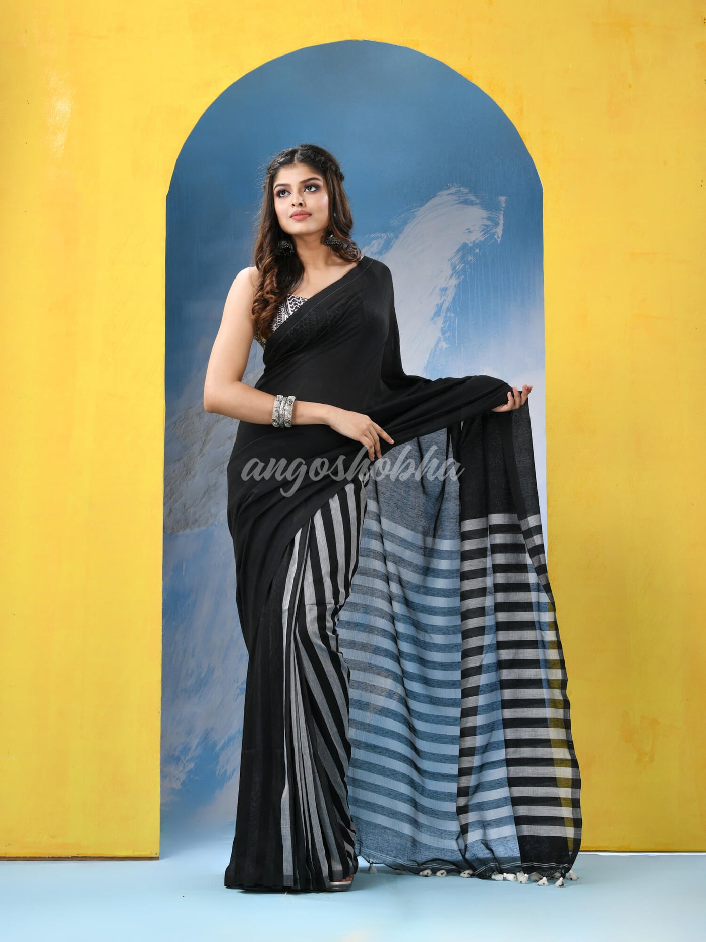 DESCRIPTION: Add a vibrant burst of colour to your wardrobe with the enchanting Black handloom saree.The saree is made of cotton fabric beautified with wonderful hand woven molmol  and the hem of the saree is hatched with Black and Silver combination .It is attached with a blouse piece.Suitable to wear for casual outing,social meet,festival etc.So buy this saree now until finishing the stock.