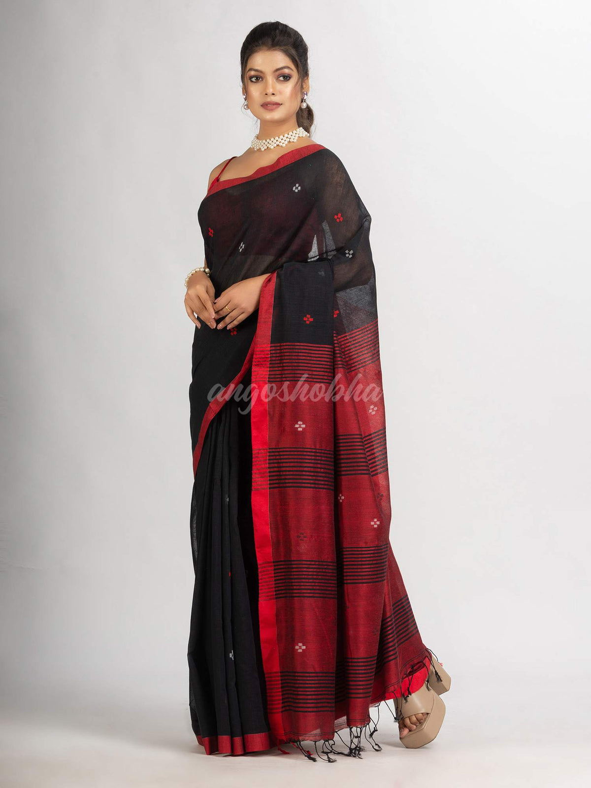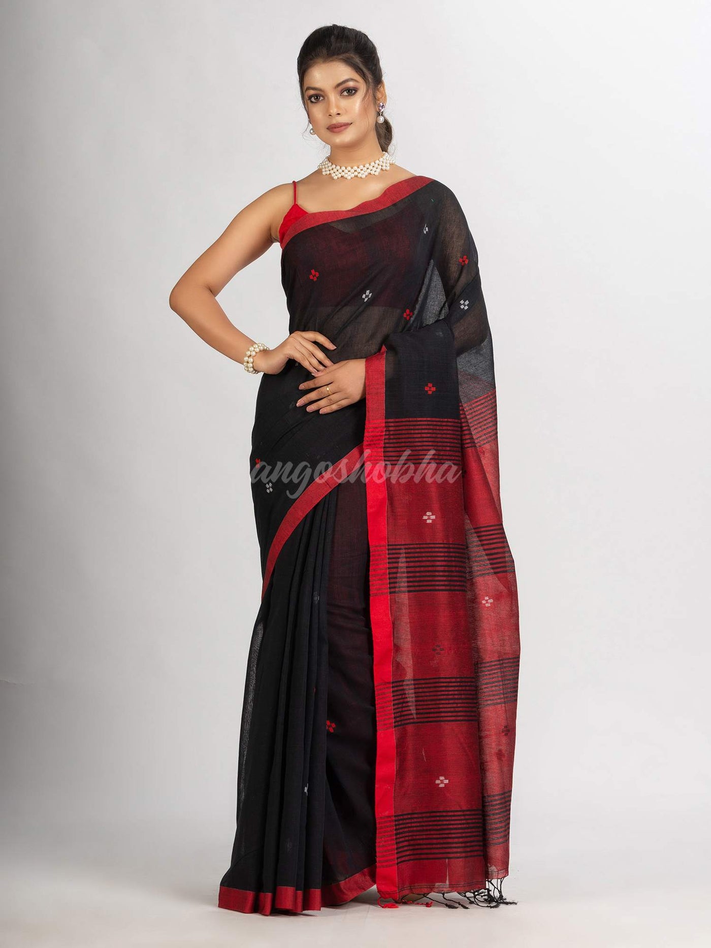 Description:  This Traditional Black saree, wtih Red border Cotton Jamdani saree is woven in grandiose to feel the freshness of tranquility. The serene Black overlay is embellished with self-threaded white and Red, motifs. It is disguised with pallu red & white Motifs. the blouse piece which is Red colour.Colour hues may slightly vary from that which appears in the image.