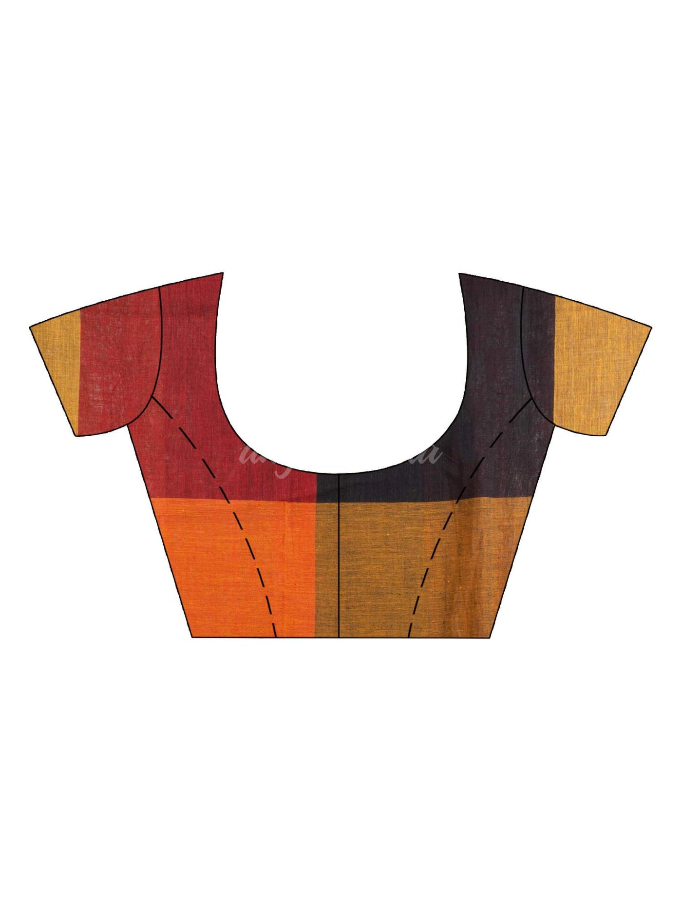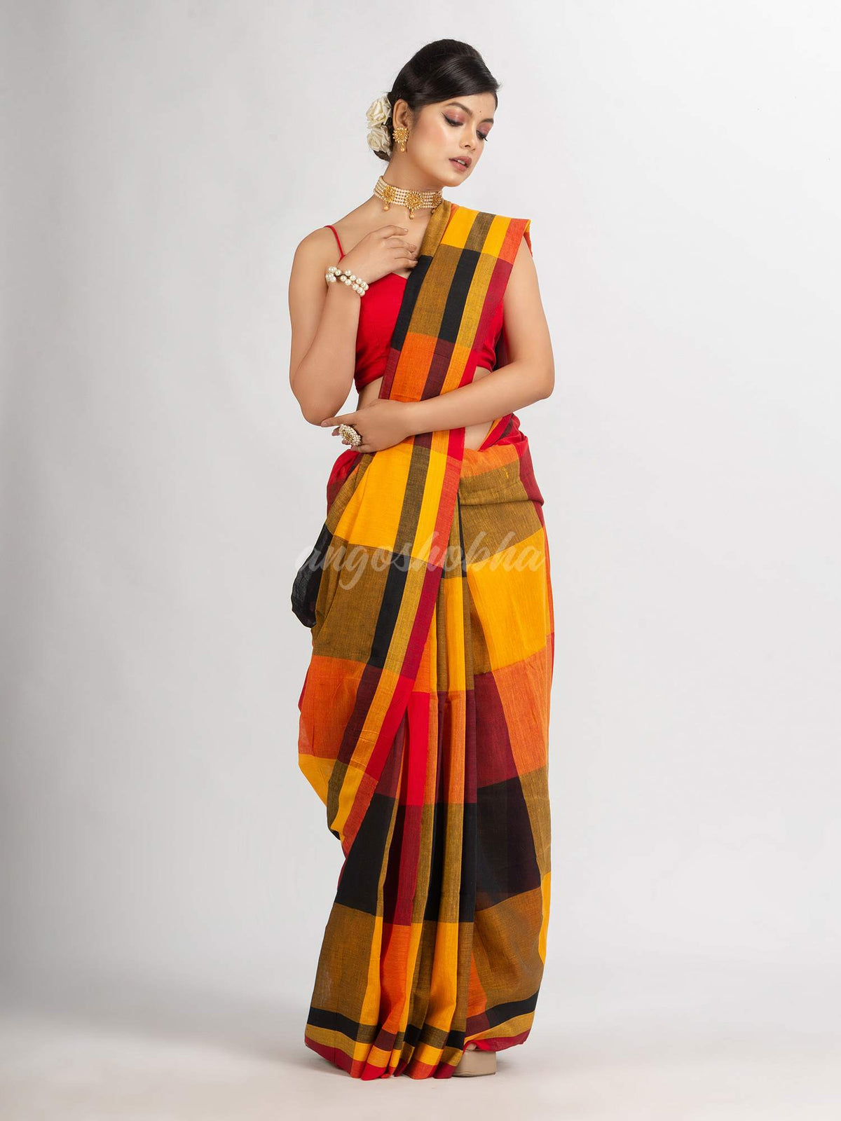 DESCRIPTION: The sari of the Angoshobha is one of the best product.It is manufactured with cotton fabric. It is a beautiful Multi colour check handloom cotton saree .The border of the sari is disguised with Red colour.The hem of the sari is disguised with multi colour and an attached blouse piece.