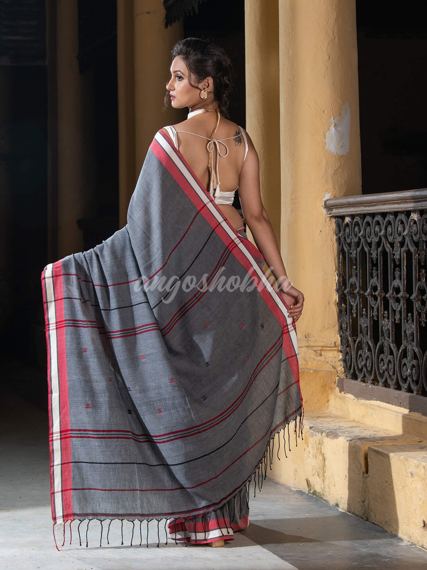 Description: Accentuate your ethnic ensemble by wearing this saree from Angoshobha. Sarees have their own grace, specially this one. This saree from Angoshobha is a beautiful Dark Grey cotton handloom saree . The saree all body motif .with multi colour border. with pallu multi colour strip and motif and attach dark grey colour blouse piece. Crafted in a cotton fabric, this beauty gives the most comfortable fit. Style of it with minimal jewellery and high heels to slay the ethnic look. You can wear anywhere and any festival moment with wonderful enjoyment. So collect this product and enjoy with wearing cotton saree. Obviously you can trust on this collection. We are always with your fashion and choice.