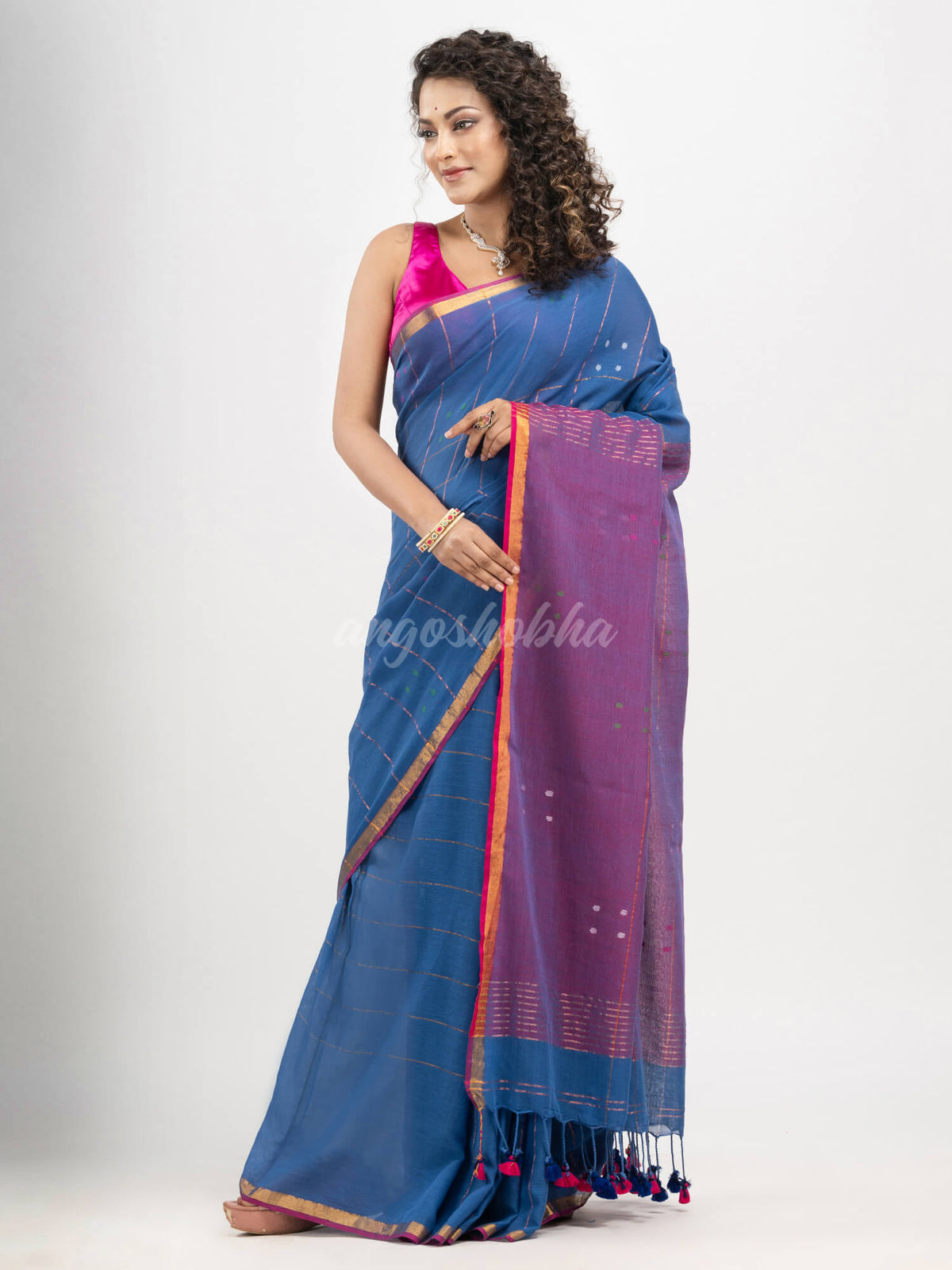 Description: Woven with elegance and grace, this saree from Angoshobha is the epitome of beauty. It is a Denim Blue colour handloom cotton saree. The saree all body check and motive.with golden zarie border.with pallu strip & motive. it is attached with a blouse piece. Style it with minimal jewellery and a potli bag for a gorgeous look.This is made with cotton fabric.It is suitable to wear at any place and any occasion.Order this item very recently.