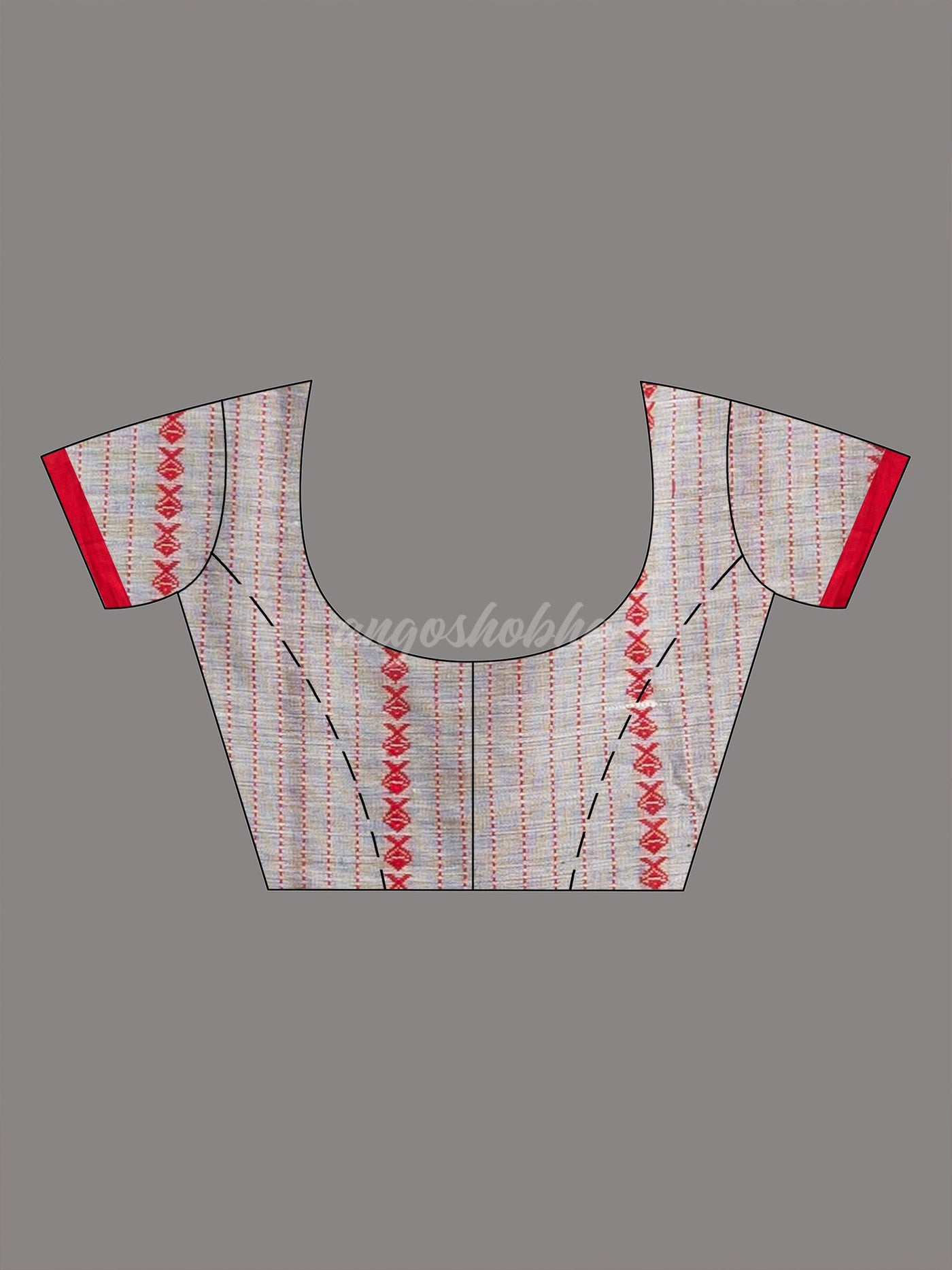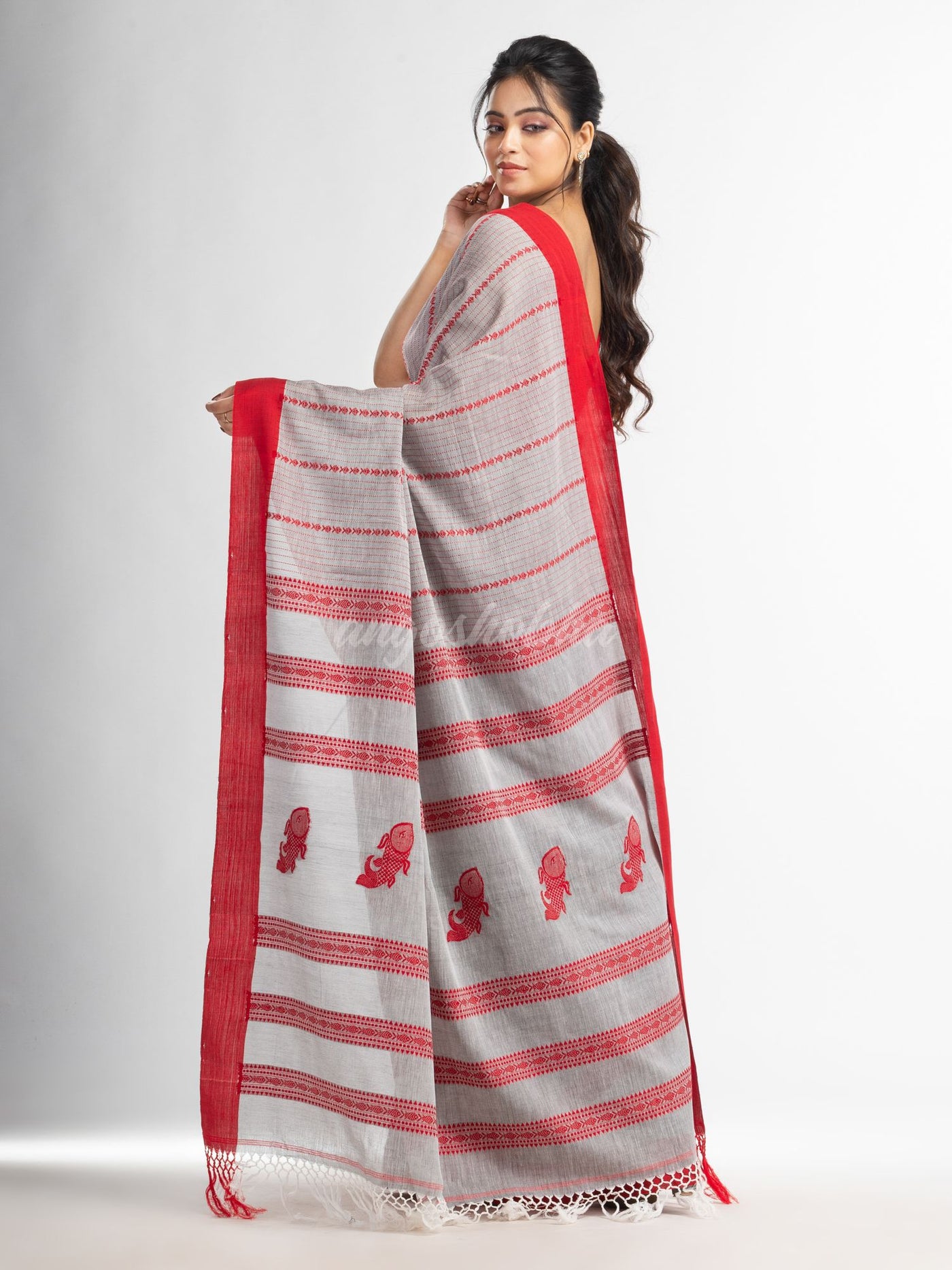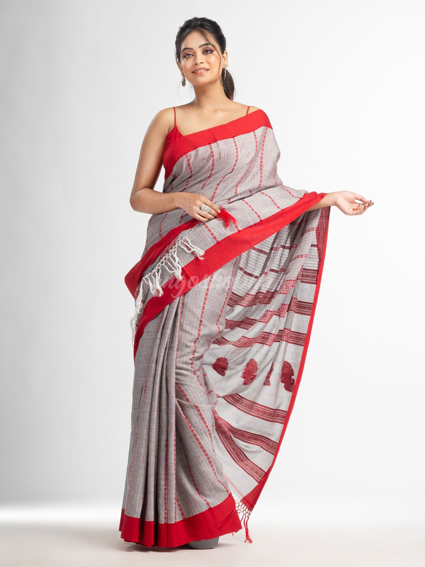 Description: Accentuate your ethnic ensemble by wearing this saree from Angoshobha.This saree from Angoshobha is a beautiful The all saree Red colour stipe & small fish design handwoven cotton saree. The saree border is solid Red color.  concocted with pallu Red color fish design , with Grey color blouse piece.Crafted in a Grey Cotton fabric .