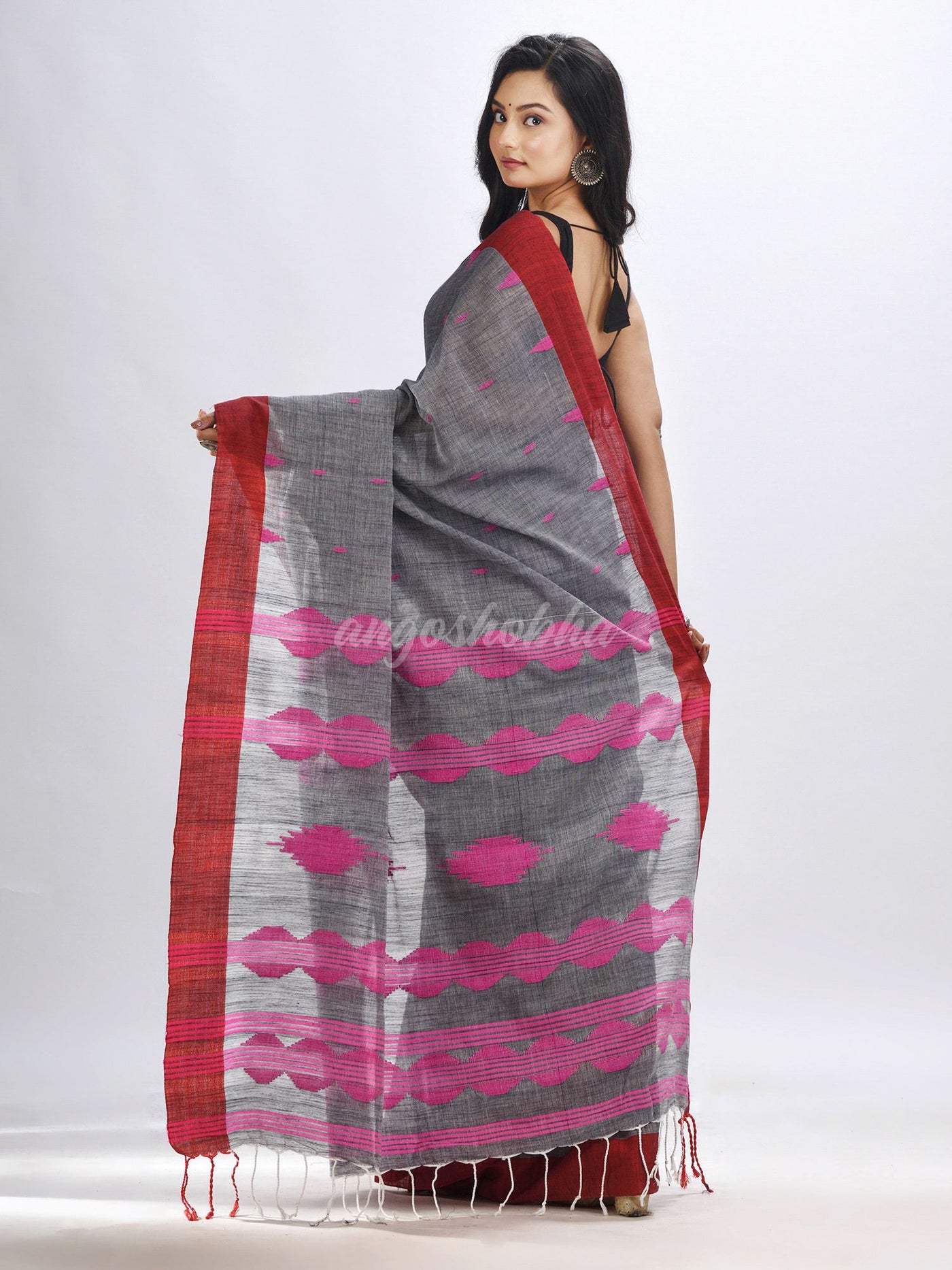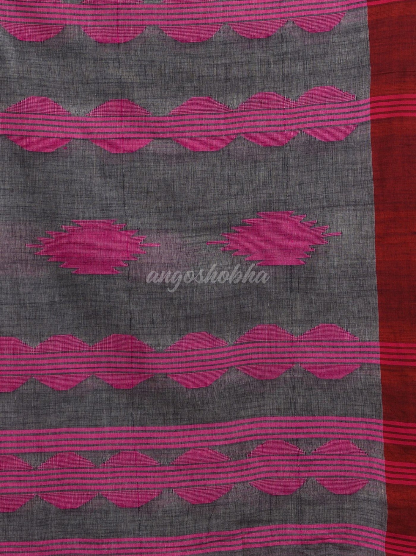 Description: Sarees have their own grace, specially this one. This saree from Angoshobha is a beautiful Grey  cotton handwoven jamdani saree. The saree all body motifs.And temple broder.With pallu Strip & motifs . The saree comes with a Grey colour running blouse piece. So collect this product and enjoy with wearing cotton  saree. Obviously you can trust on this collection. We are always with your fashion and choice.