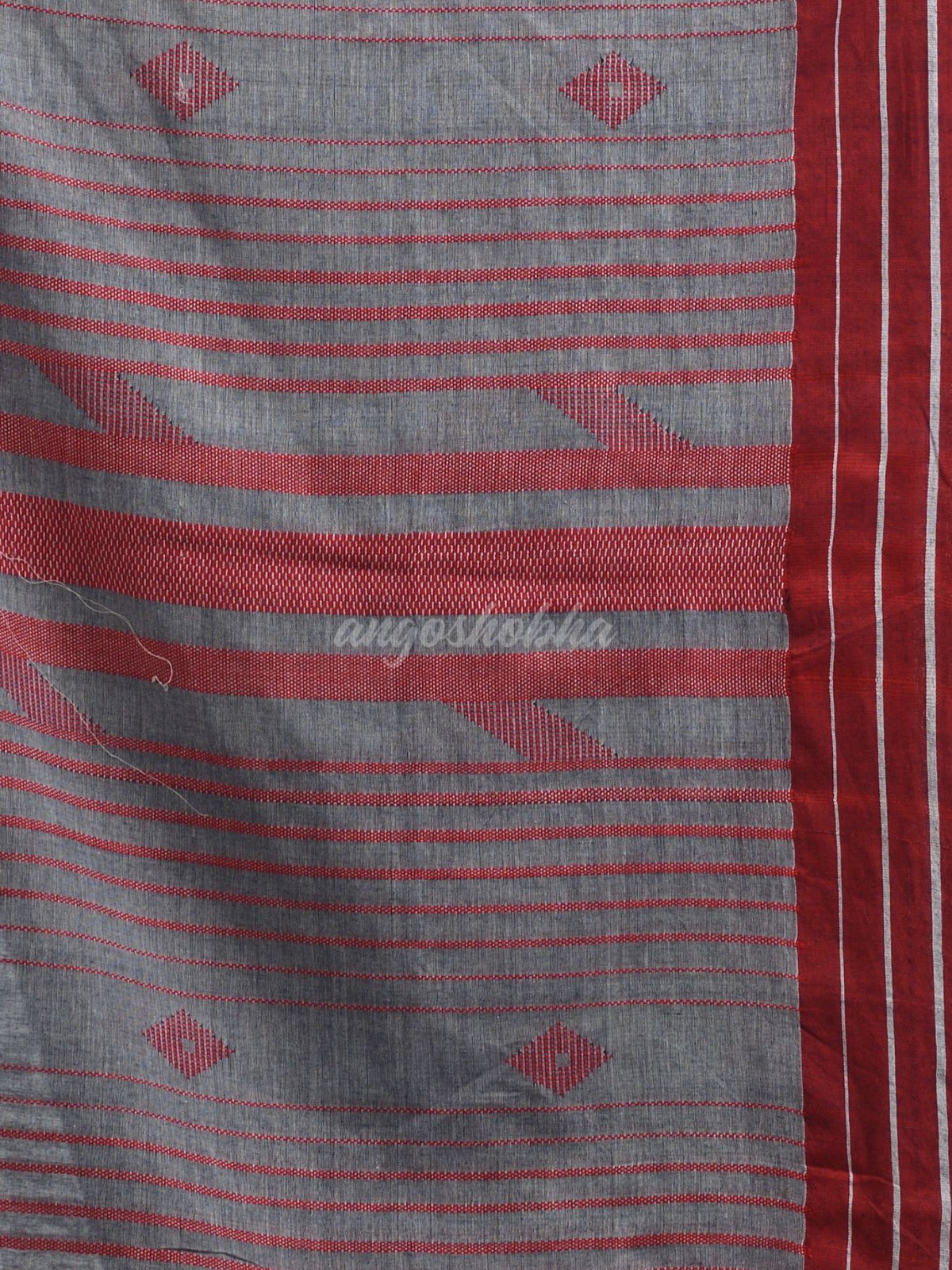Description:  This Traditional Grey cotton handwoven jamdani saree.The saree all body Maroon colour motifs. wtih multi colour border Cotton Jamdani saree is woven in grandiose to feel the freshness of tranquility. The serene  Grey overlay is embellished with self-threaded maroon It is disguised with pallu maroon colour stipe & motifs , the blouse piece which is Grey colour.