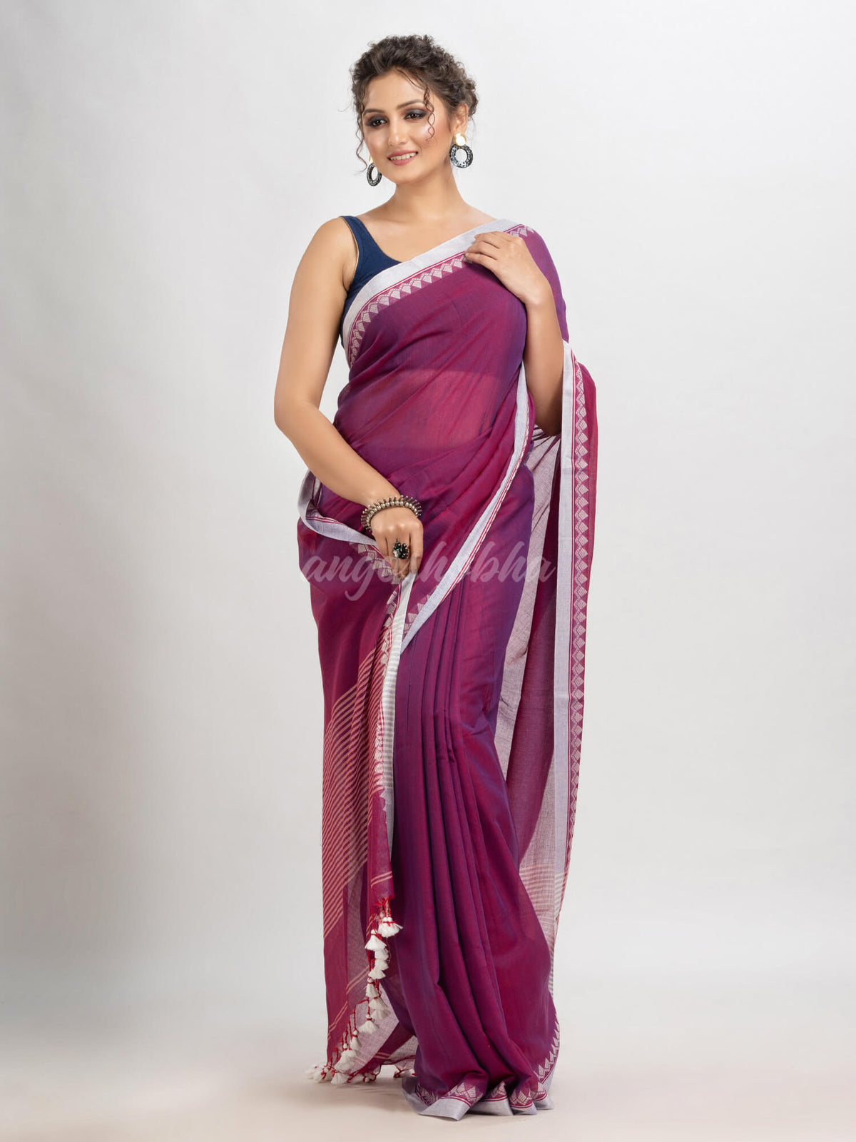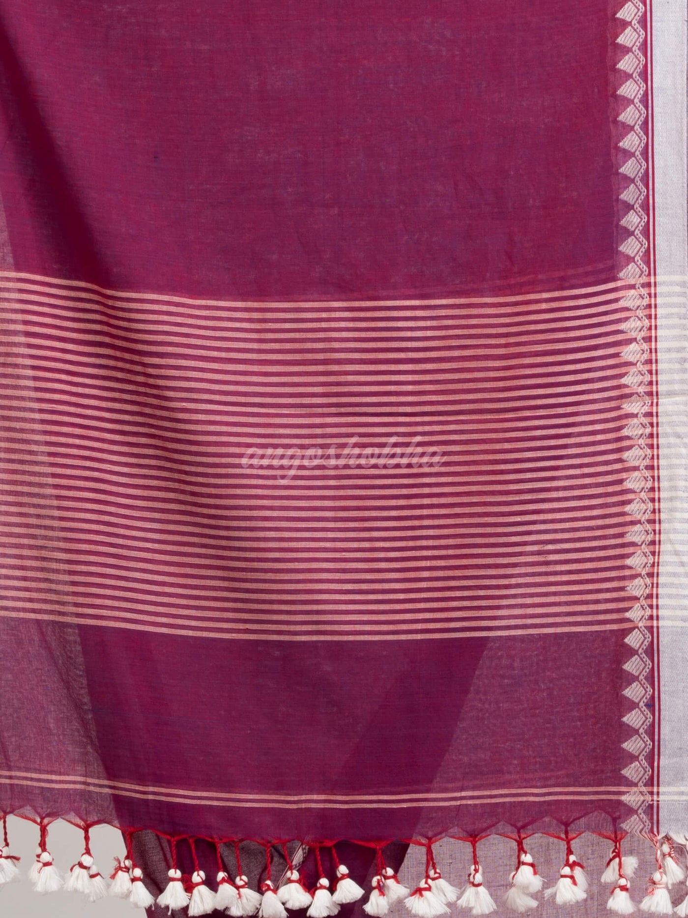 Description: Edorne your fashion and choice with our latest sari of Angoshobha.It is on of the unique sari and high quality fabric. Sarees have their own grace, specially this one. This saree from Angoshobha is a beautiful Magenta handloom saree.The saree all body solid ,With white colour jacquard temple broder.and pallu white stripe.