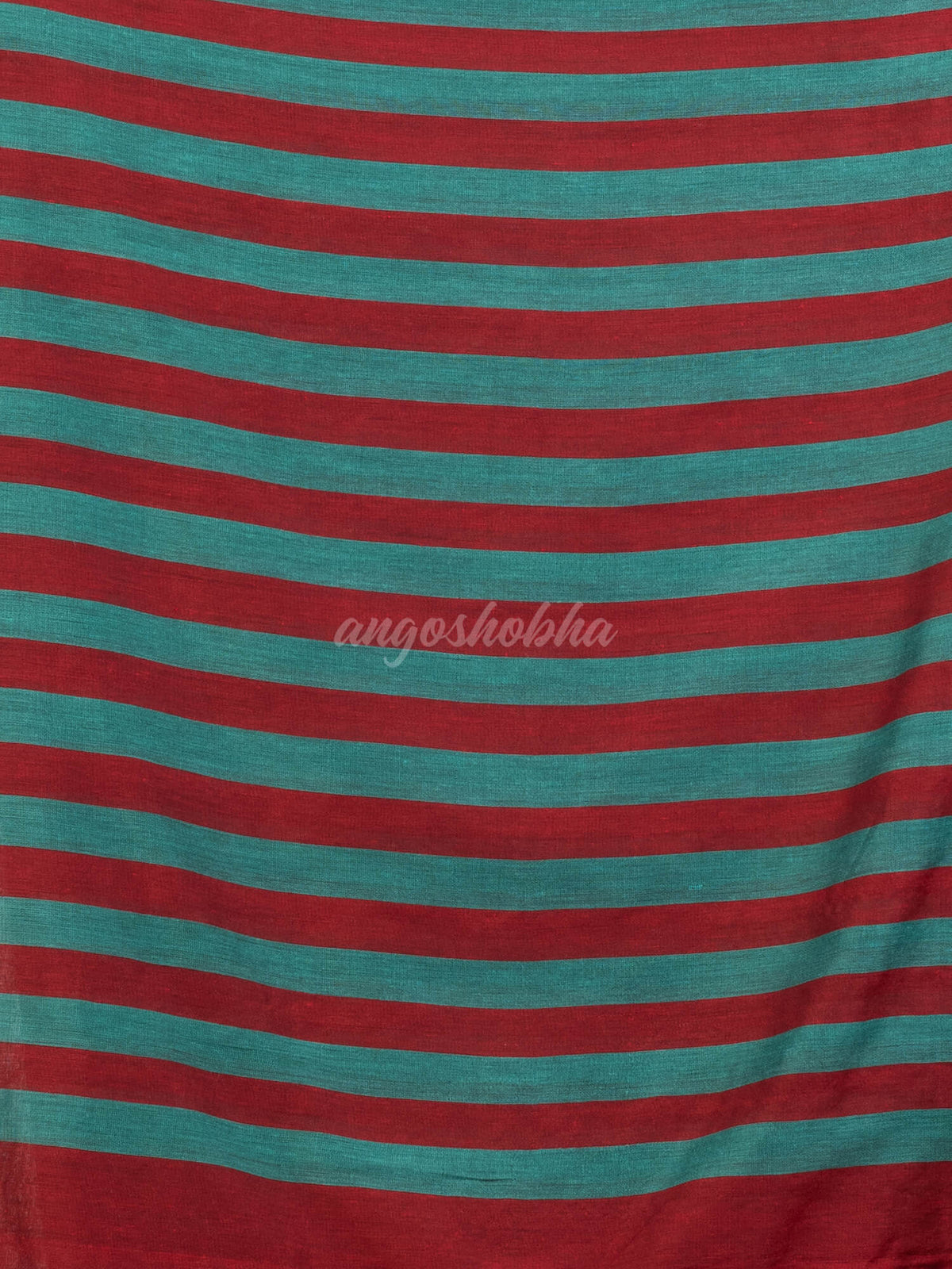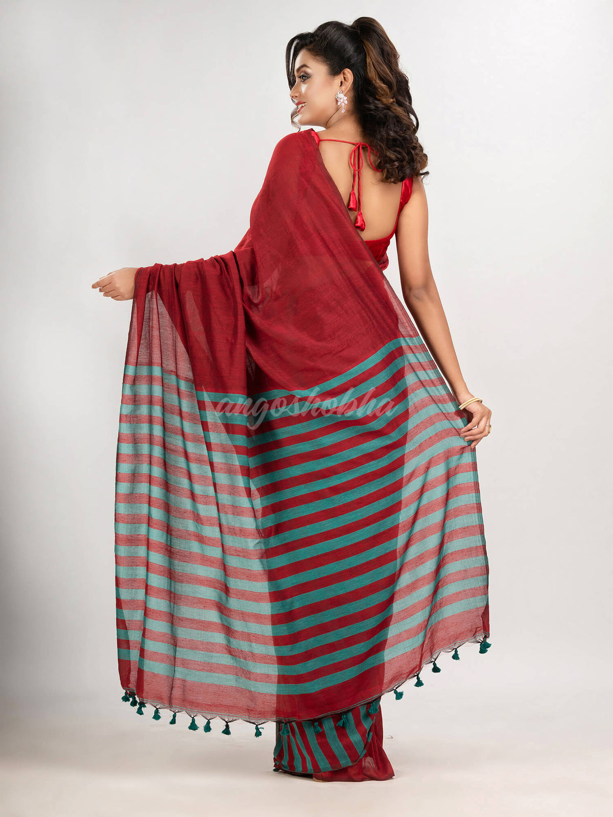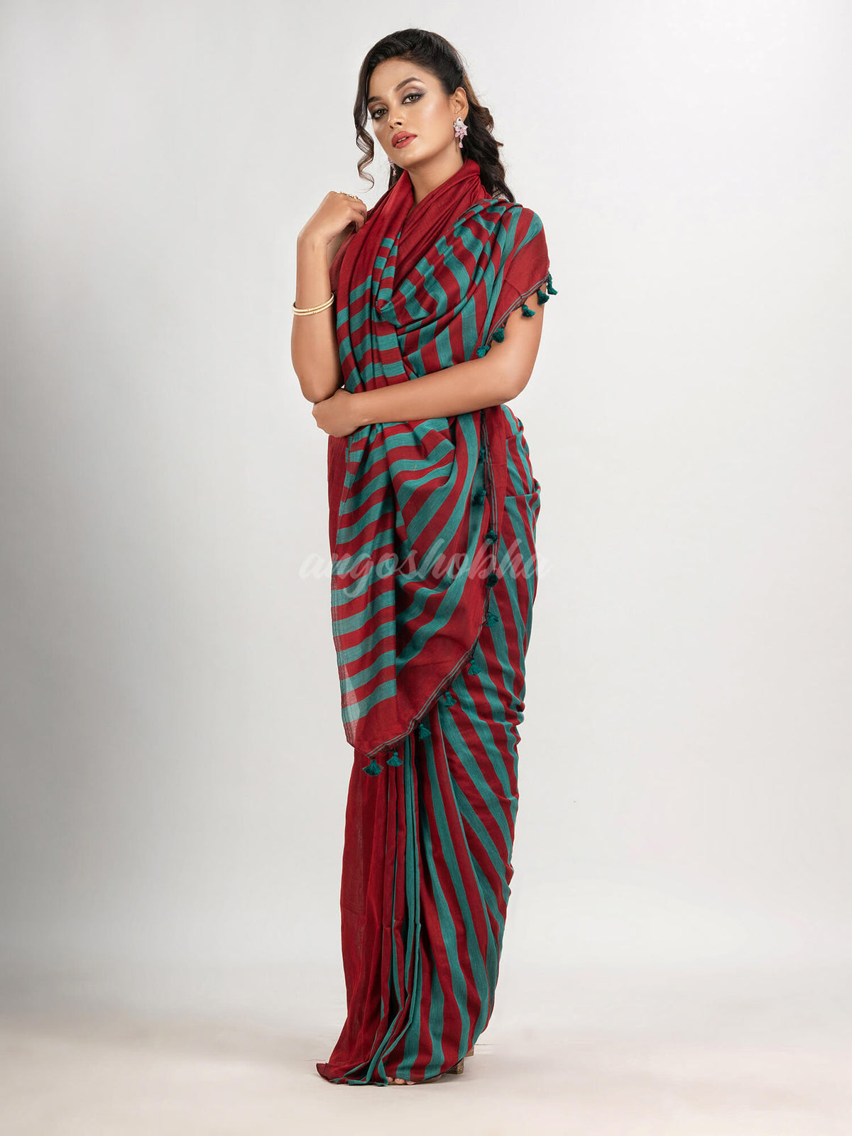 Description: Accentuate your ethnic ensemble by wearing this saree from Angoshobha. Sarees have their own grace, specially this one. This saree from Angoshobha is a beautiful maroon and aqua blue colour molmol cotton saree.The saree half body solid and half bodymaroon & aqua bulu colour stripe.with same pallu & aqua blue colour pompom added.The saree comes with a Maroon colour blouse piece.Style this saree with a pair of embellished heels and statement accessories to complete the look. Buy this saree  through online.