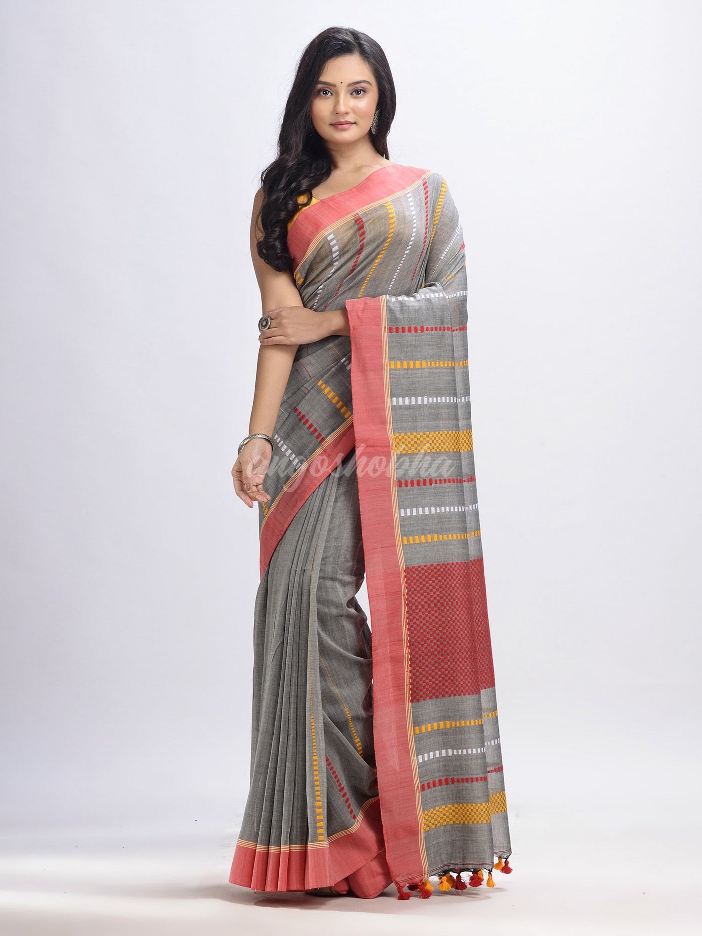 Description: Accentuate your ethnic ensemble by wearing this saree from Angoshobha. Sarees have their own grace, specially this one. This saree from Angoshobha is a beautiful Medium grey colour handwoven jamdani saree. The saree all body multi colour kantha stitch. with Red colour border, And pompom added.The saree comes with a Medium Grey colour running blouse piece.