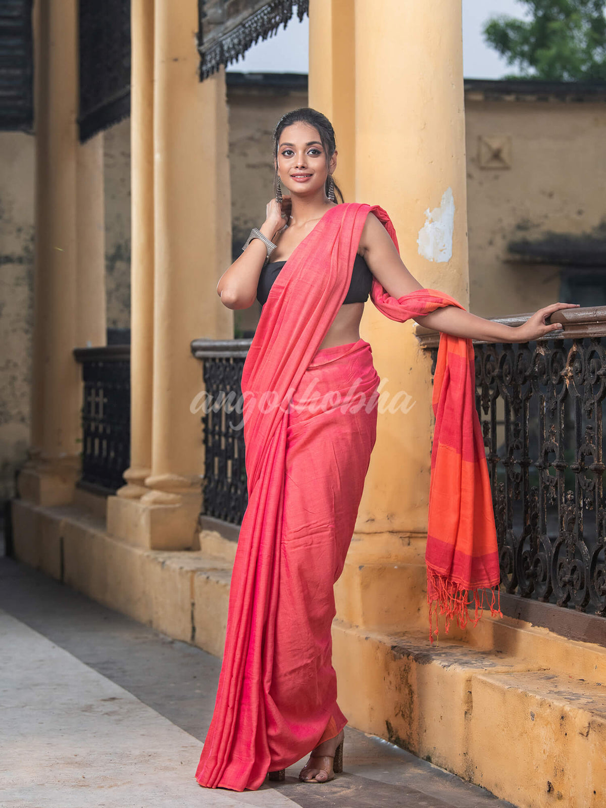 Description: Look your traditional best in this beautiful pink handloom cotton sari.It is made with cotton fabric and the hem of the sari is disguised with pink yellow combination.The border of the sari is made of mix color adjusted hand woven work.This is a handloom saree for every day wear made to make heads roll. It is so soft and very skin friendly. It is suitable to wear at any occasion and the festival moment and also daily basis. The saree comes with an attached blouse piece.This piece is handmade with love and care by various artisans.So certainly collect this sari and join with us.We are always with your fashion and choice.