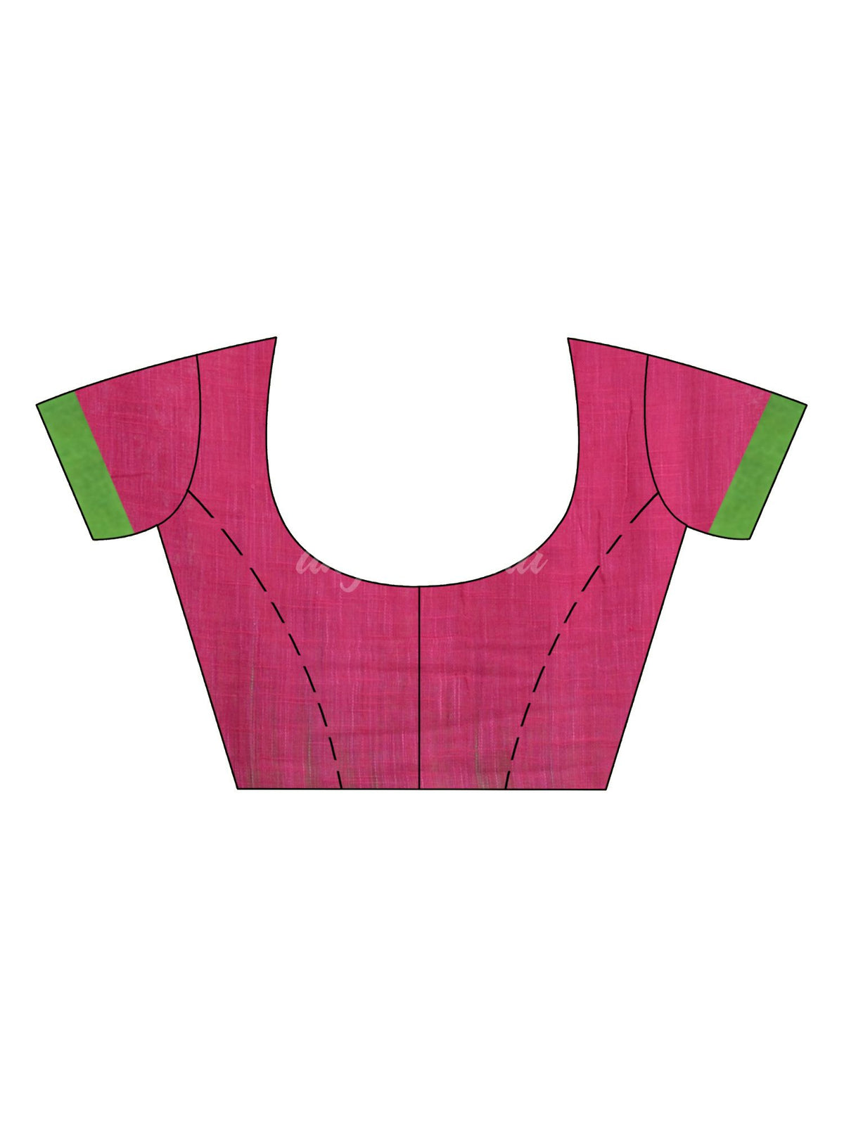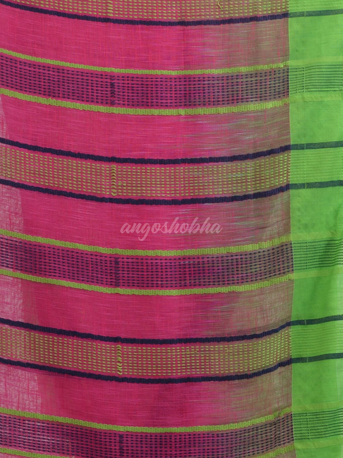 Description:  This Traditional Pink, wtih Green colour solid border handwoven  Cotton saree.The saree all body plane desige. with pallu Multi colour stipe ,and Green & Pink colour pompom aded the blouse piece which is Pink colour.