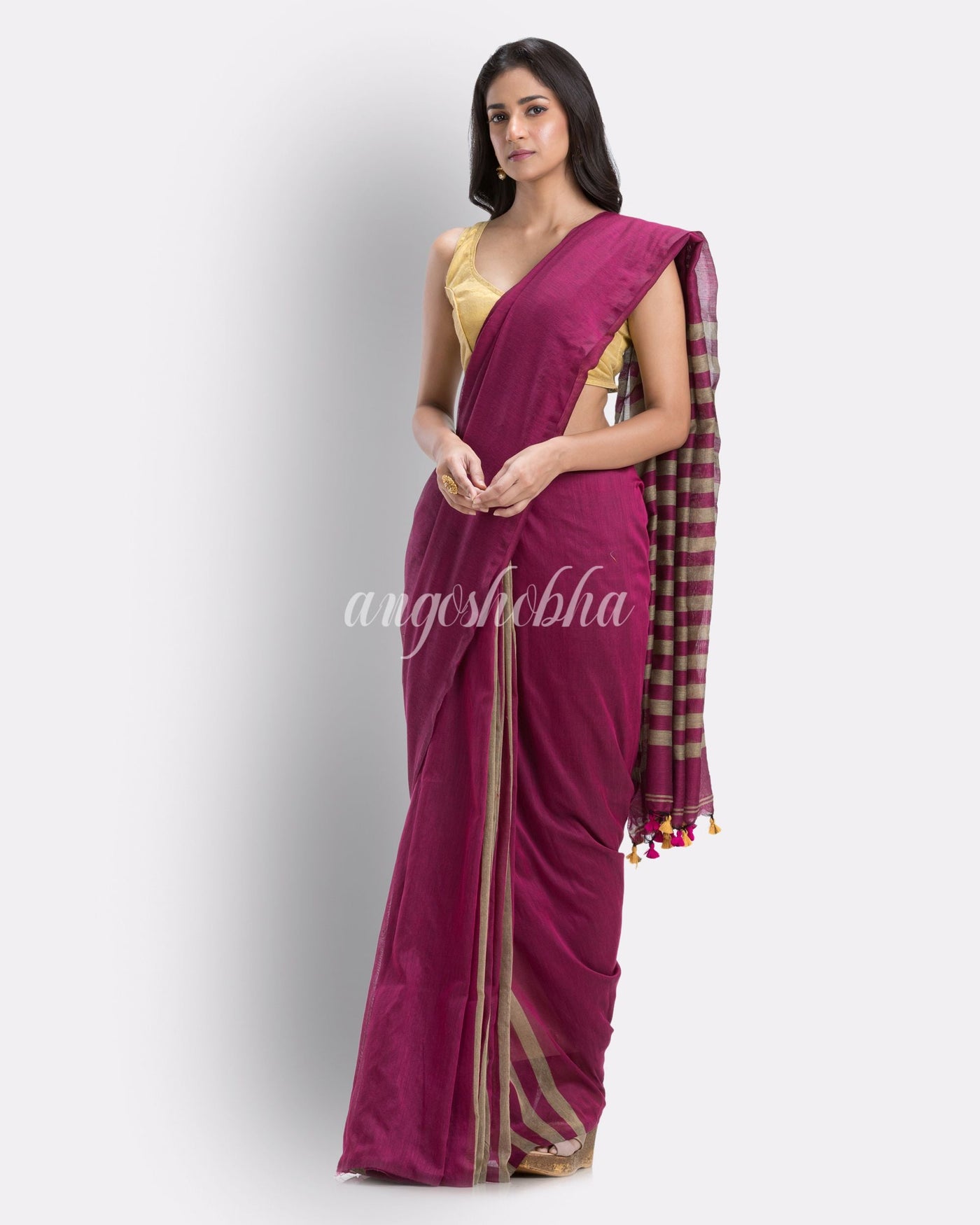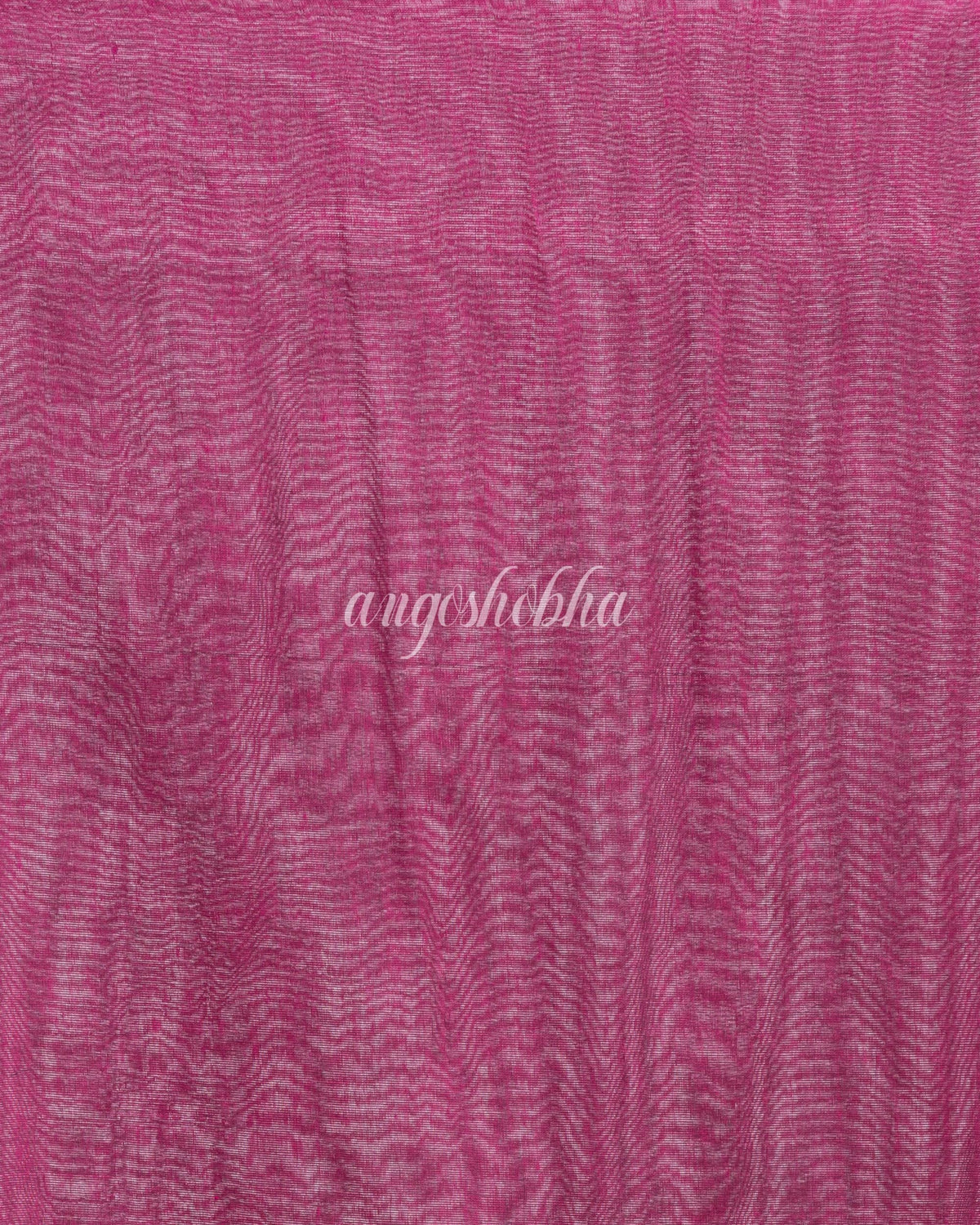 Description: Accentuate your ethnic ensemble by wearing this saree from Angoshobha. Sarees have their own grace, specially this one. This saree from Angoshobha is a beautiful pink handloom saree with handwoven all over. It comes with a vibrant pink and silver grey stripes pallu and an attached blouse piece. Crafted in a soft mol mol cotton fabric, this beauty gives the most comfortable fit. Style it with minimal jewellery and high heels to slay the ethnic look.You can wear anywhere and any festival moment with wonderful enjoyment.So collect this product and enjoy with wearing cotton saree. Obviously you can trust on this collection. We are always with your fashion and choice.Colour hues may slightly vary from that which appears in the image