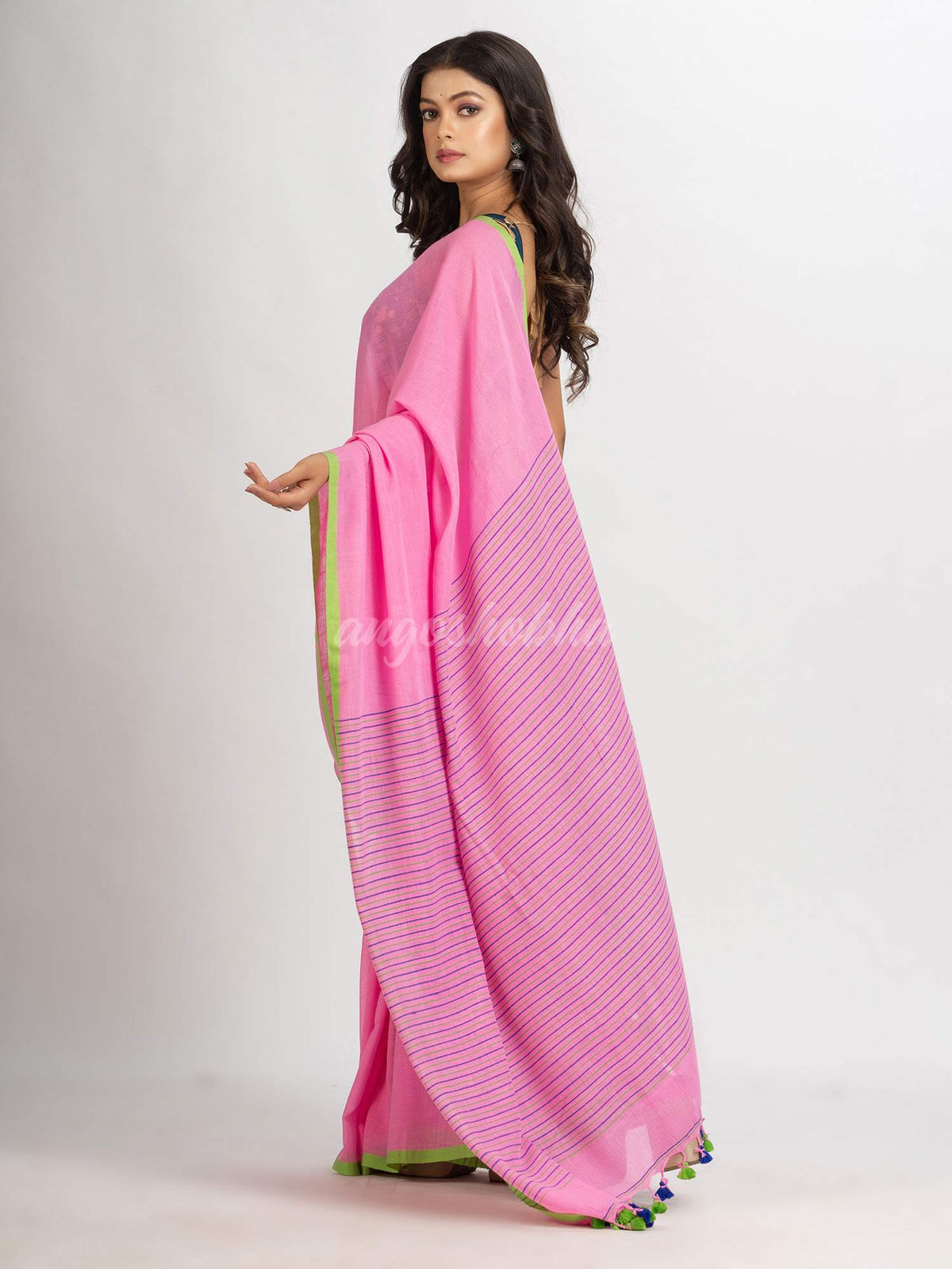 Description: Accentuate your ethnic ensemble by wearing this saree from Angoshobha. Sarees have their own grace, specially this one.This saree from Angoshobha is a beautiful Pink hand loom saree with handwoven cotton stipe work.With green border andpallu stipe &pompom added The hem of the saree is disguised with pink color plain desige fit. Style of it with minimal jewellery and high heels to slay the ethnic look.You can wear anywhern and an attached blouse piece. Crafted in a cotton fabric, this beauty gives the most comfortable and any festival moment with wonderful enjoyment.So collect this product and enjoy with wearing cotton saree. Obviously you can trust on this collection. We are always with your fashion and choice