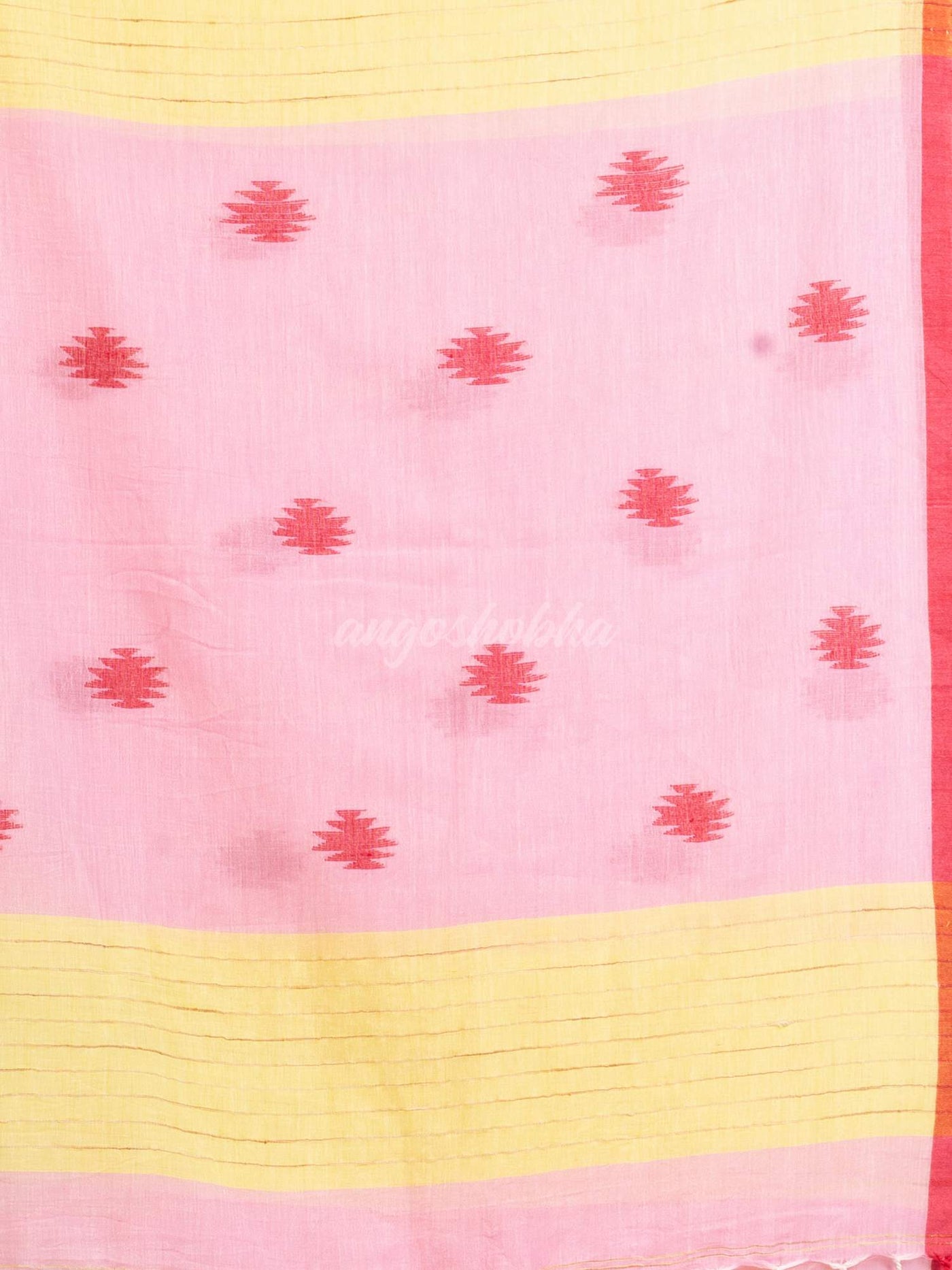 Description: Accentuate youethnic ensemble by wearing this saree from Angoshobha.This saree from Angoshobha is a beautiful The saree all body  Pink & Yellow colour stipe. The border of the saree is red.  concocted with pallu Red buti .  Pink & Red pompom added, with Red  colour blouse piece.Crafted in a Cotton fabric