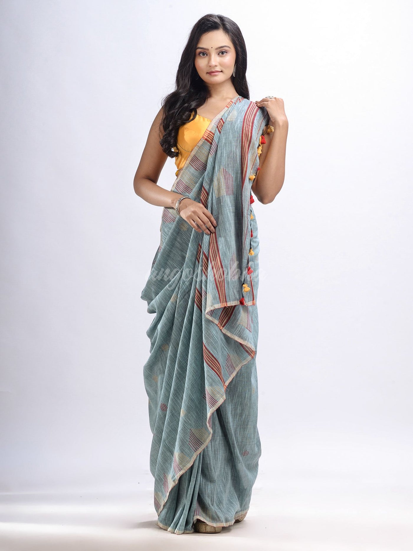 Description: Sarees have their own grace, specially this one. This saree from Angoshobha is a beautiful pool  cotton handwoven jamdani saree. The saree all body motifs.And temple broder.With pallu Strip & motifs . The saree comes with a pool colour running blouse piece. So collect this product and enjoy with wearing cotton  saree. Obviously you can trust on this collection. We are always with your fashion and choice.