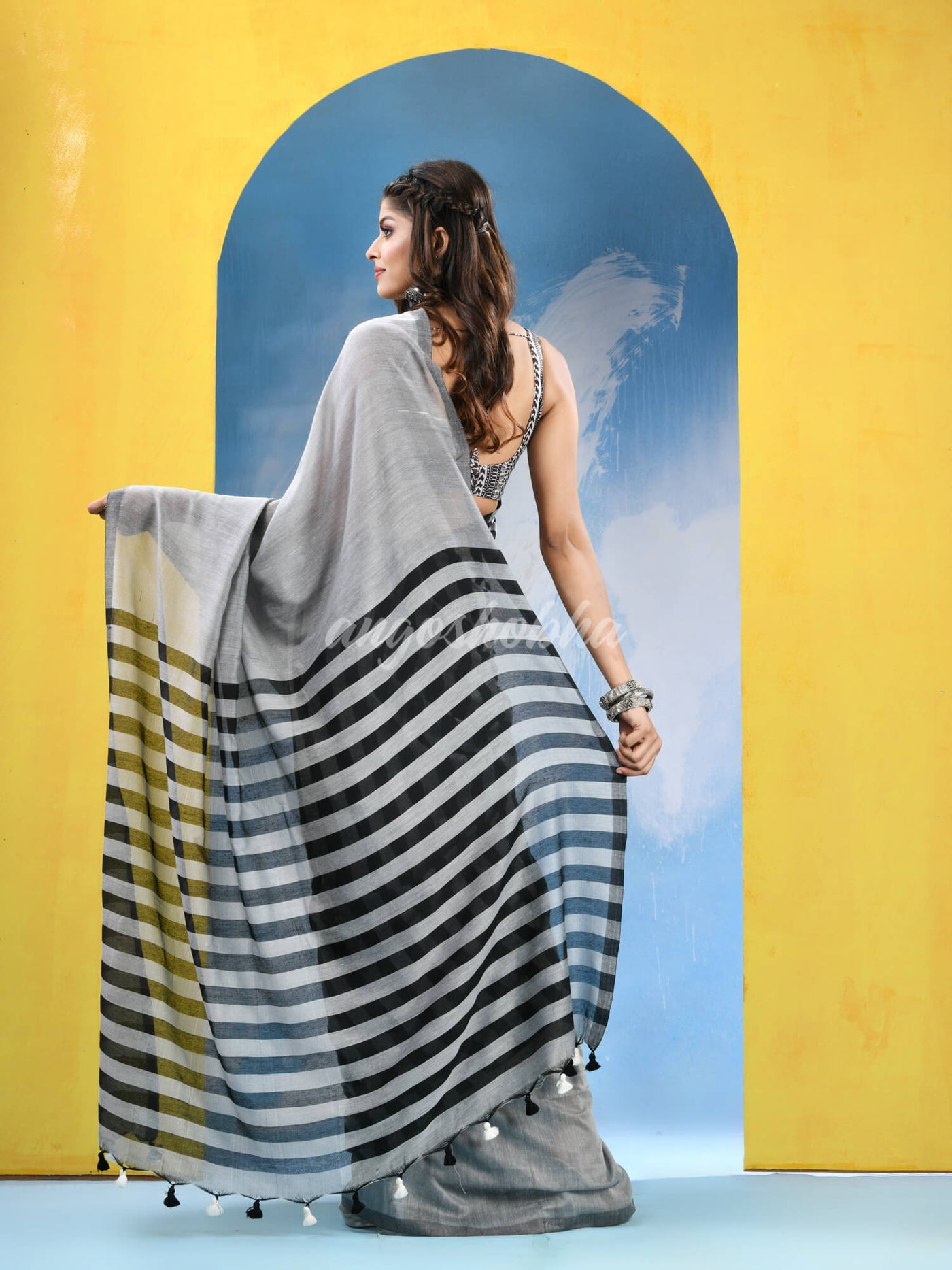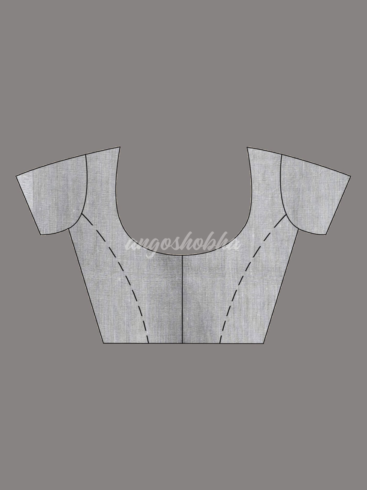 DESCRIPTION: Add a vibrant burst of colour to your wardrobe with the enchanting Silver handloom saree.The saree is made of cotton fabric beautified with wonderful hand woven molmol  and the hem of the saree is hatched with Silver and Black combination .It is attached with a blouse piece.Suitable to wear for casual outing,social meet,festival etc.So buy this saree now until finishing the stock.