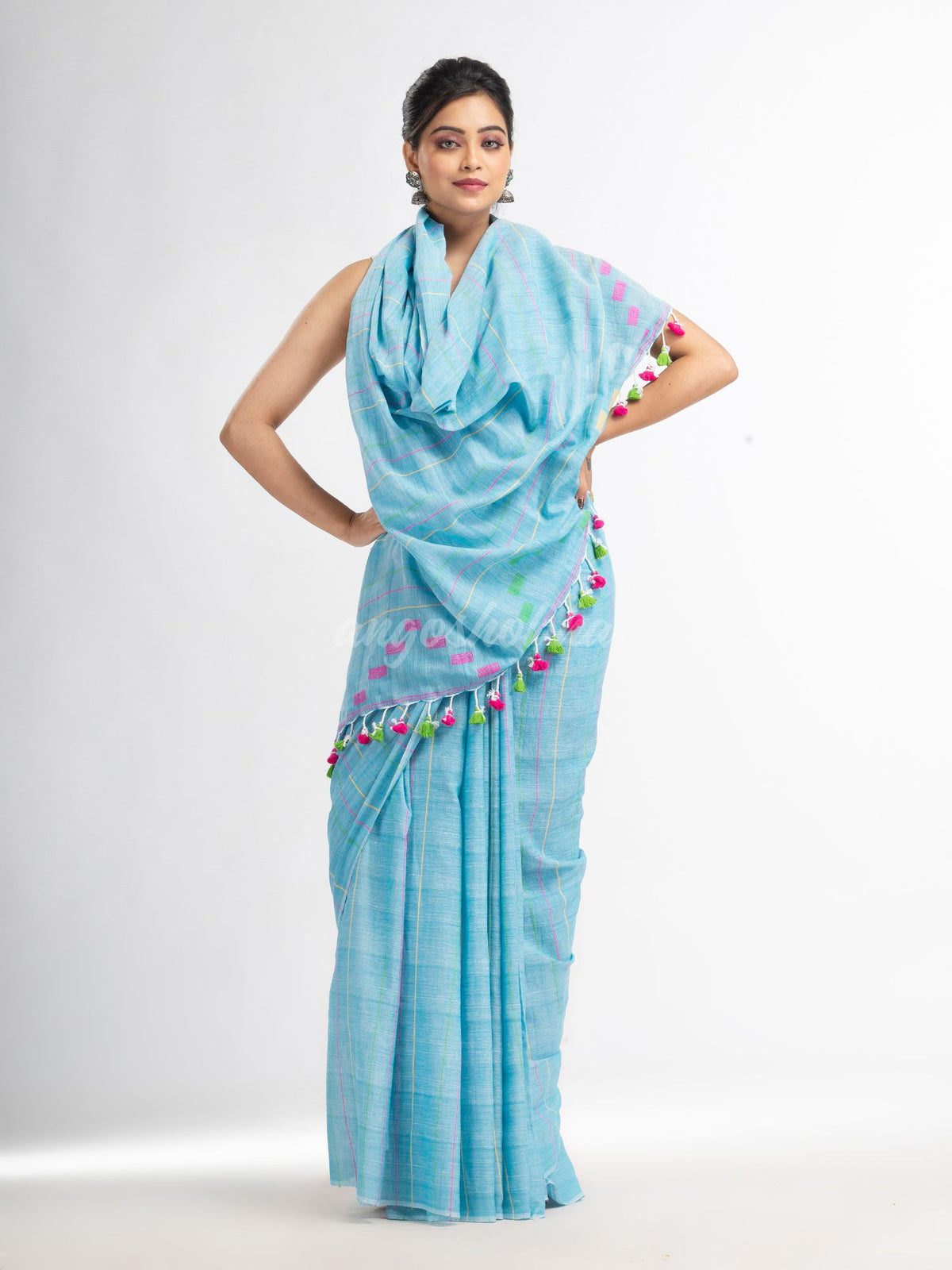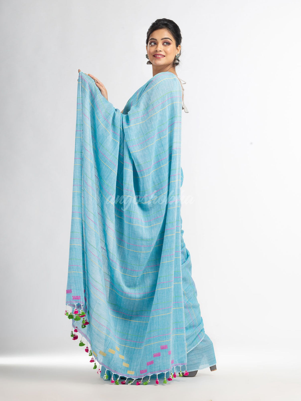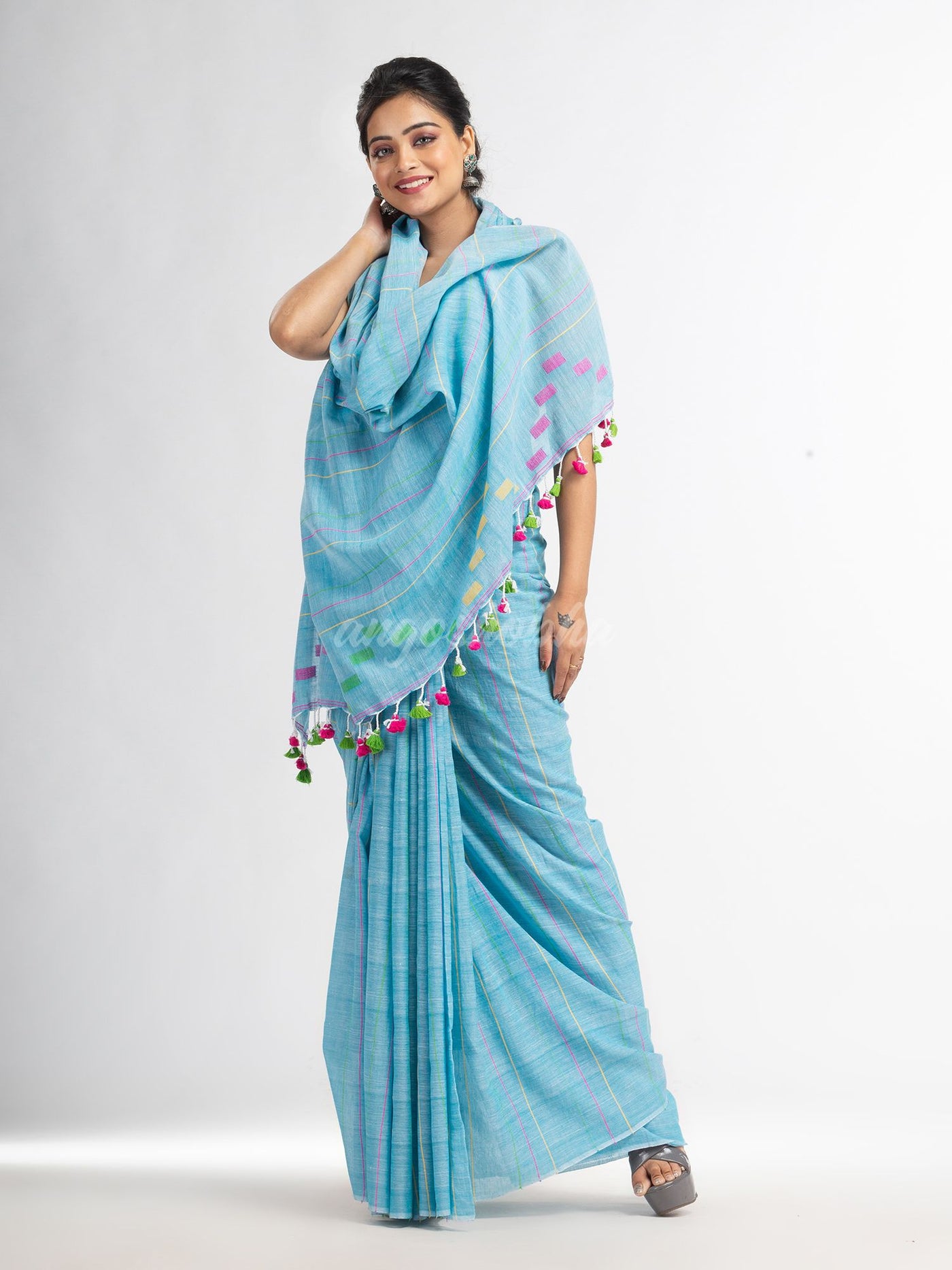 Dscription:  Angoshobha’s ethnic saree comes with an unstitched blouse piece, which can be stitched according to your taste and preference.  This Sky Cotton all body multi colour stipe with pallu Yellow , pink & Green buti jamdani saree is crafted by skilled craftsmen using high qeuality blended cotton fabric without compromising on its quality. Saree is very comfortable in summer and suitable for festivals. this saree and blouse set will fetch you Oodles of compliments and praises Colour hues may slightly vary from that which appears in the image