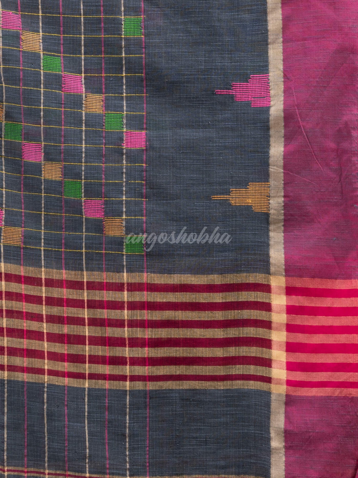 Steel grey cotton all body check and buti with pallu buti in solid broder handloom saree