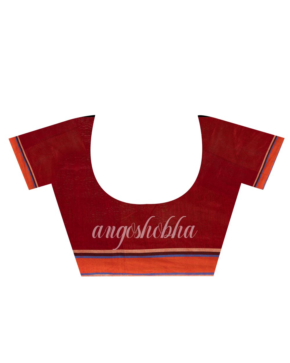 Description: Accentuate your ethnic ensemble by wearing this saree from Angoshobha. Sarees have their own grace, specially this one.This saree from Angoshobha is a beautiful olive green handloom  cotton blend saree plain work all over.The border of the sari is disguised with orange color.The hem of the sari is disguised with olive green,red and golden stripes attached with blouse piece.Crafted in a cotton blend fabric, this beauty gives the most comfortable fit. Style of it with minimal jewellery and high heels to slay the ethnic look.You can wear anywhere and any festival moment with wonderful enjoyment.So collect this product and enjoy with wearing cotton blend saree. Obviously you can trust on this collection. We are always with your fashion and choice.