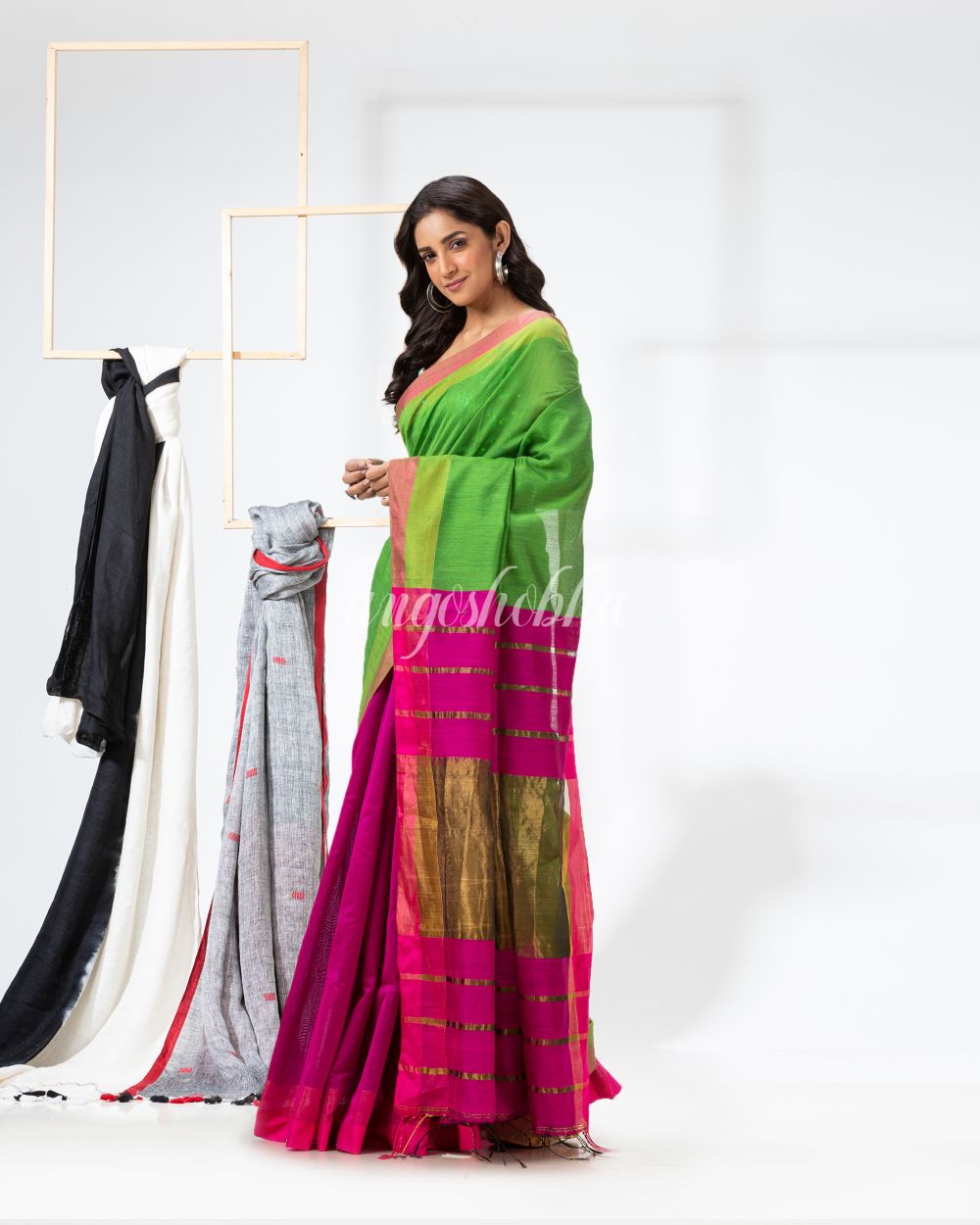 Description: Add a vibrant burst of color to your wardrobe with the enchanting green pink hand loom sari.The sari is made of cotton blend fabric beautified with wonderful handwoven work.The sari is included pastel red border.The hem of the sari is hatched with multi color stripes.The body of the sari is concocted with green pink color.It is attached with a blouse piece.Suitable to wear for casual outing,social meet,festival etc.So buy this sari now until finishing the stock.