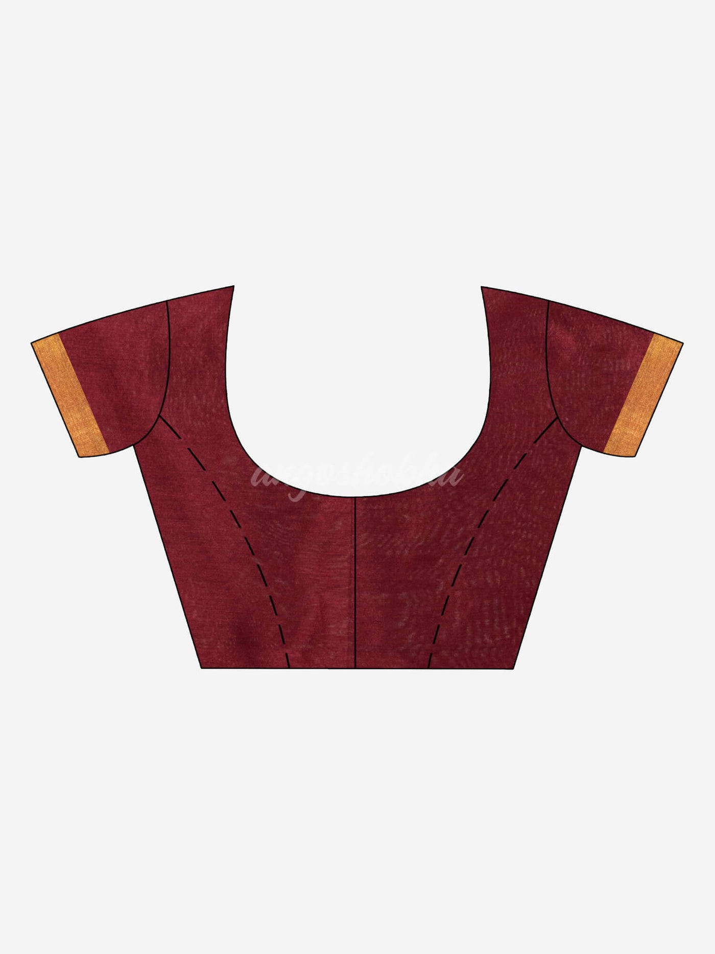 DESCRIPTION: Get in touch with your traditional Indian culture with this handwoven handloom saree by Angoshobha. Curated with premium cotton blend fabric  material, this Maroon  coloured saree features detailed thread work on it giving you a sense of home. It has ghicha and maroon colour hem and pair this piece with huge chandbalis to give your ethnic look a finishing touch. This saree comes with an attached blouse piece.Border is disguised with golden color.