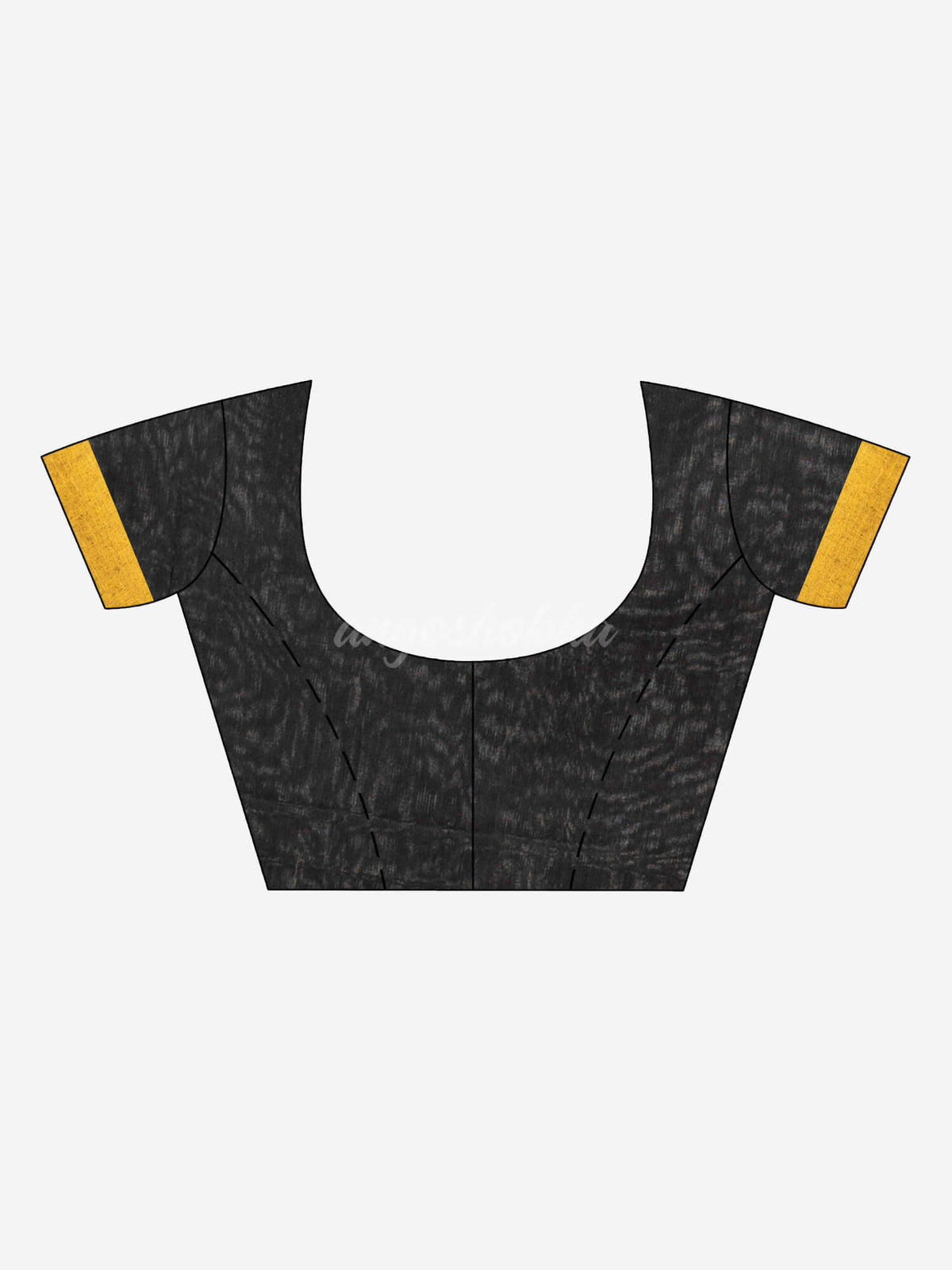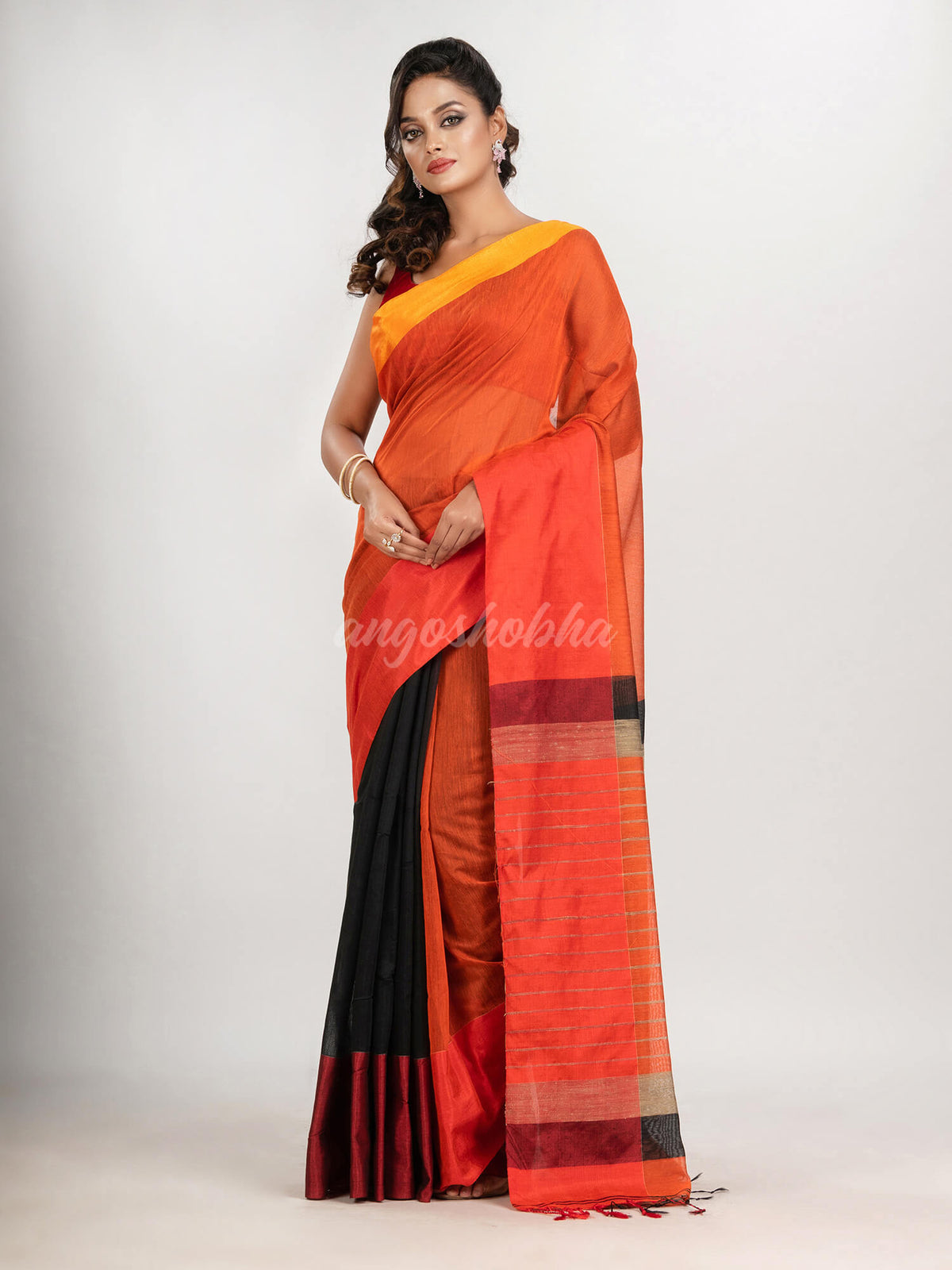 Description: Accentuate your ethnic ensemble by wearing this saree from Angoshobha. Sarees have their own grace, specially this one. This saree from Angoshobha is a beautiful Orange & Black colour half and half handloom saree . The saree all body solid.The saree is Ganga Jamuna solid border.The saree pallu is golden zari colour strip on orange. and an attached Black colour blouse piece. Crafted in a soft cotton bend fabric, this beauty gives the most comfortable fit. Style it with minimal jewellery and high heels to slay the ethnic look.You can wear anywhere and any festival moment with wonderful enjoyment.So collect this product and enjoy with wearing cotton saree. Obviously you can trust on this collection. We are always with your fashion and choice.