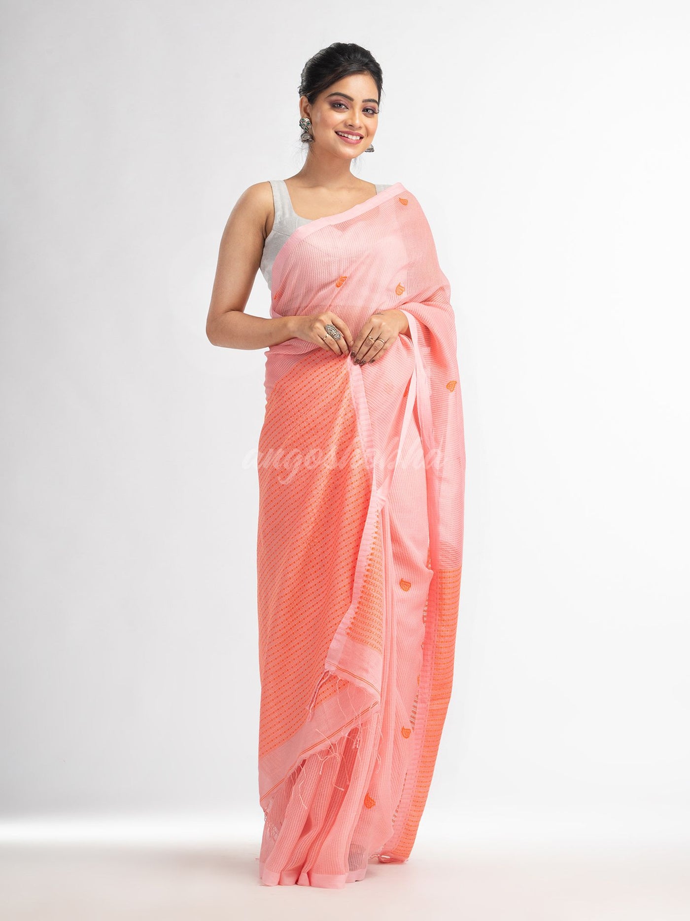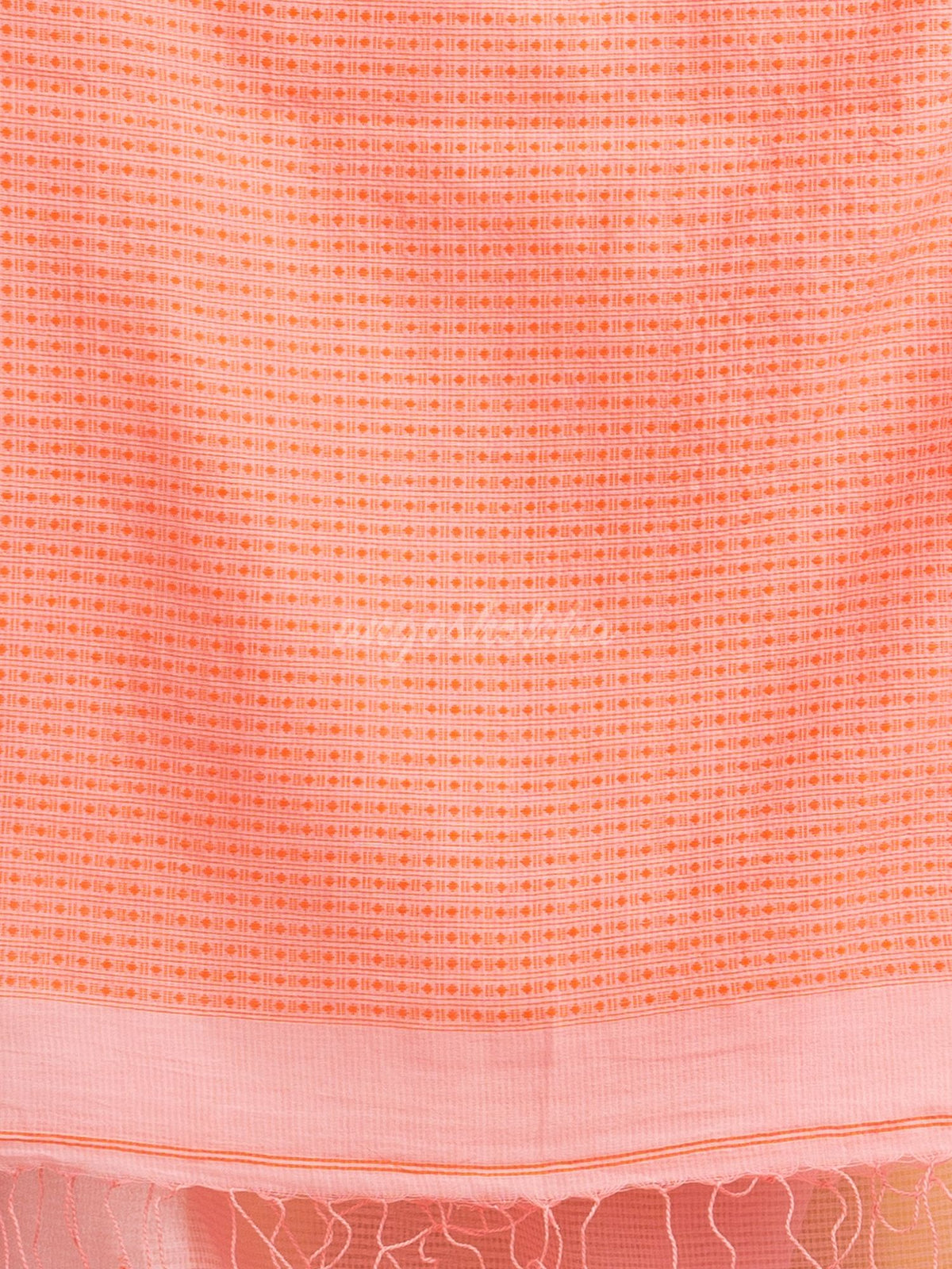 Description : Cotton is spun into yarn which is used to make different types of textiles. Cotton is the most widely used cotton Silk fiber used for making textiles and is grown in many states of India.this  cotton Peachmod kota jacquard  handwovon saree.The border of the saree is lPeachmod  .The all body kota check of the saree is completely covered with Red colour motifs.it is attached with Peachmod colour blouse picec. working the jacket on the hem of the saree.