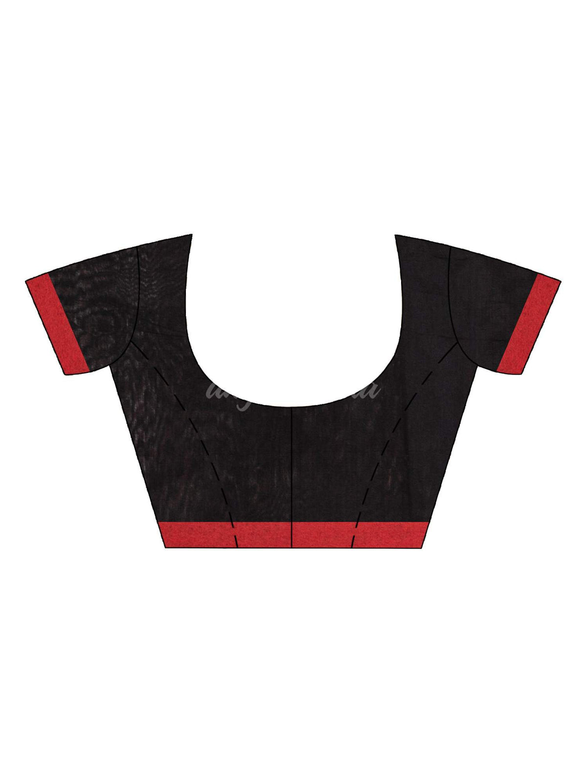Description : Cotton is spun into yarn which is used to make different types of textiles. Cotton is the most widely used cotton blend fiber used for making textiles and is grown in many states of India.this Red cotton blend handloom jacquard  handloom saree.The border of the saree is red.The body of the saree is completely coveredwith lolka.it is attached with ablack colour blouse picec.with pallu black & cream colour plane design.