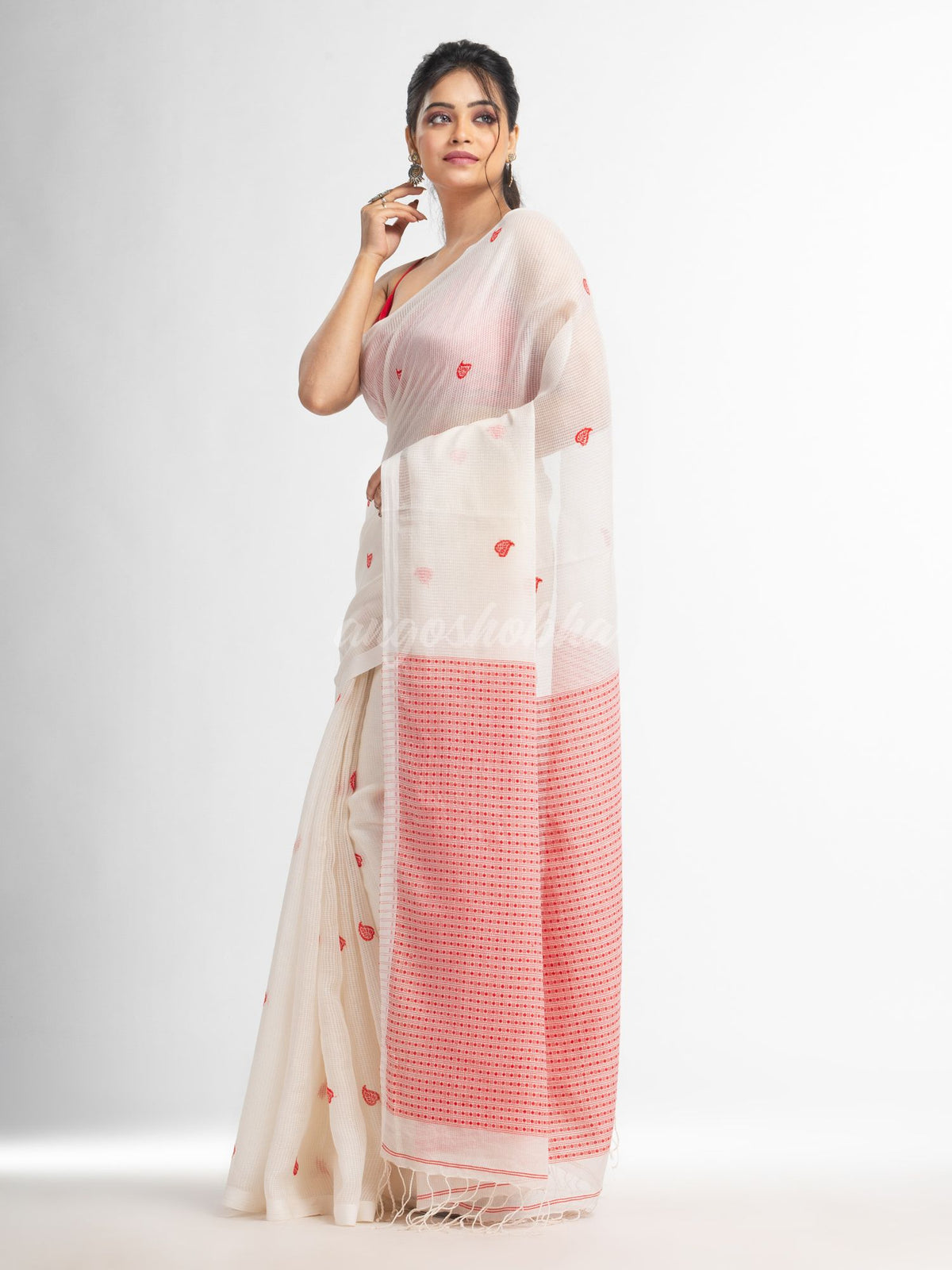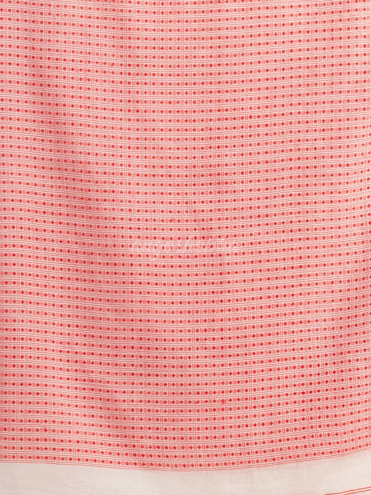 Description : Cotton is spun into yarn which is used to make different types of textiles. Cotton is the most widely used cotton Silk fiber used for making textiles and is grown in many states of India.this  cotton White kota jacquard  handwovon saree.The border of the saree is white .The all body kota check of the saree is completely covered with Red colour motifs.it is attached with white colour blouse picec. working the jacket on the hem of the saree.