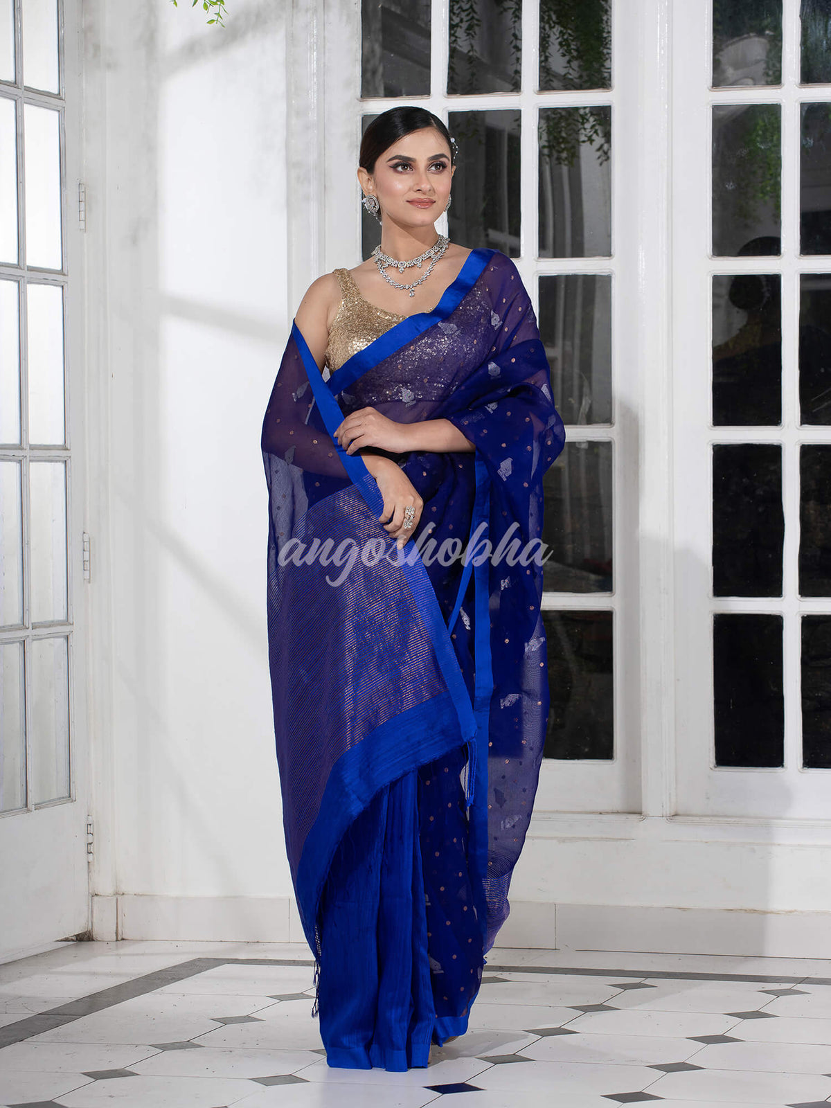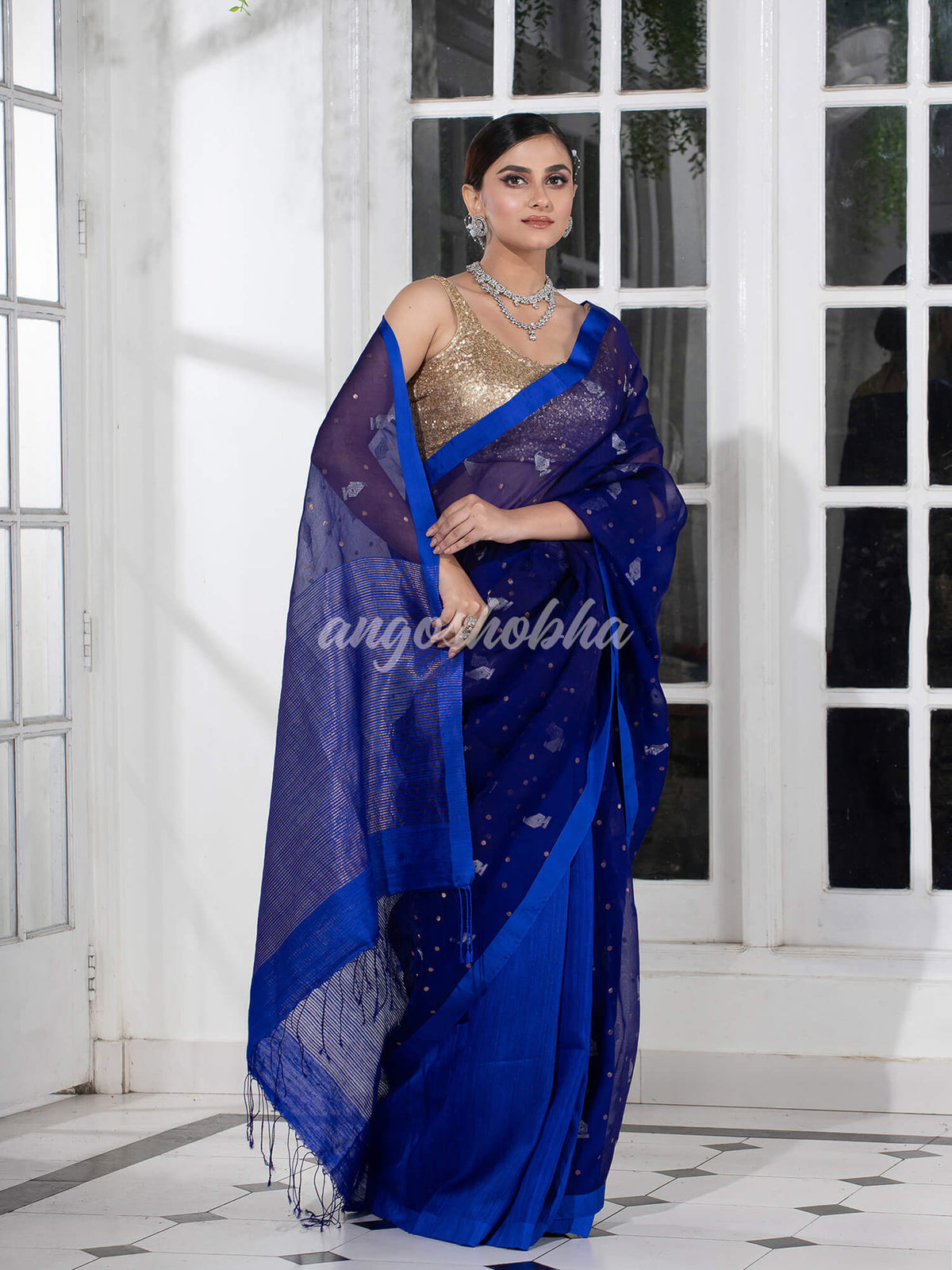 Description : Effortlessly stand out with the Blue Half Half Matka Silk Handwoven Saree! The blue hue is the perfect for the contemporary looks and informal occasions, while silk fabric is soft and easy to drape. The body feature has been embellished with small sequins adjoined the unique motifs. The border is fascinated with the plain blue color. A running blouse piece is attached with it. It is very comfortable to wear at the puja vacation and the party,