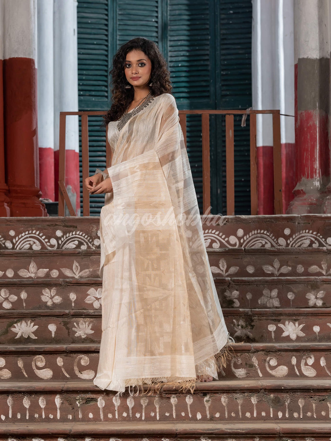 Description: Accentuate your ethnic ensemble by wearing this saree from Angoshobha. Sarees have their own grace, specially this one.This saree from Angoshobha is a beautifu off white colour handwoven silk matka saree. The saree all body golden zarie colour strik . with self border. and pallu Jacquard work. The saree comes with a off White colour running blouse piece. You can wear any festival moment with wonderful enjoyment. so collect this product and enjoy with werring silk matka saree.