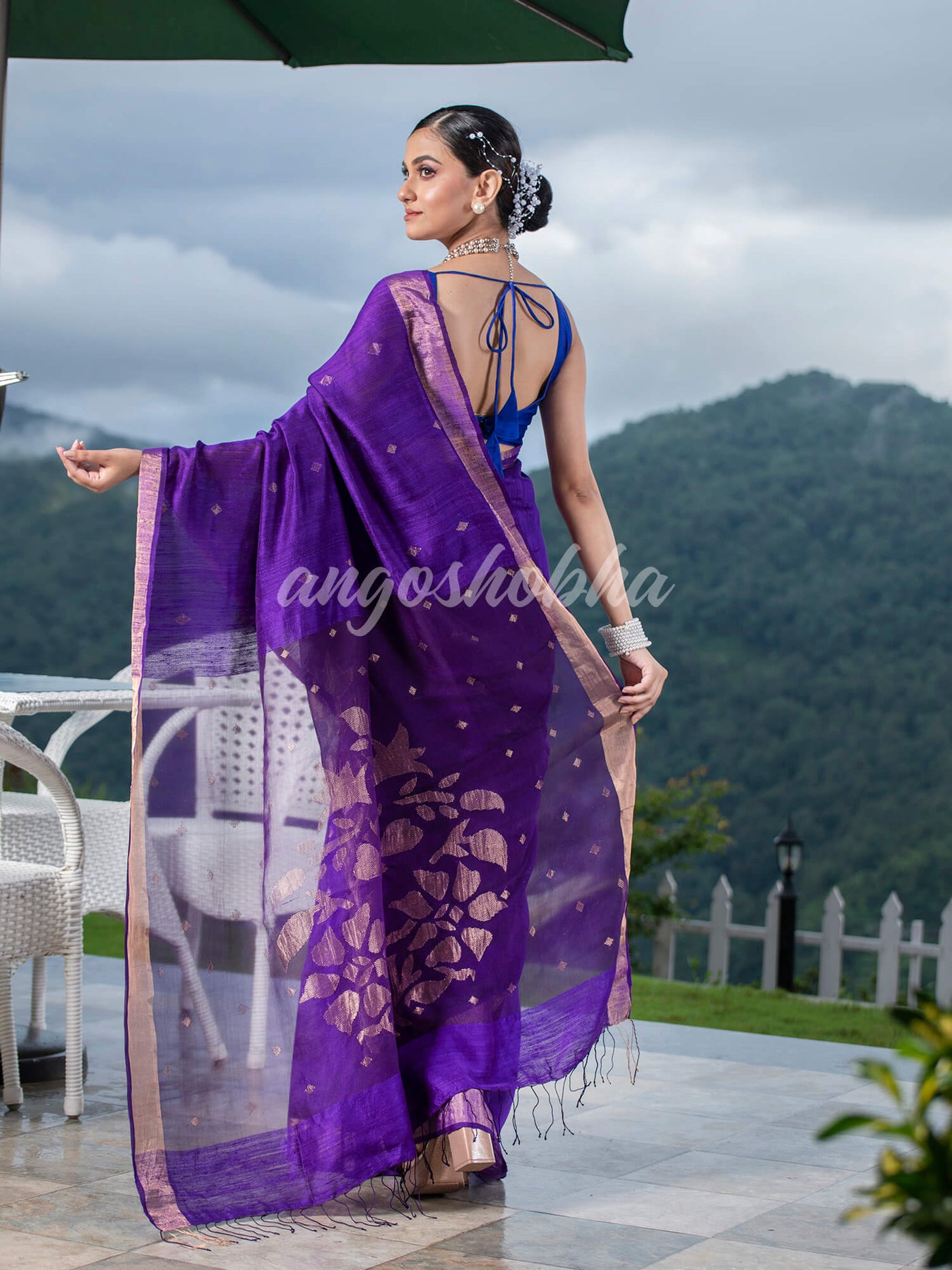 Description :This Purple Matka Silk Light Golden Border Handwoven Saree offers a pure matka silk fabric golden zari motifs texture on the body part and subtle elegance. It features the unique, slubby feel of hand-spun Matka silk in a regal purple hue, beautifully framed by a delicate, understated light golden border, all meticulously handwoven for a truly authentic feel. The border belongs to the plain golden zari working . The hem of the saree is made intricate floral design with light golden zari working  and attached with a running blouse piece.