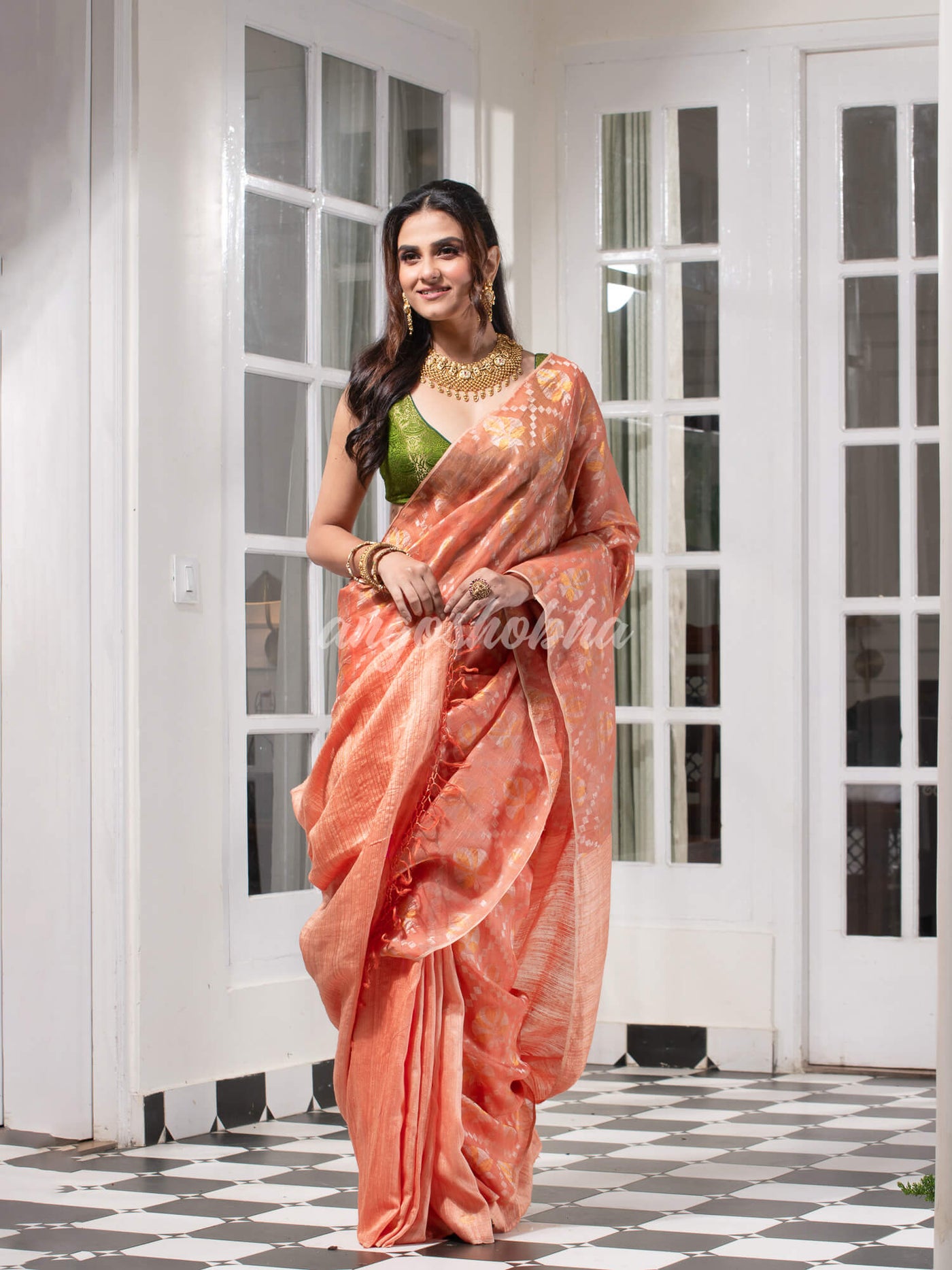 Description: This Peach color Matka Silk saree is made with soften pure matka fabrics. It looks natural for the creativity of the expert artisans. Intricate stunning motifs bestowed an excellent glory of the saree. The hem is synchronized with peach silk matka & golden check. The blouse piece is attached with this master piece. Browse our latest collection today and find your perfect matka drape that matches your style and spirit.