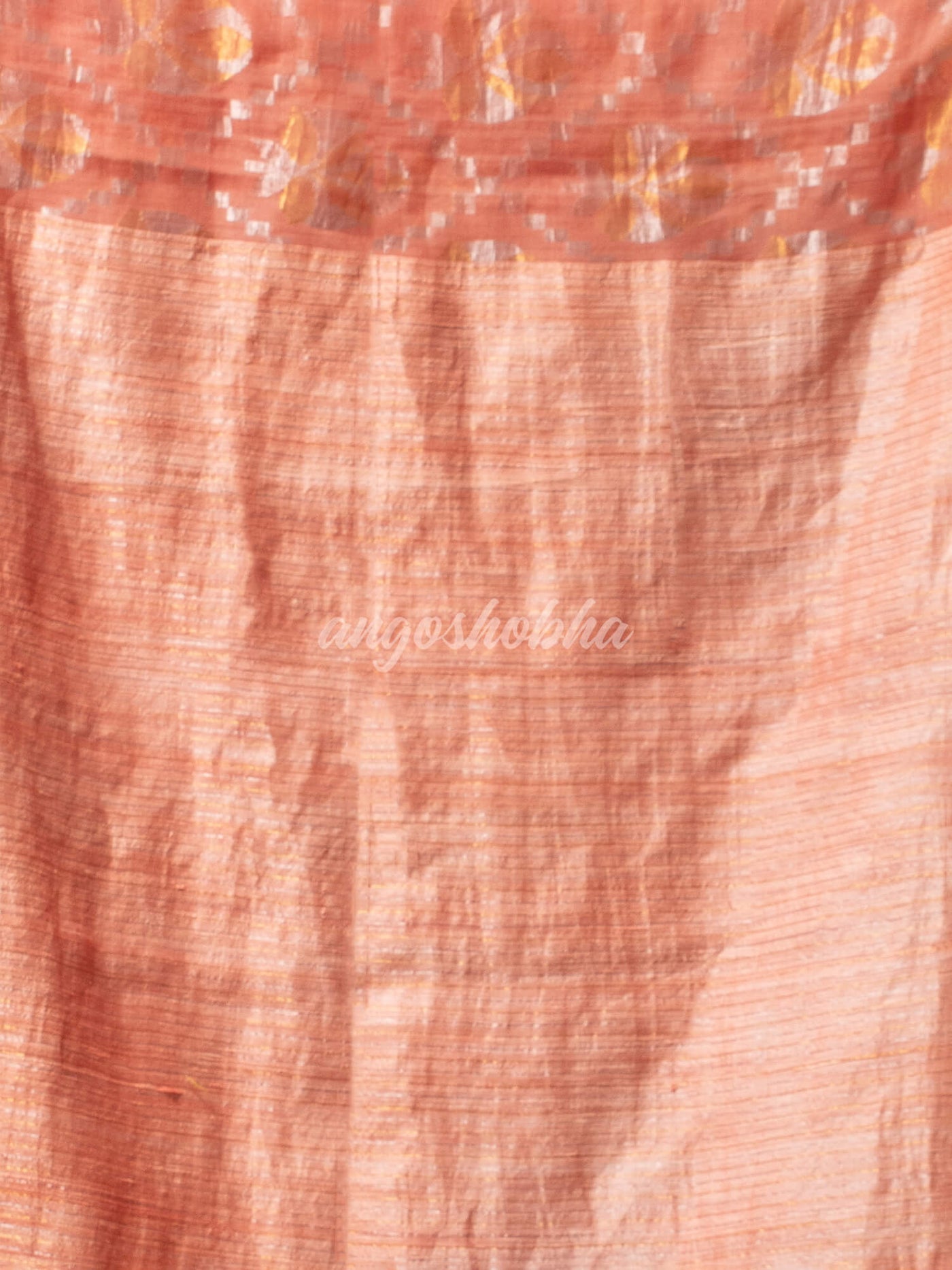 Peach Silk Matka Body with Leaves Intricate Design including Silver & Golden Stripes on Check Pallu Handwoven Saree