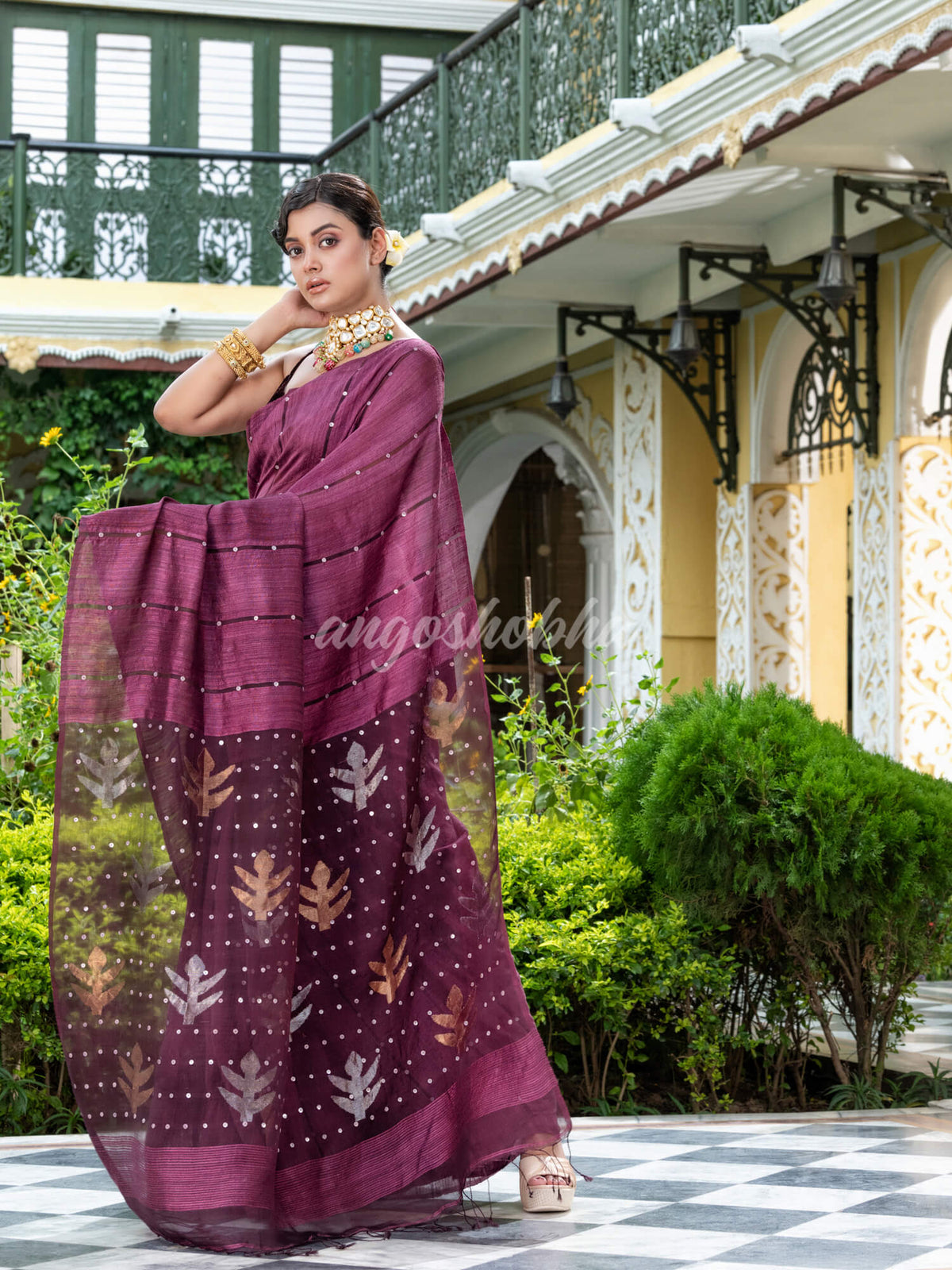 DESCRIPTION: Angoshobha’s ethnic saree comes with an unstitched blouse piece, which can be stitched according to your taste and preference. This Purple Colour sequins matka silk saree is crafted by skilled craftsmen using high quality matka silk fabric without compromising on its quality.This saree is concocted with latest design on the pallu over the body the sequins are spreading out. Saree is very comfortable in summer and suitable for festivals .With this beautiful sequins design and fabric, this saree and blouse set will fetch you Oodles of compliments and praises.